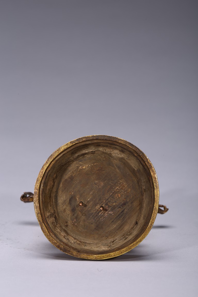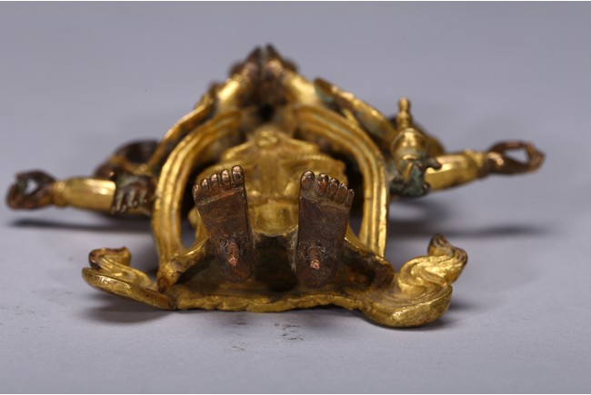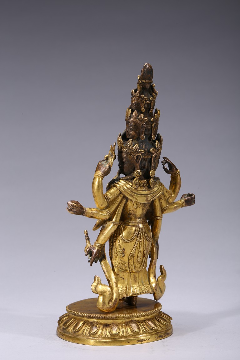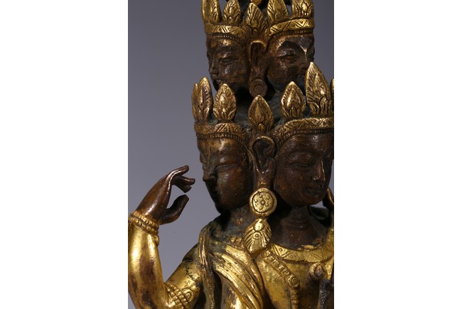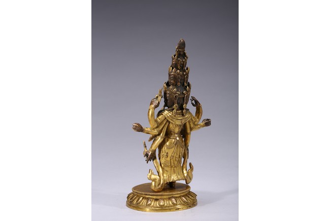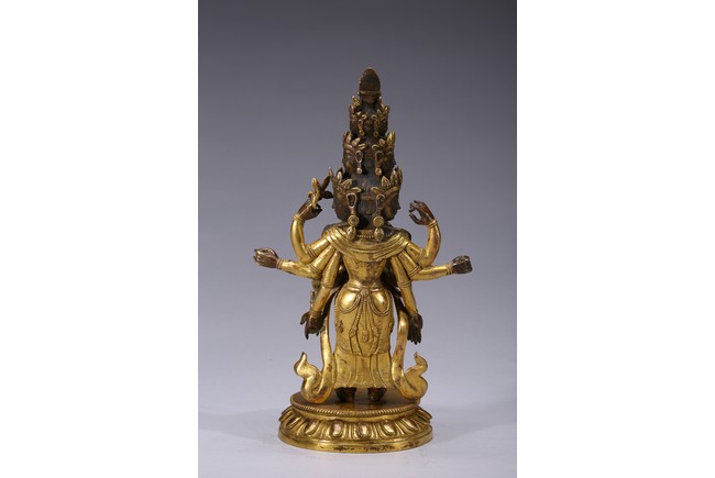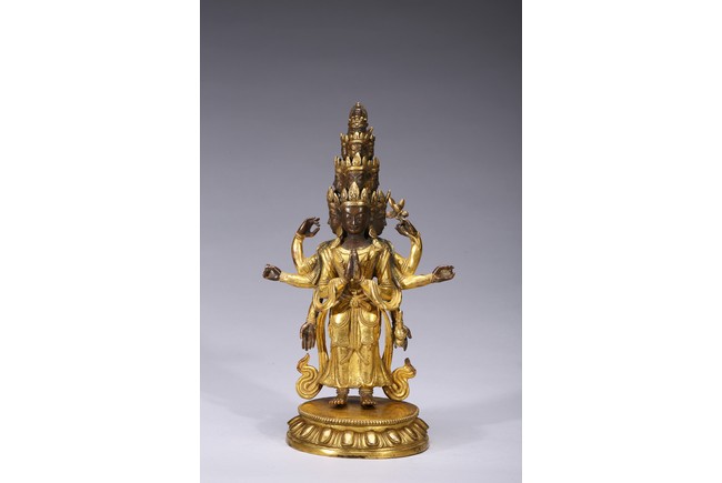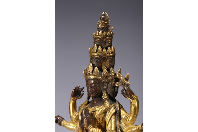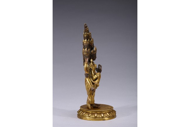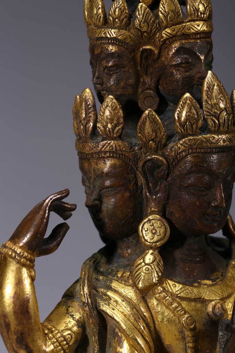 The bodhisattva is shown standing upon a lotus throne, with primary hands clasped together and six arms extending out, wearing robe with incised hem and billowing scarves around arms and shoulder, with eleven faces each framed with pointed crown. Qing Dynasty period.