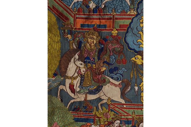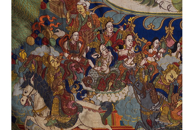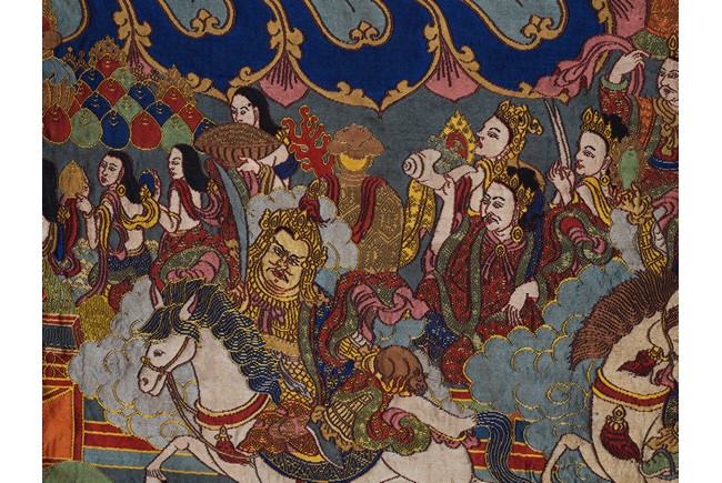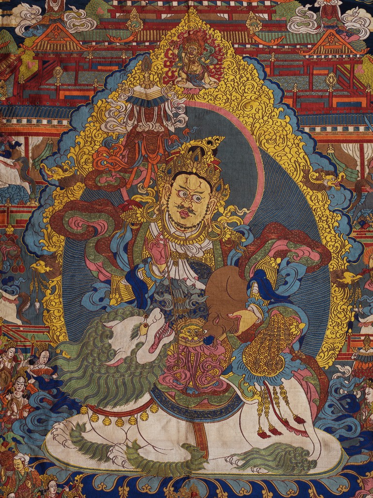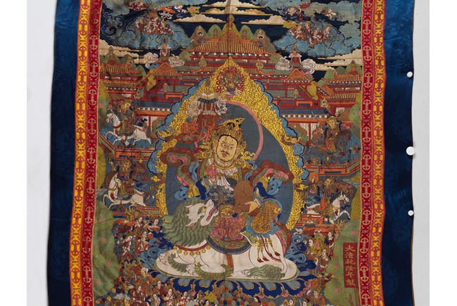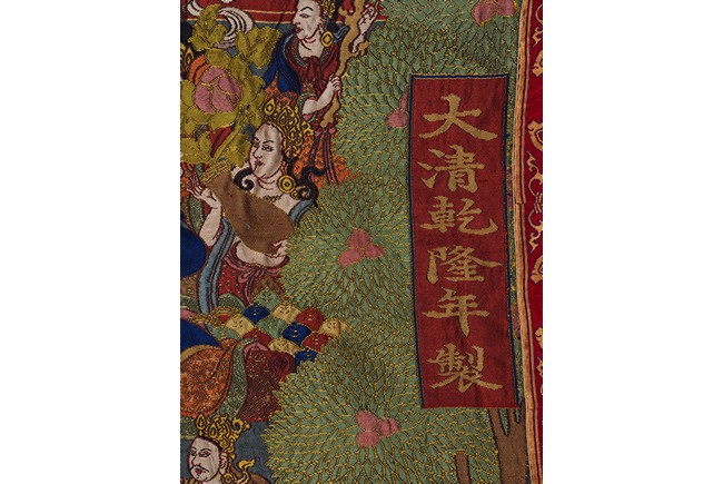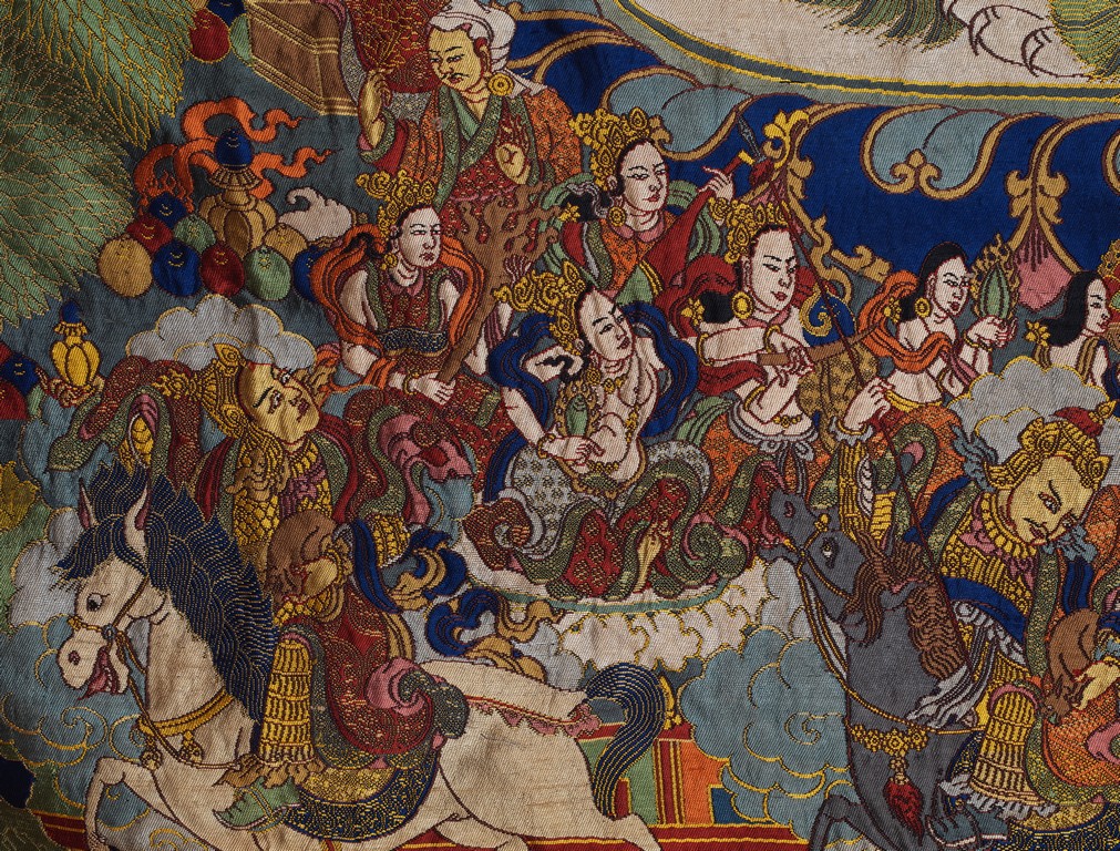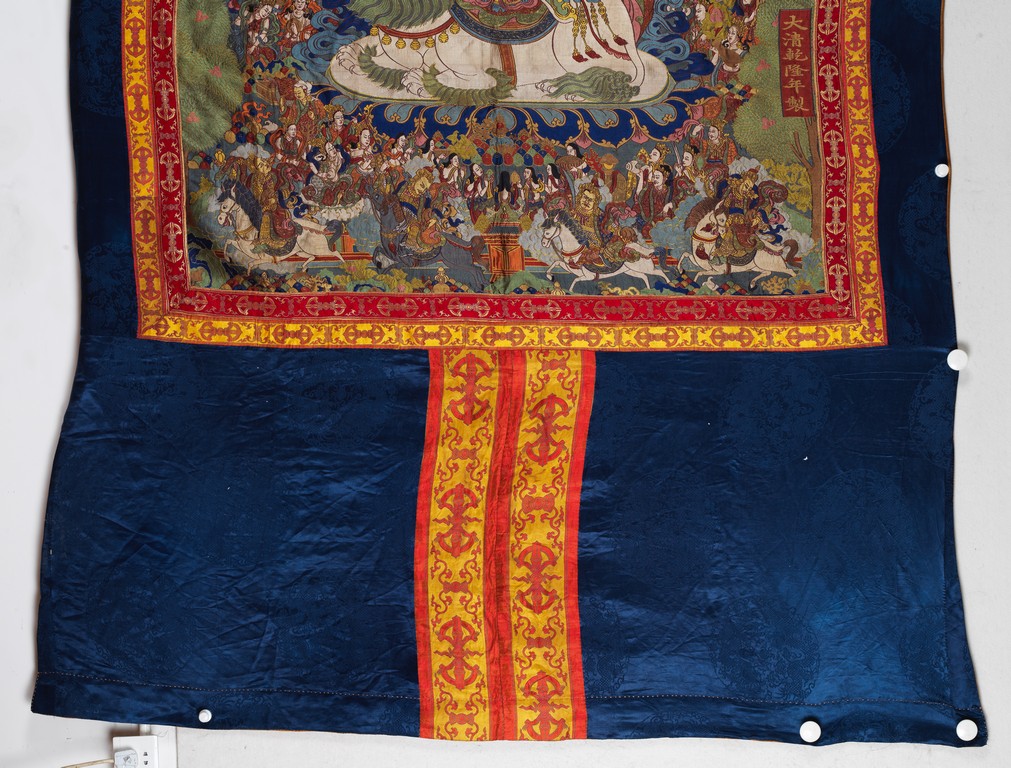 Finely woven with various tones to depict the Tibetan bodhisattva seated on a white lion, surrounded by deities and palace to the background. Bottom right inscribed six character Qianlong mark.