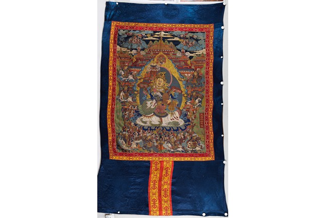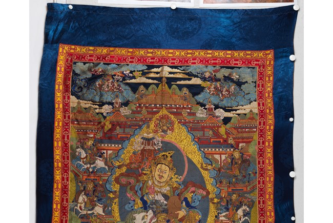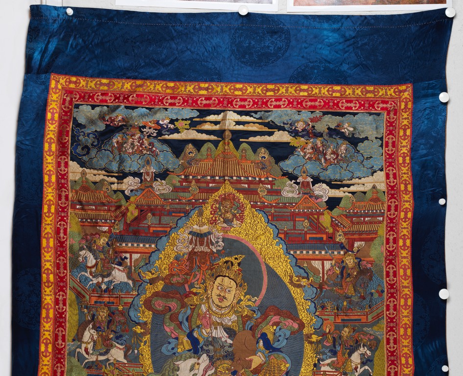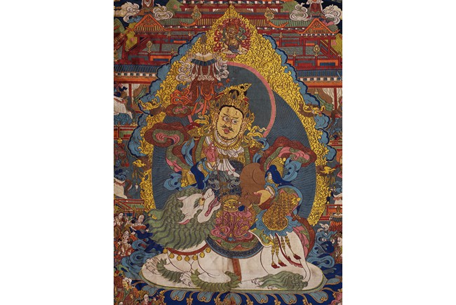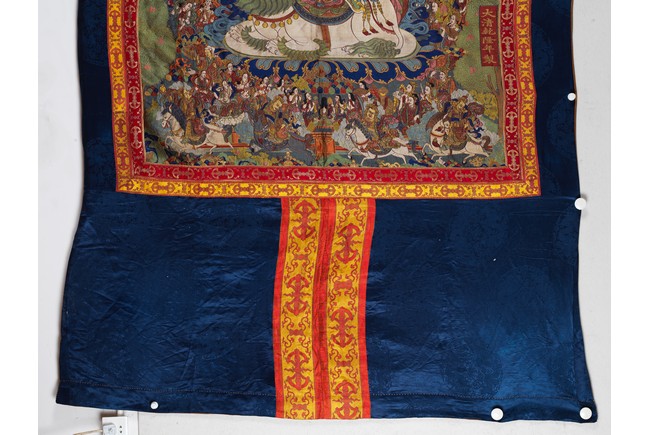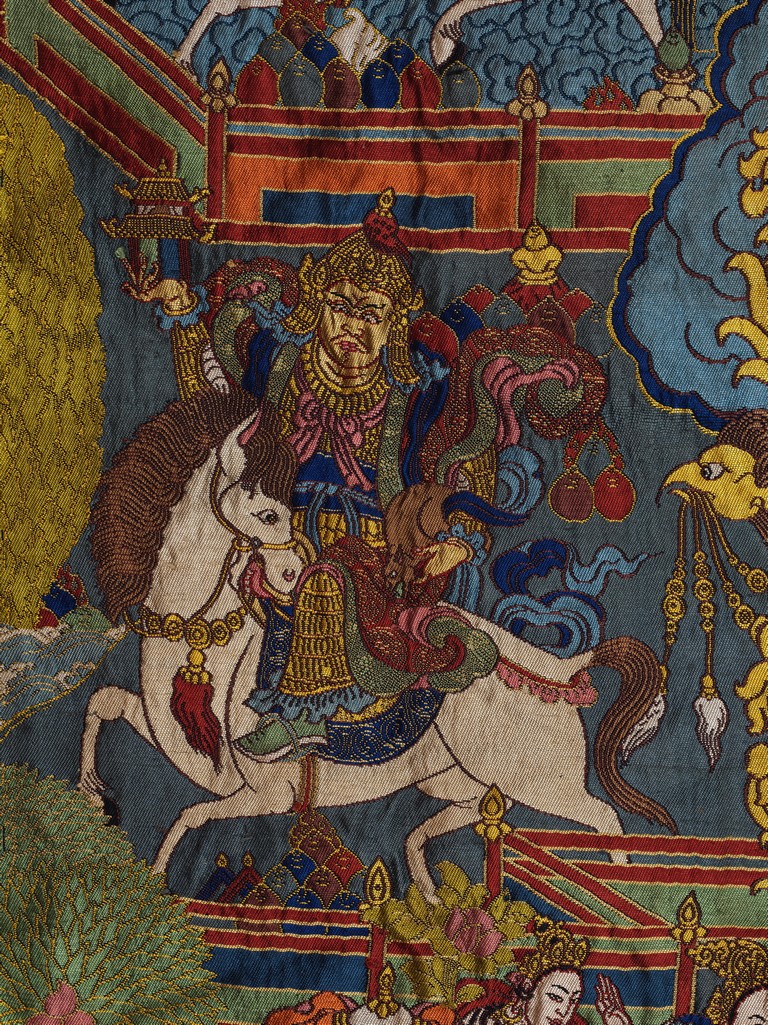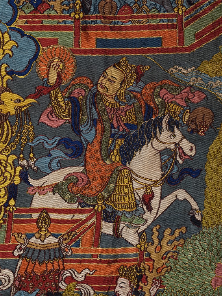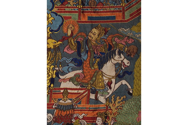 Finely woven with various tones to depict the Tibetan bodhisattva seated on a white lion, surrounded by deities and palace to the background. Bottom right inscribed six character Qianlong mark.