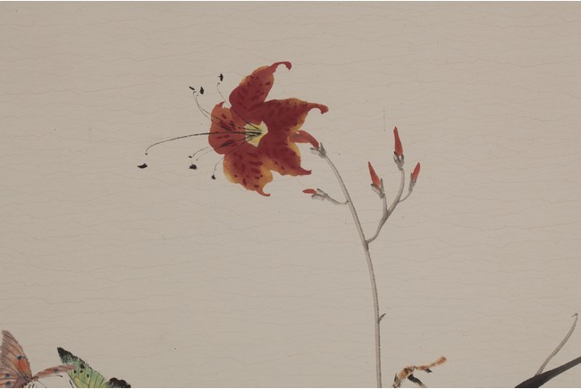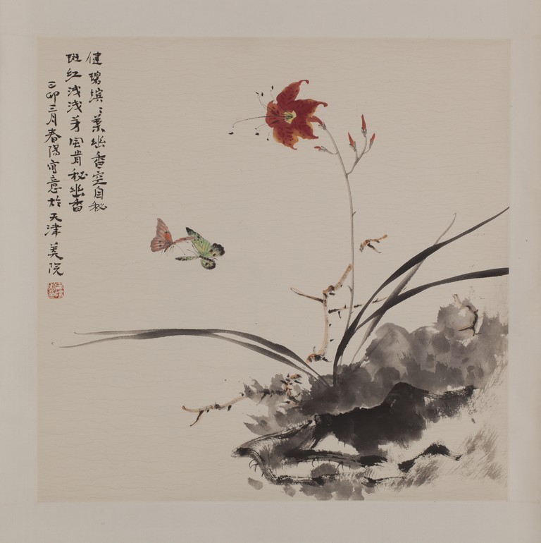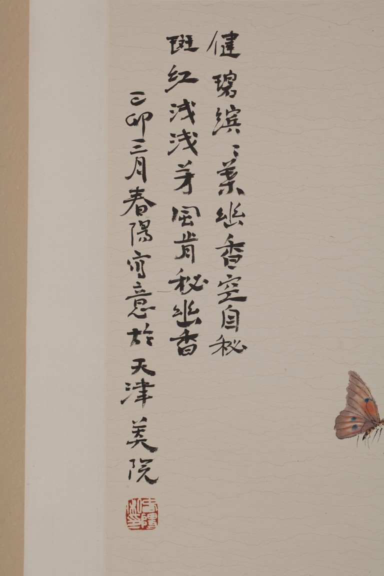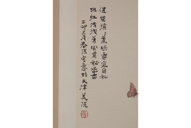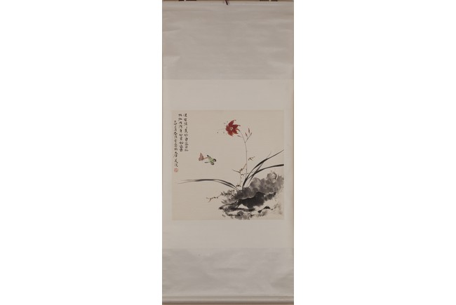 Color and ink on paper, flower and butterfly, hanging scroll, inscribed and signed, with one seal mark.