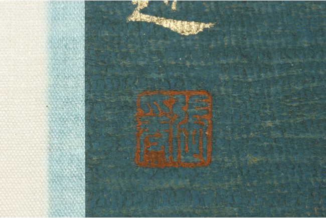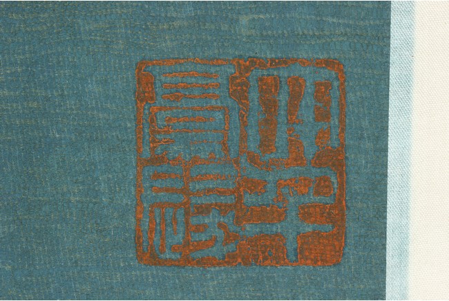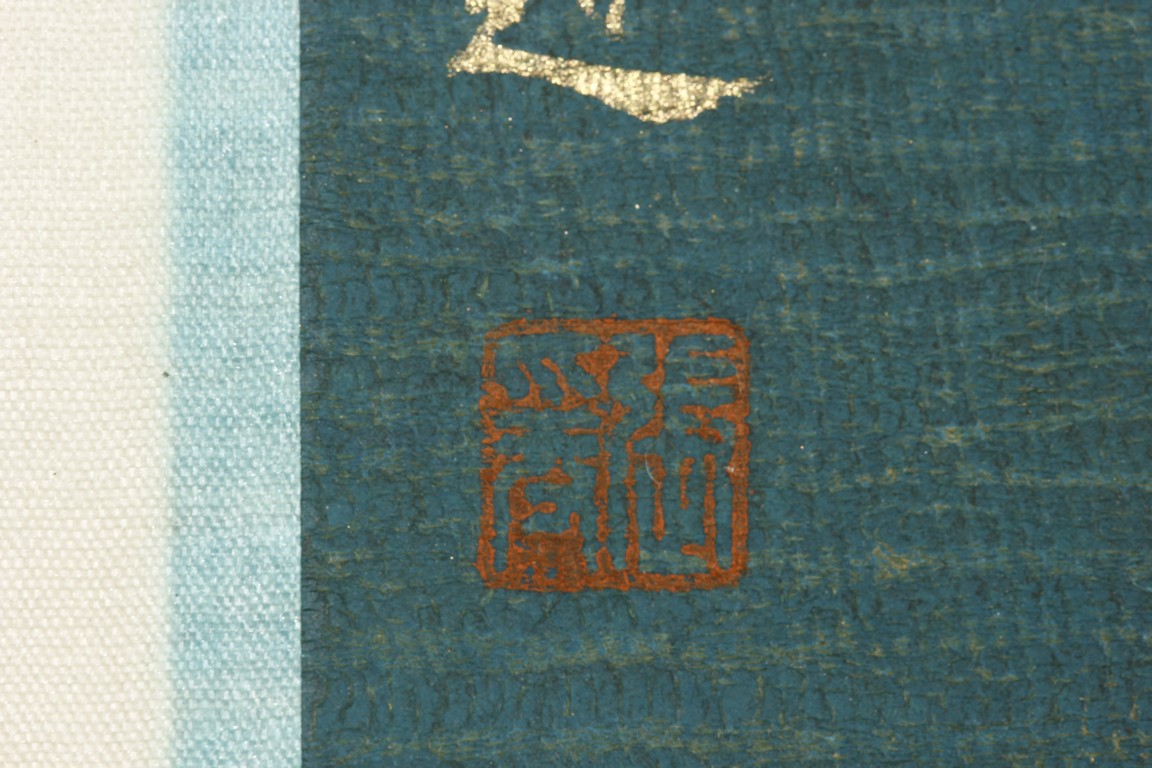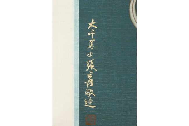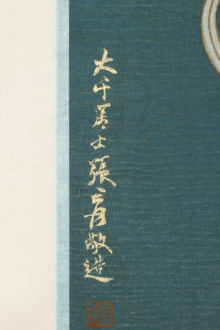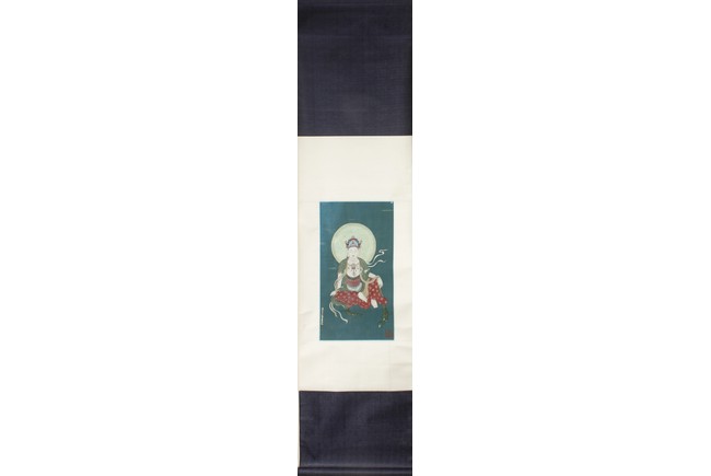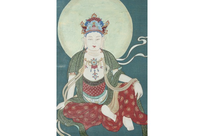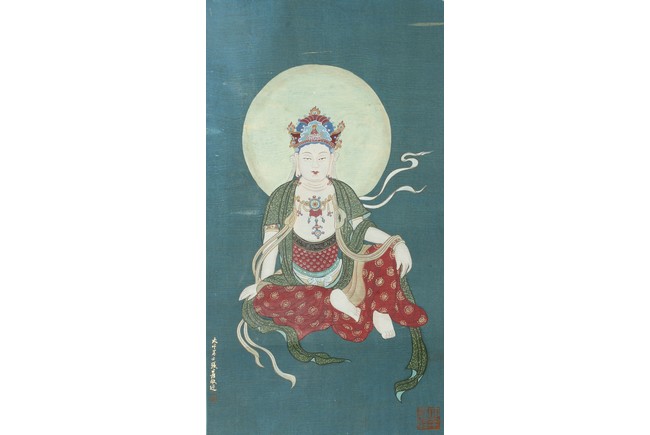 This painting depicts Guanyin sitting at ease with left hand resting on left bent knee and and right hand on the ground. She wears a loose robe revealing her adorned necklace. Artist's inscription and seals on bottom left and right. Attributed to Zhang Daqian.