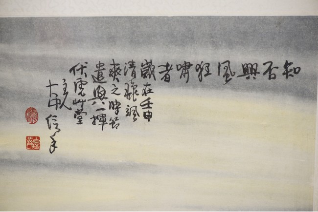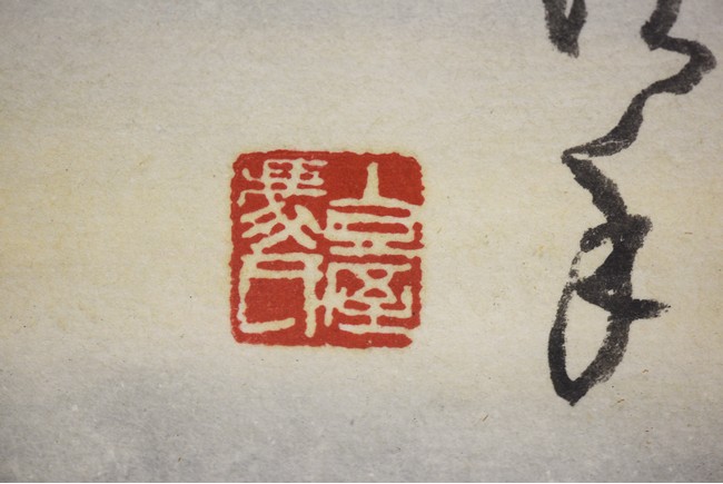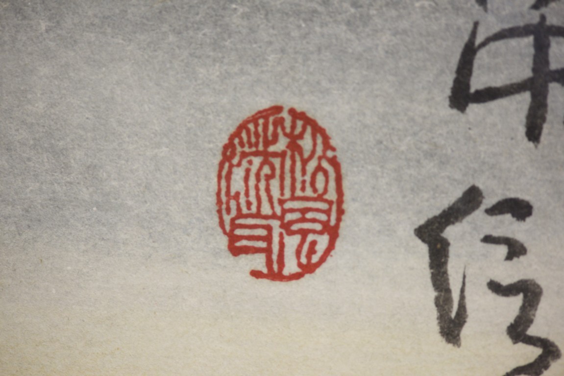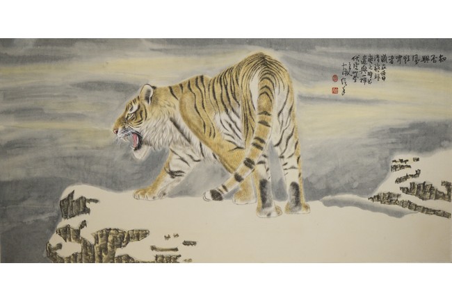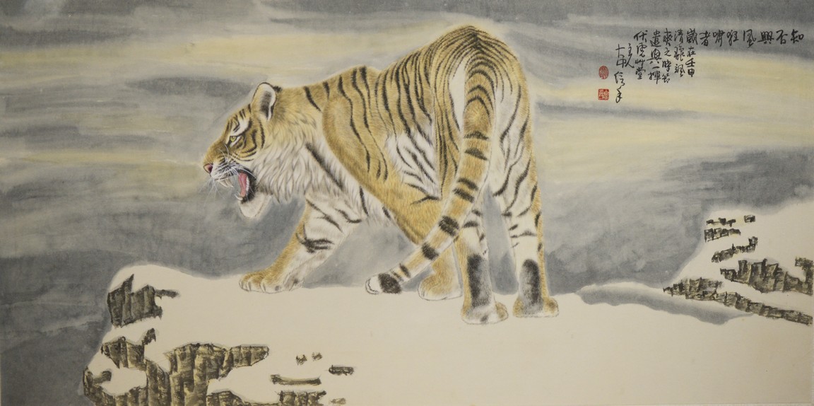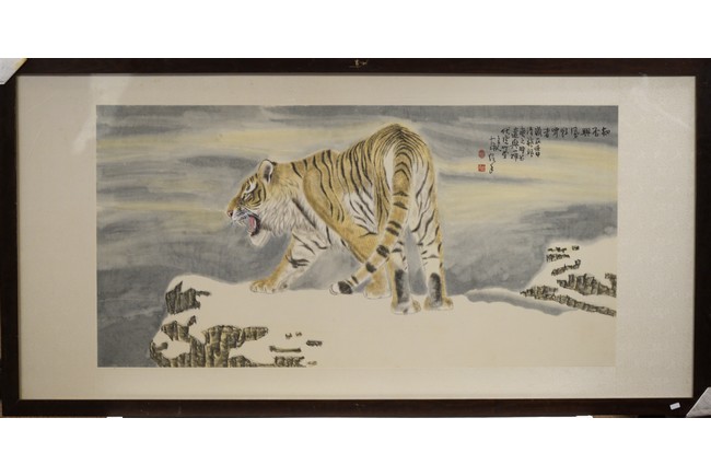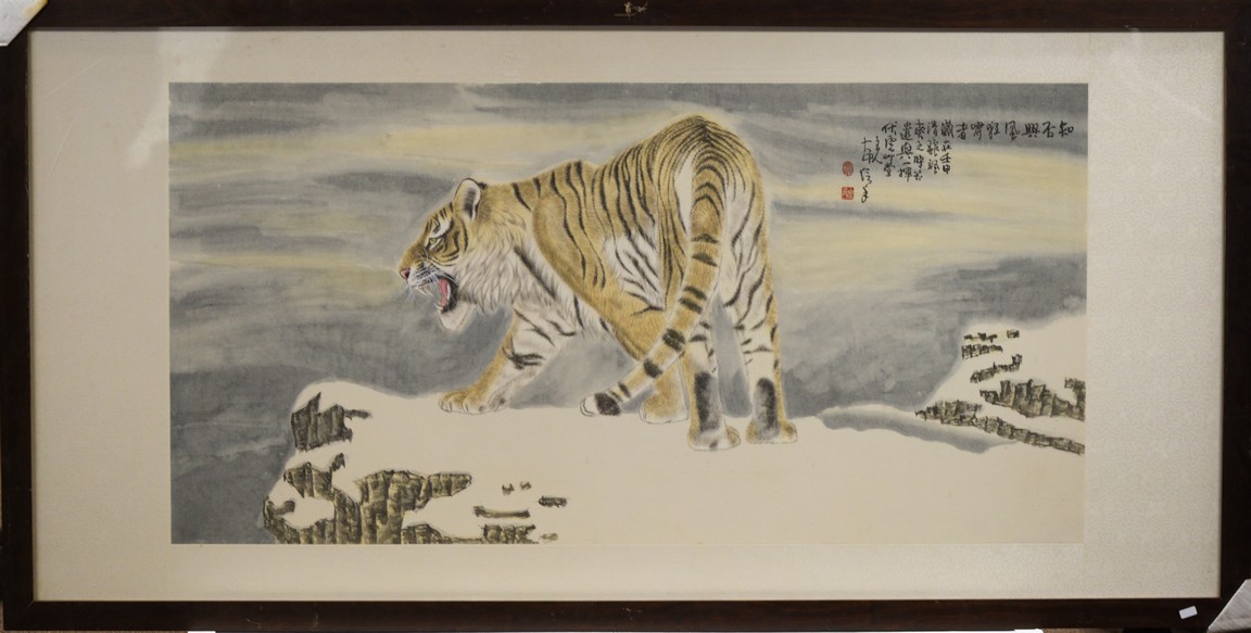 Color and ink on paper, tiger, framed, inscribed and signed, with two seal marks.