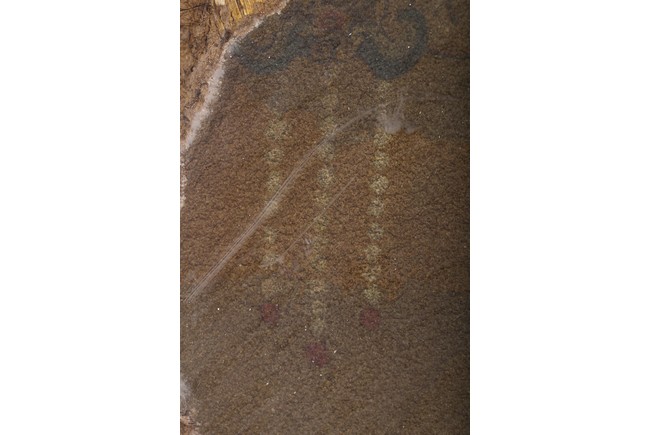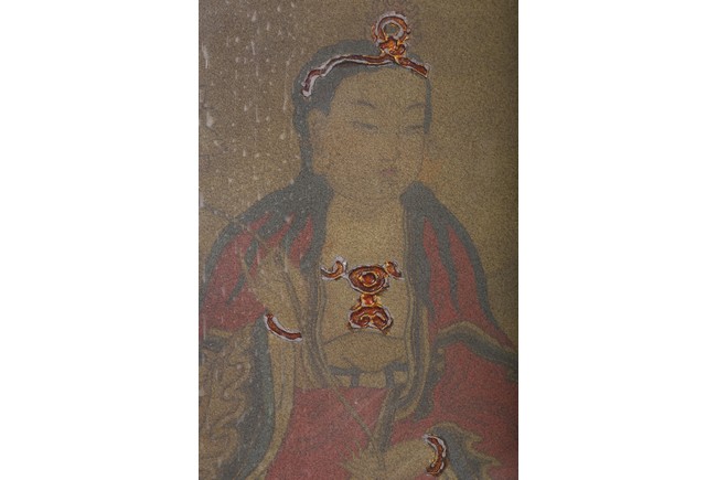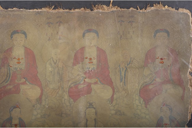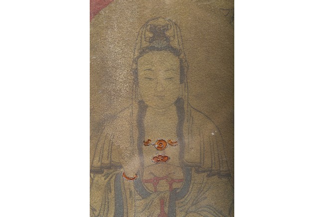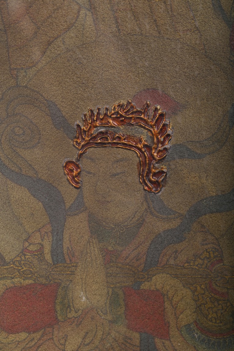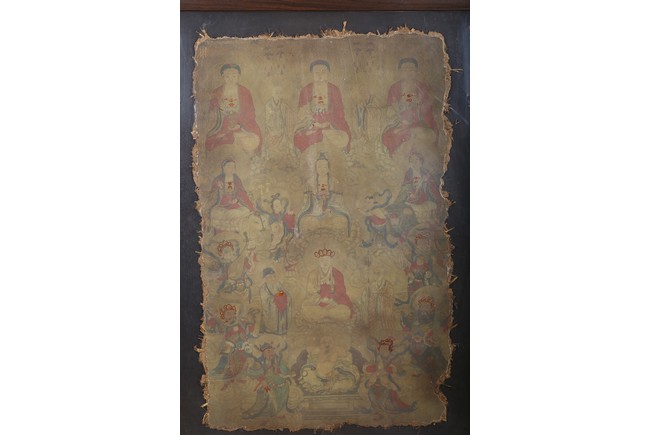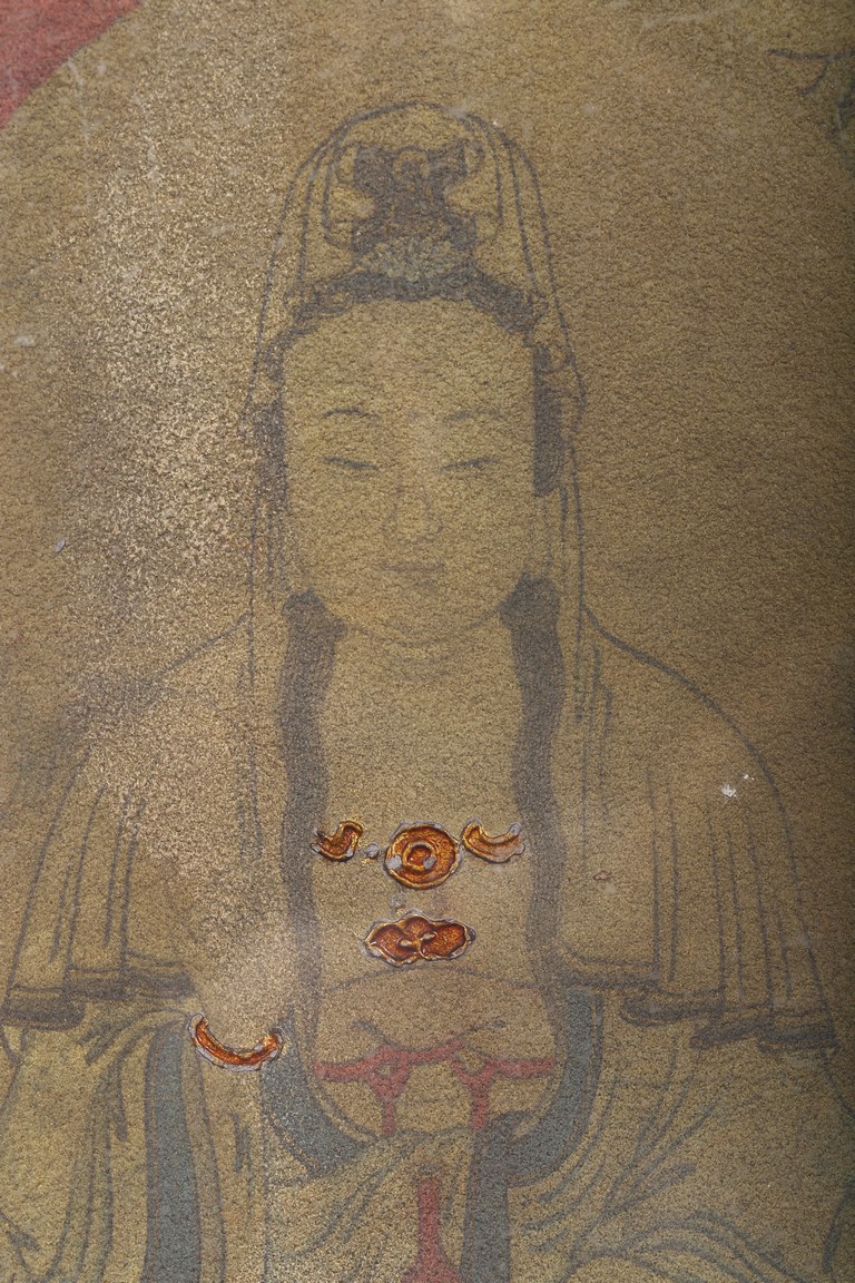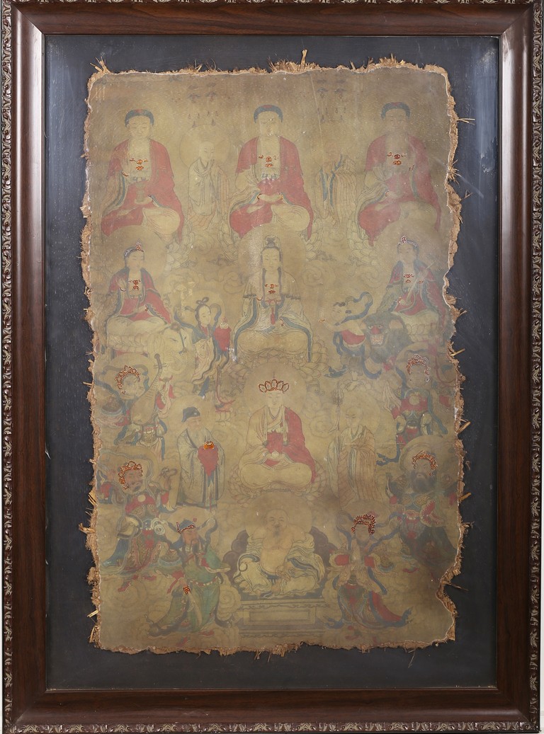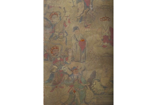 The wall fragment finely painted with Guanyin bodhisattva seated at the center, flanked by two young attendants, below the three bodhisattva above, with a monk figure and budai positioned below, surrounded by Guan Yu and Taoist deity. Ming Dynasty period.