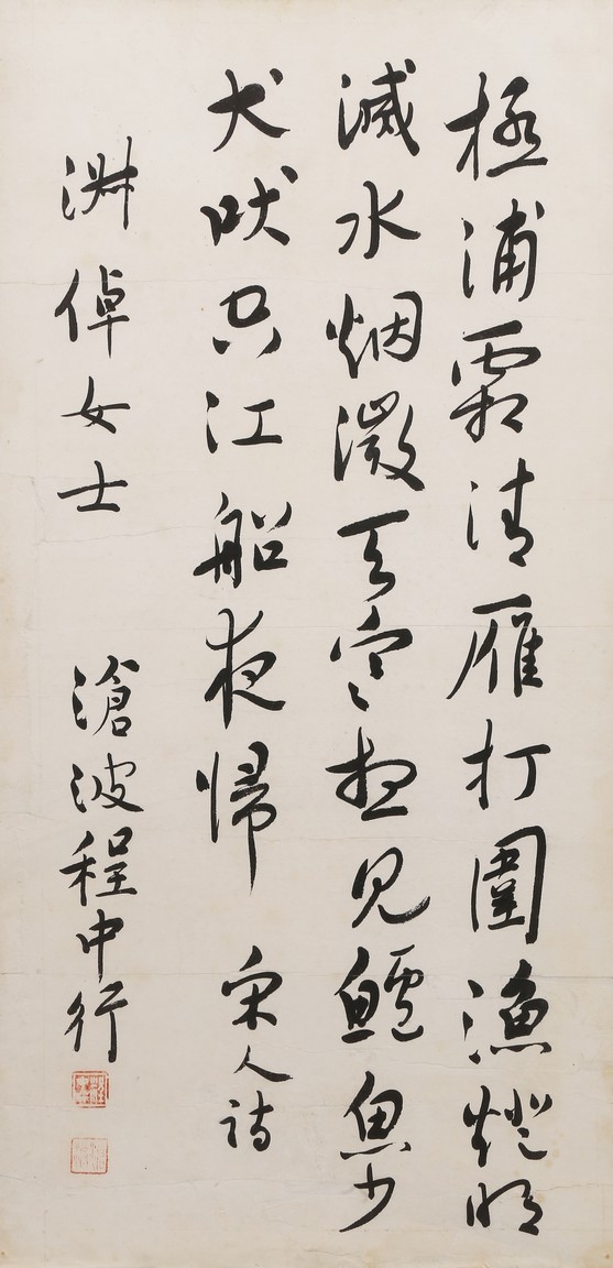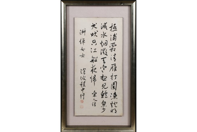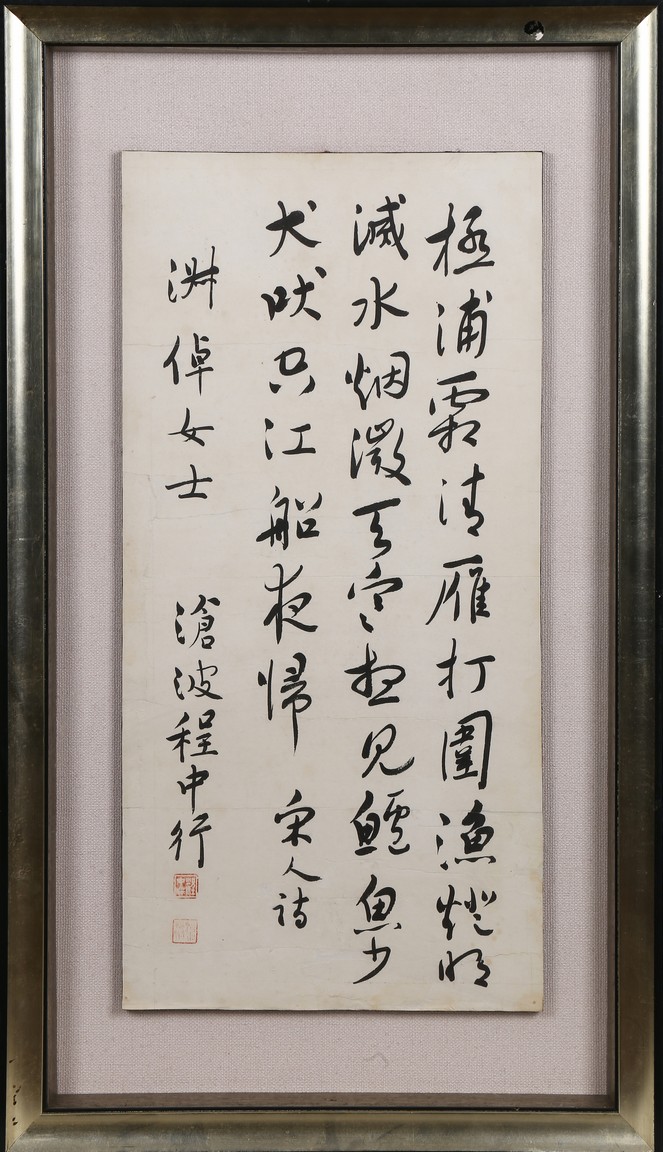 Ink on paper. Running script calligraphy. Framed. Signed Cheng Zhongxing and with a dedication, with two seals of the artist.