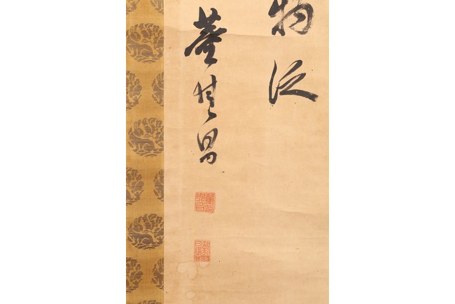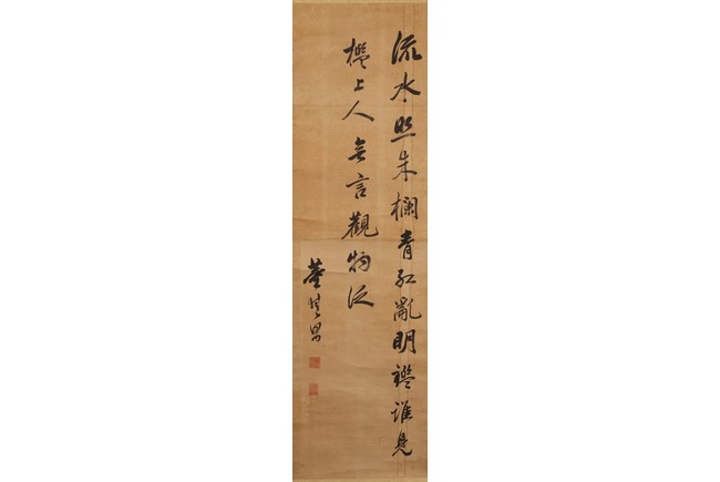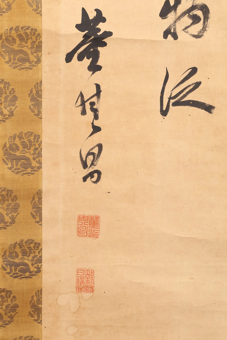 Ink on paper. Running script calligraphy. Hanging scroll. Inscribed and signed Dong Qi Chang,with two seals of the artist.