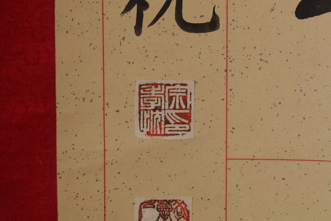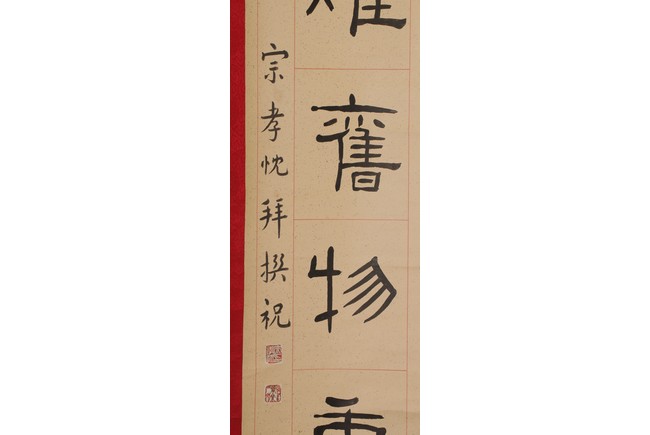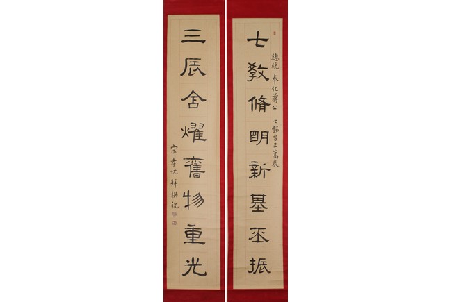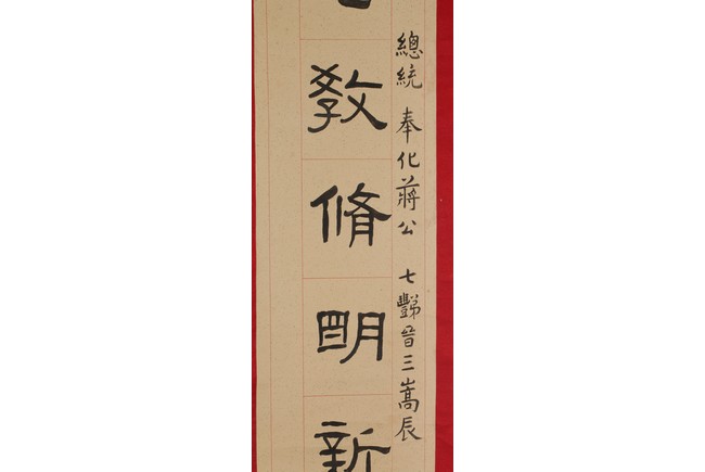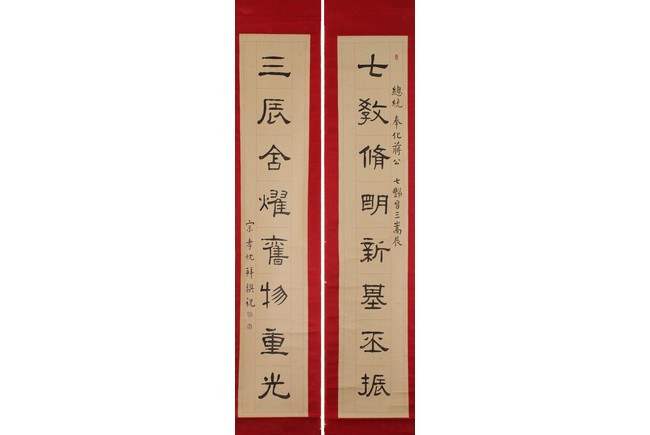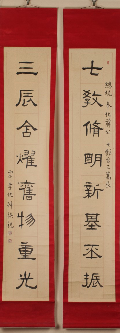 Ink on paper. Calligraphy Couplet dedicated to Chiang Kai-shek. With three seals of the artist.