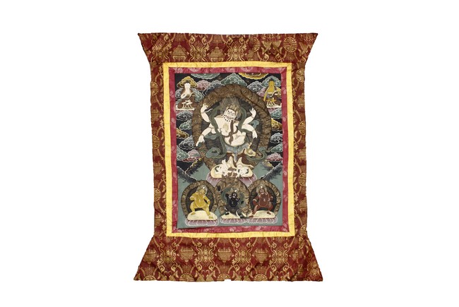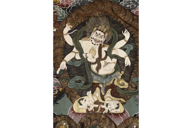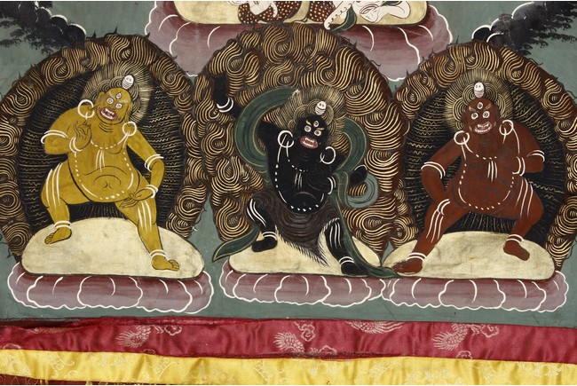 This Thangka depicts that Mahakala standing on two elephants, in front of a mandorla. On the upper left and right corner, painted two buddhas sitting in the colorful clouds. Below the Mahakala, framed three immortals standing in a row.