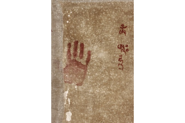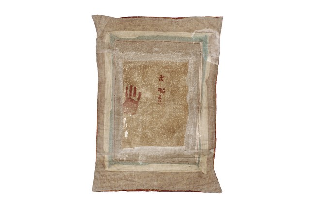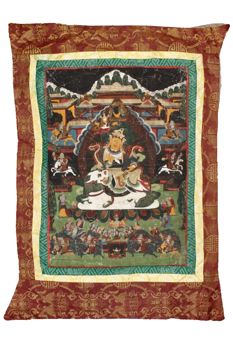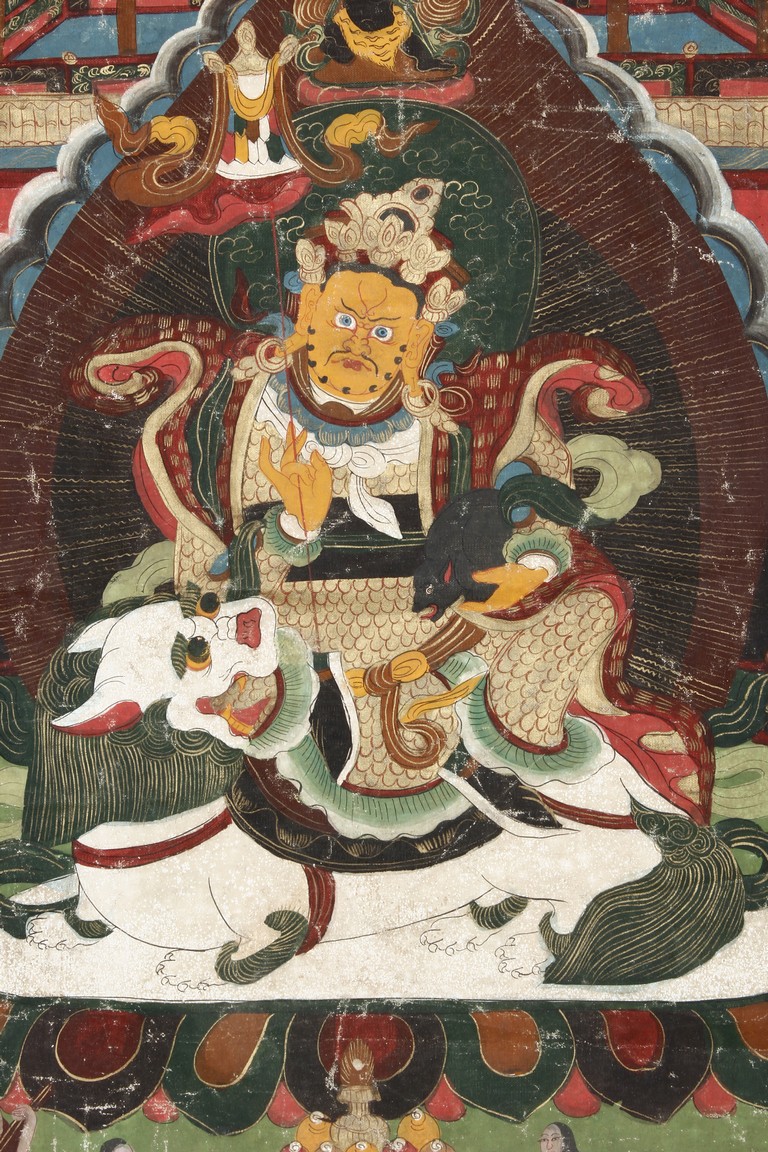 In the centre of this Thangka, the Lion Zambala riding on a white lion, in front of a mandorla. Painted imposing pavilions and four immortals riding horses on the upside. On the bottom, designed with a group of immortals.