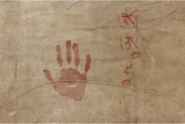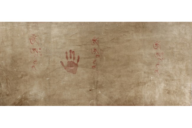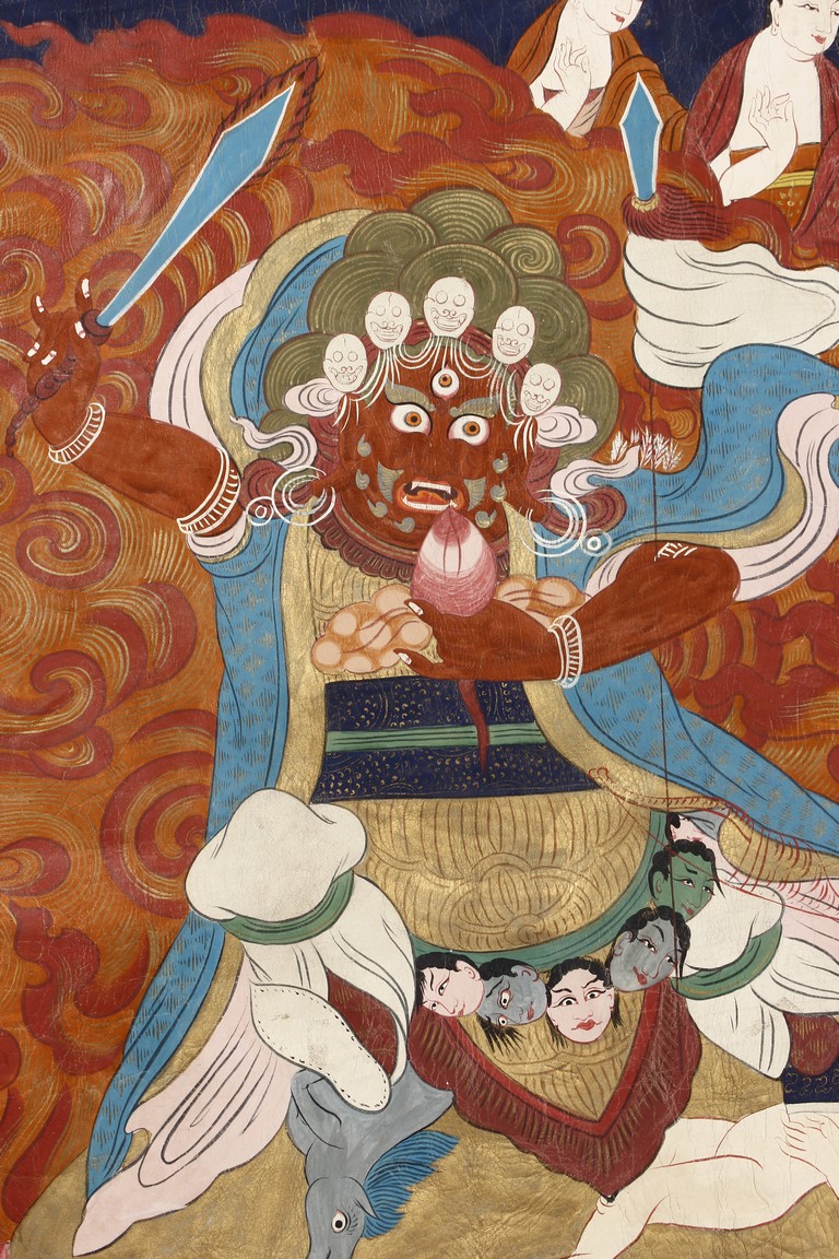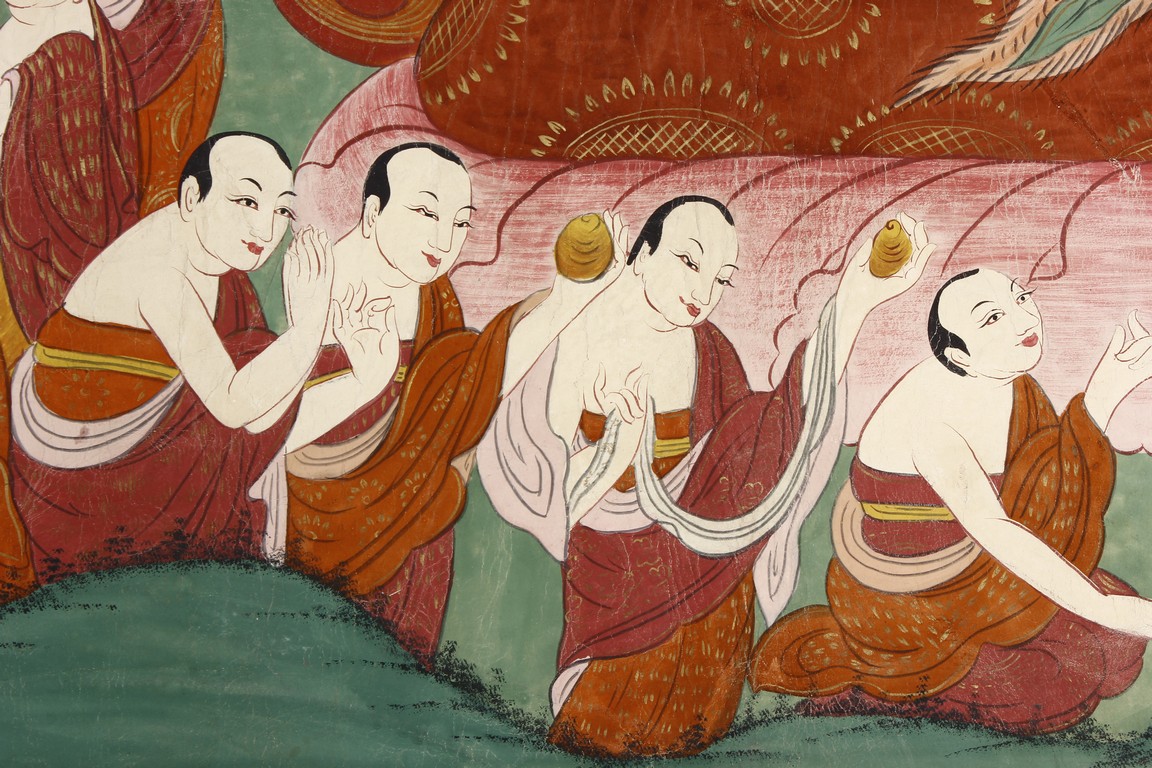 Of horizontal rectangle shape, painted three immortals in a row. The left one is begtse, the middle one is Shakyamuni, the right one is Vajrapani. They are all supported by a group of monks.