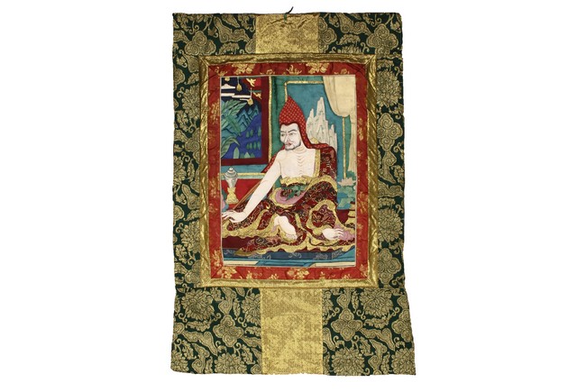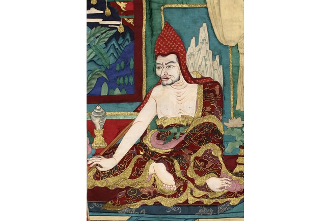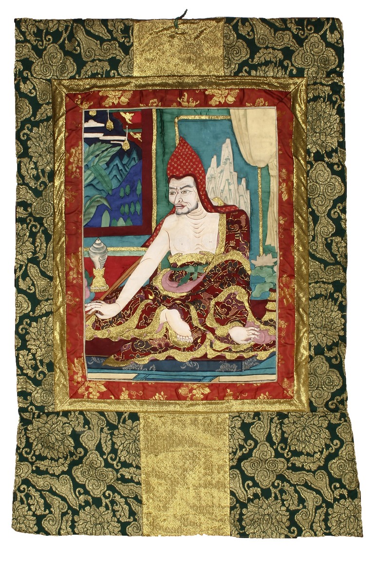 This Thangka depicts the Tsongkhapa sitting on a navy blue carpet, in peacock blue painted room, with paintings hanging on the wall. He is wearing a ornate embroidery red rob reveals his right shoulder.