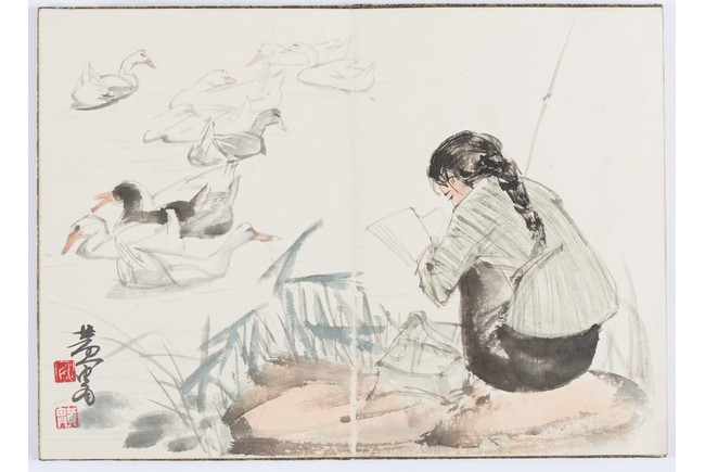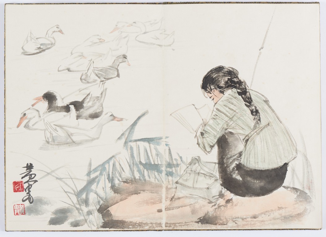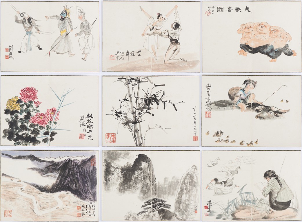 Color and ink on paper. Various subjects. Album of Nine Leaves. Artists include Guan Liang, Huang Yongyu, Lou Shibai, Chen Shifa, Dong Shouping, Lu Yanshao, Ya Ming, Huang Zhou. All signed and with one to two seal marks.