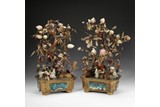 A PAIR OF JADE AND HARDSTONE TREES IN GILT-METAL ENAMEL JARDINIERES