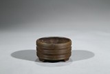 A BRONZE CYLINDRICAL TRIPOD CENSER