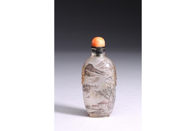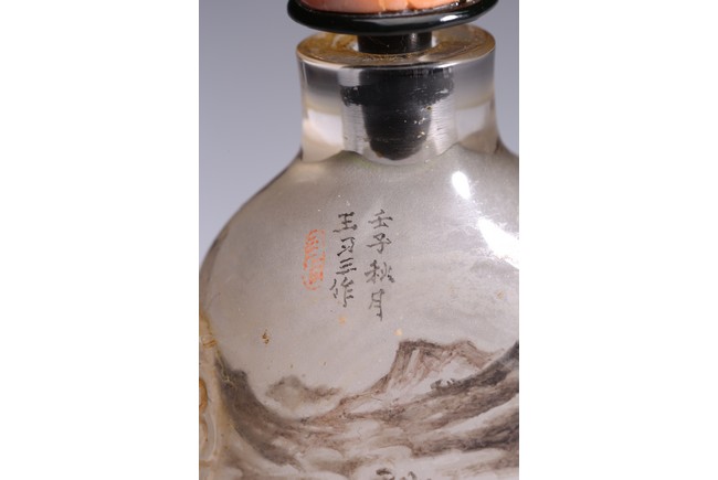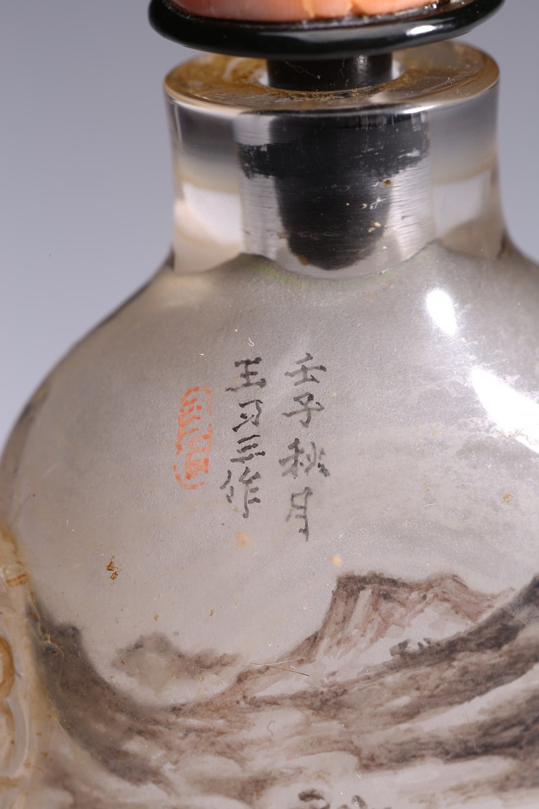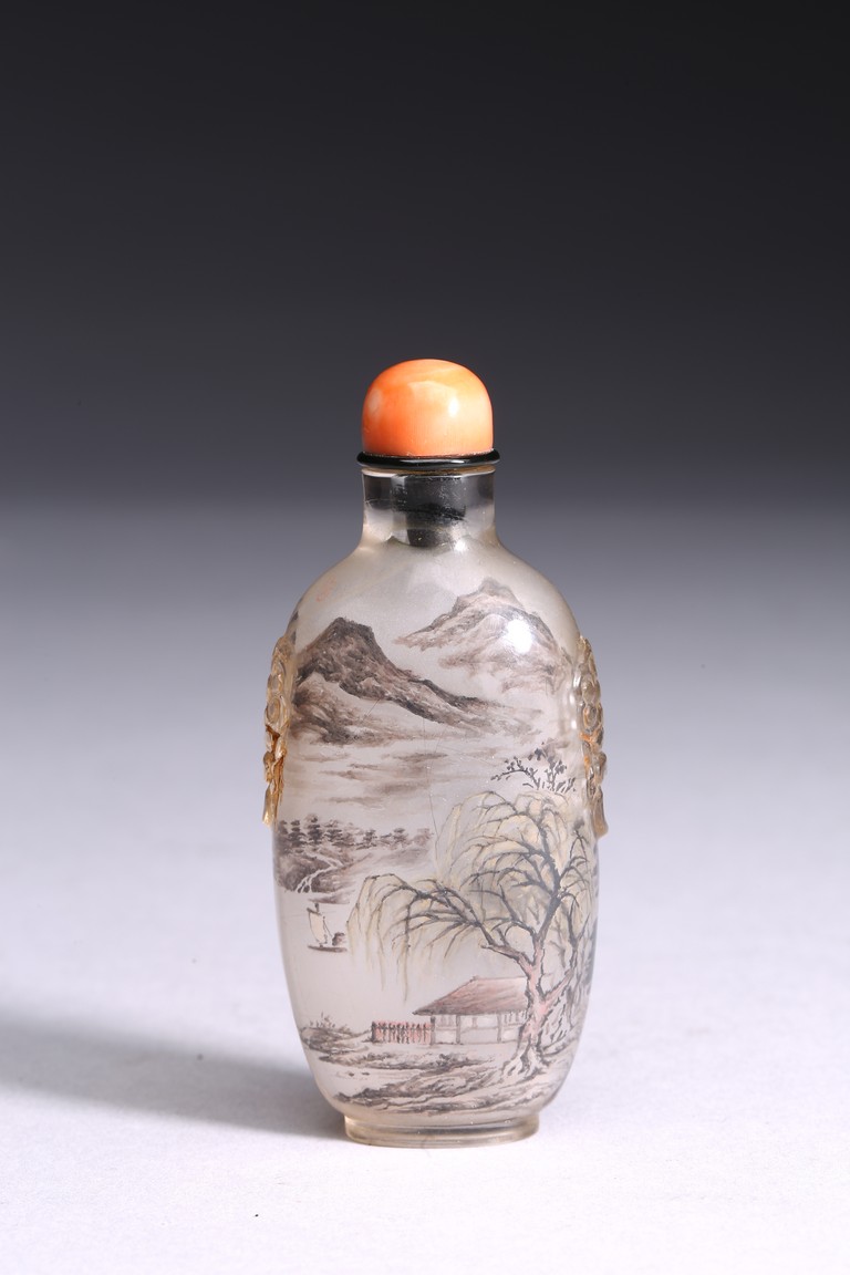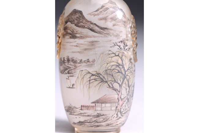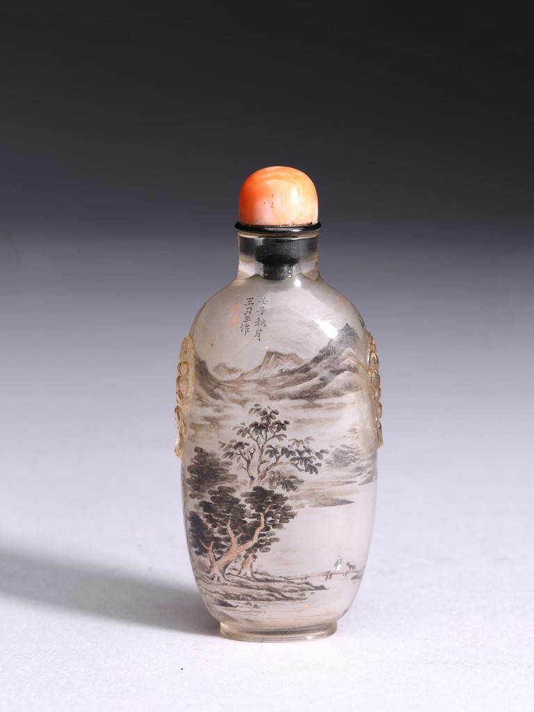 Dated to the year of 1972 autumn, the elongated ovoid snuff bottle inside painted to depict lakeside village scene with willow trees in the foreground and mountains in the background, the reverse depicts figure with dog standing upon a bridge by the river bank, the top left inscribed and signed Wang Xisan with a seal mark. The sides moulded with raised mythical beast masks. 20th century.