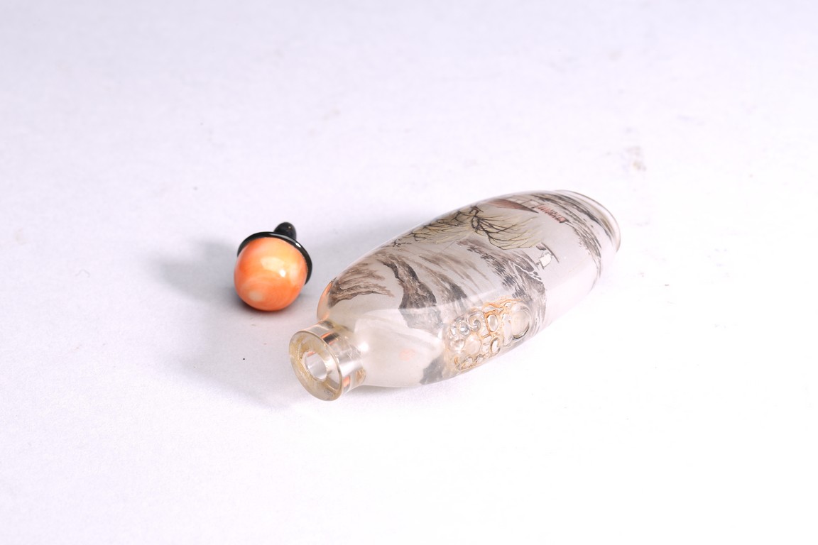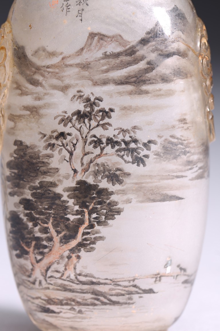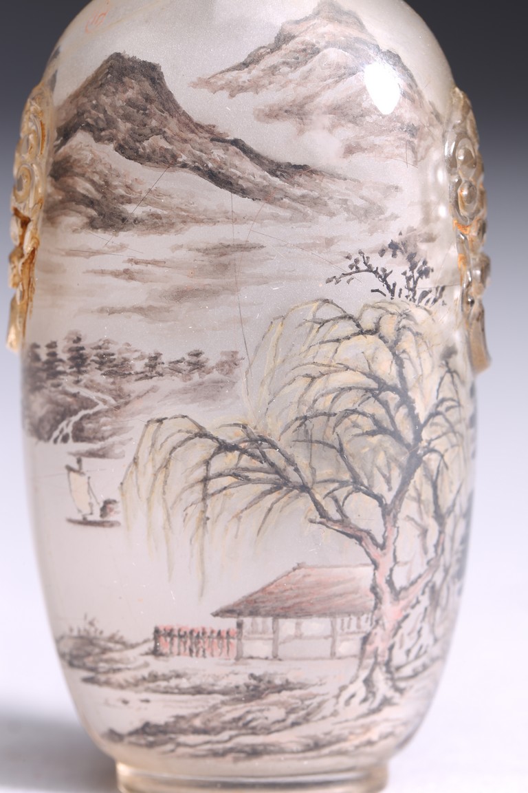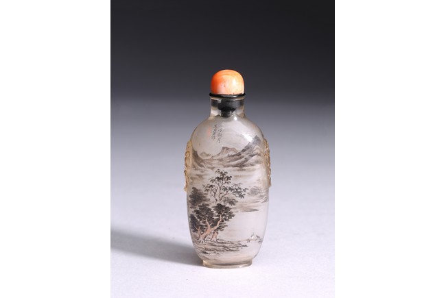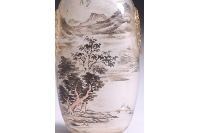 Dated to the year of 1972 autumn, the elongated ovoid snuff bottle inside painted to depict lakeside village scene with willow trees in the foreground and mountains in the background, the reverse depicts figure with dog standing upon a bridge by the river bank, the top left inscribed and signed Wang Xisan with a seal mark. The sides moulded with raised mythical beast masks. 20th century.