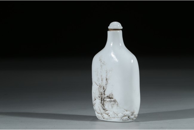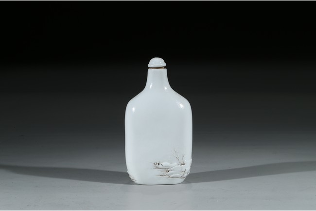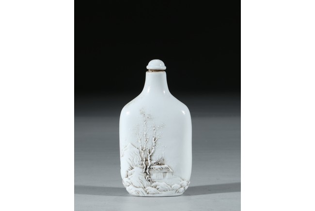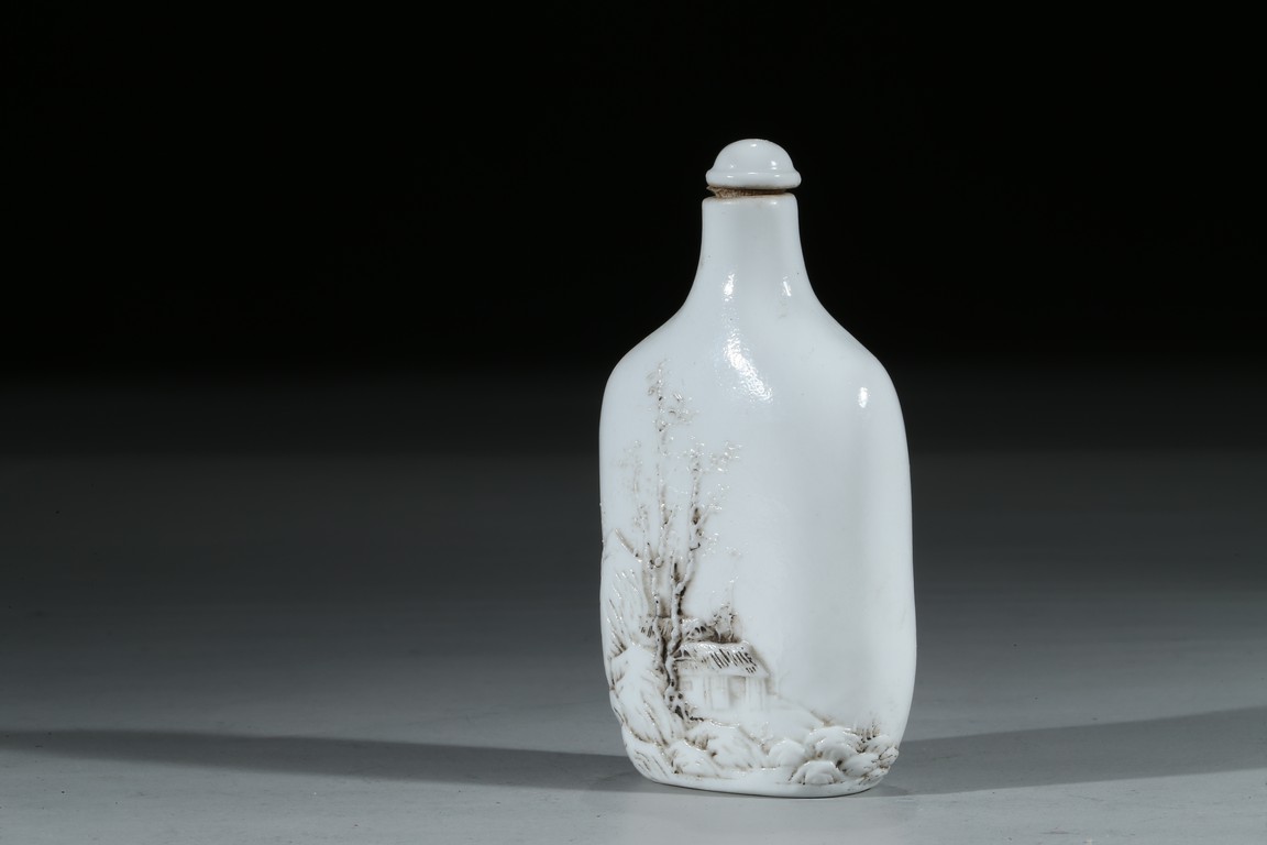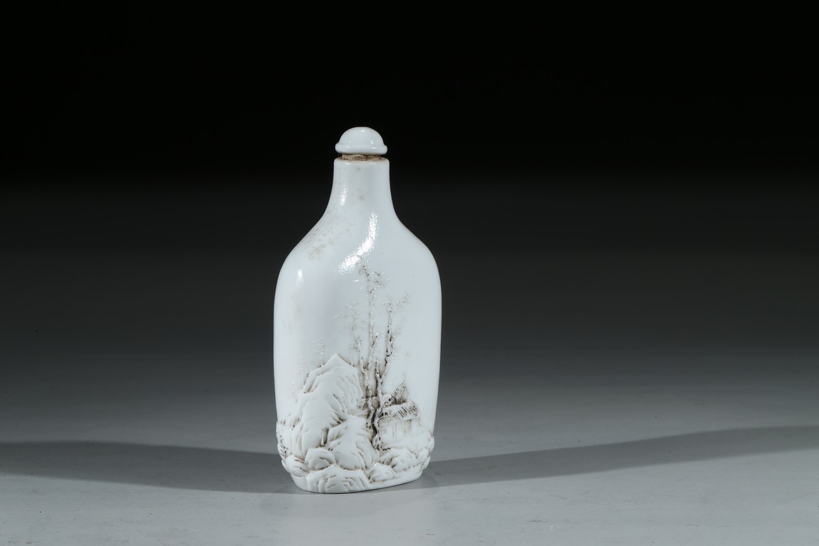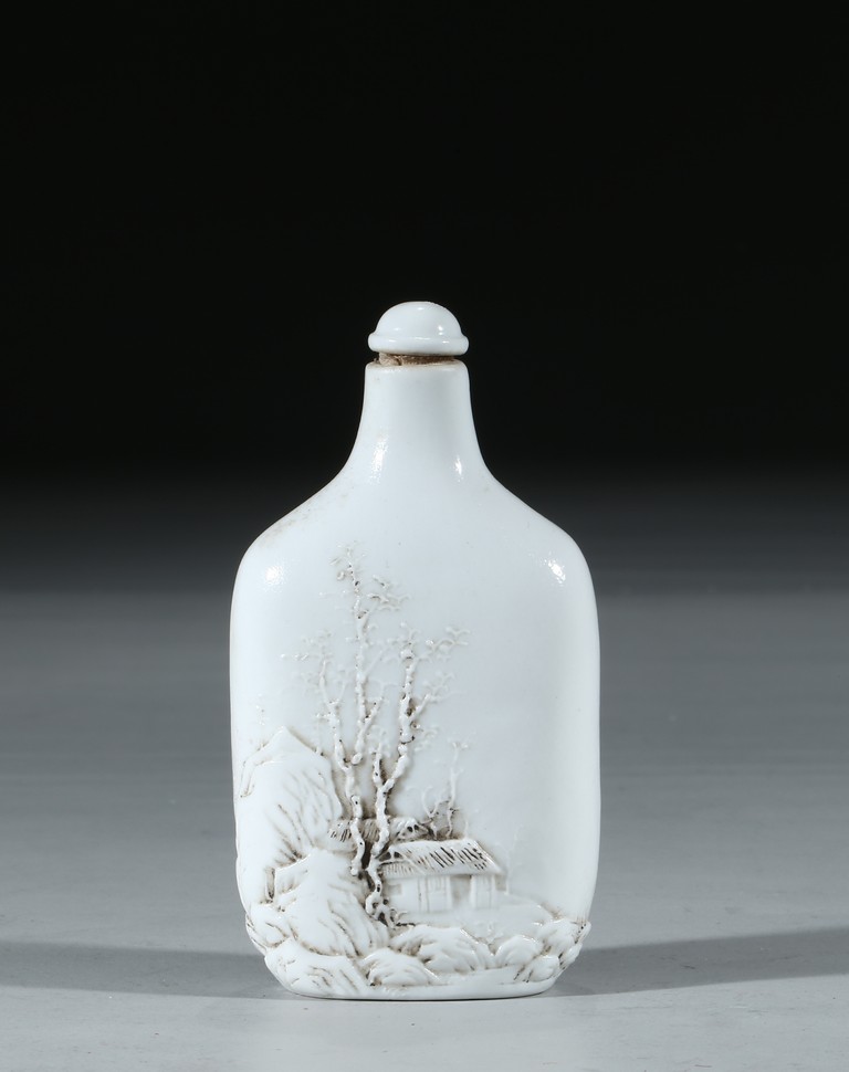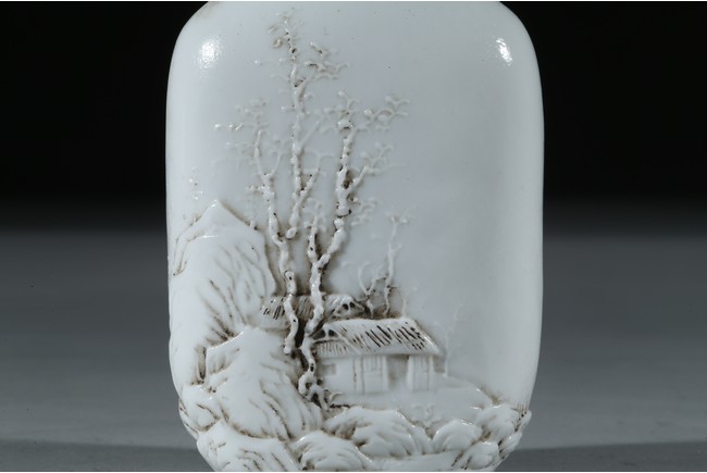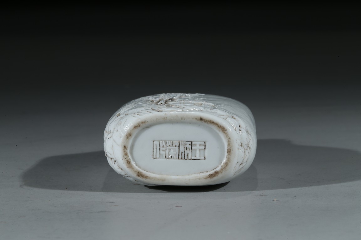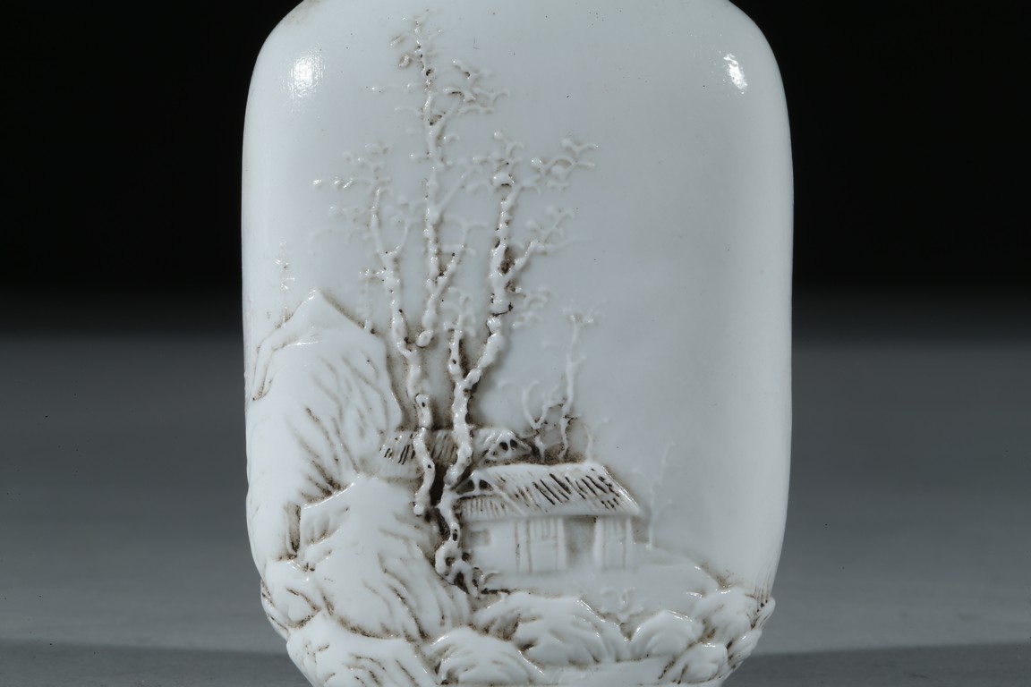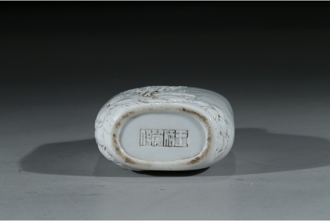 Of flattened rounded rectangular form, body continuously carved in shallow relief with landscape scene, base impressed with four character Wang Bing Rong Zhi. Qing Dynasty period.