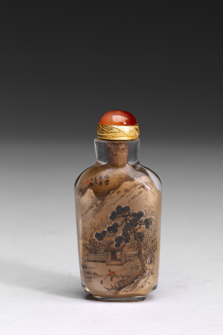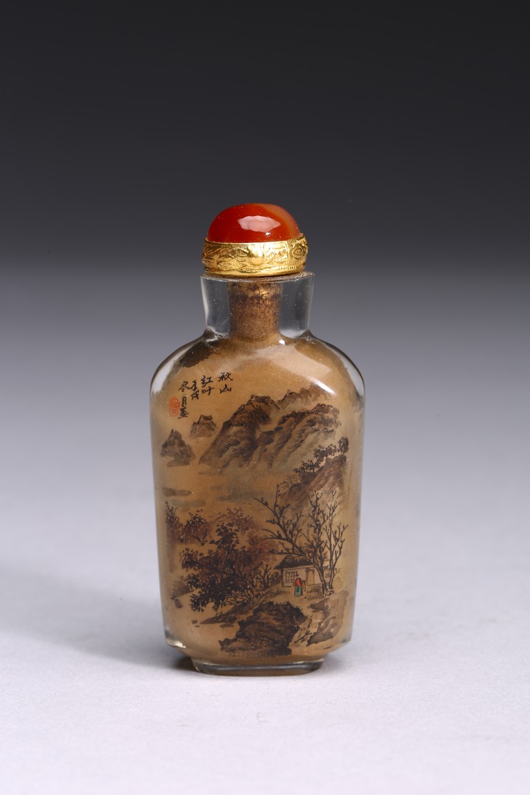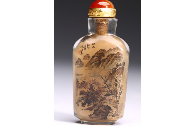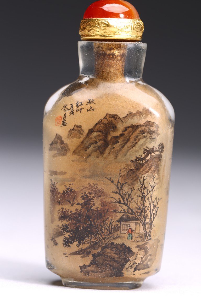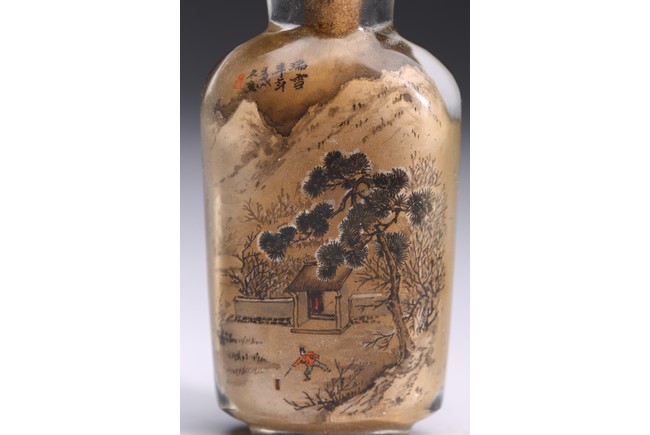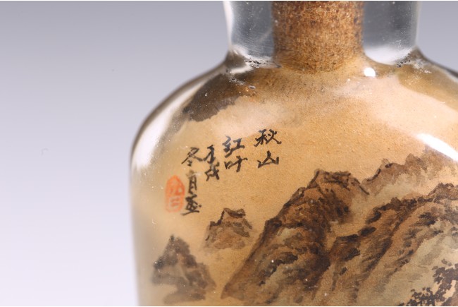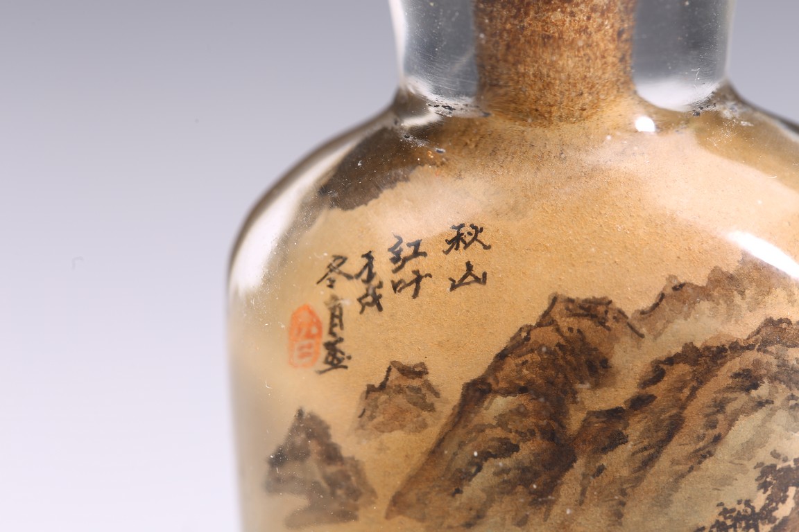 Inside-painted with snowy landscape to the front and autumn mountain to the reverse, inscribed and with one seal mark. Republic period.