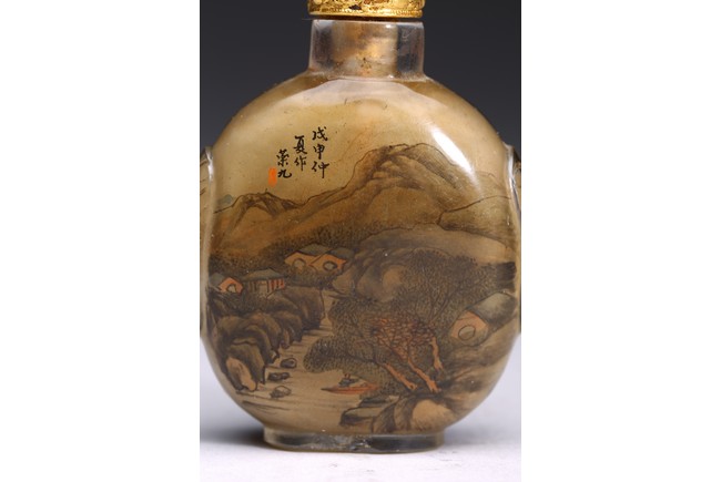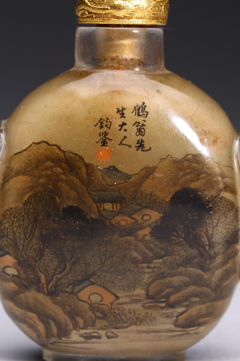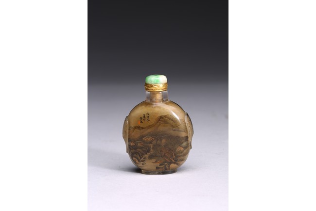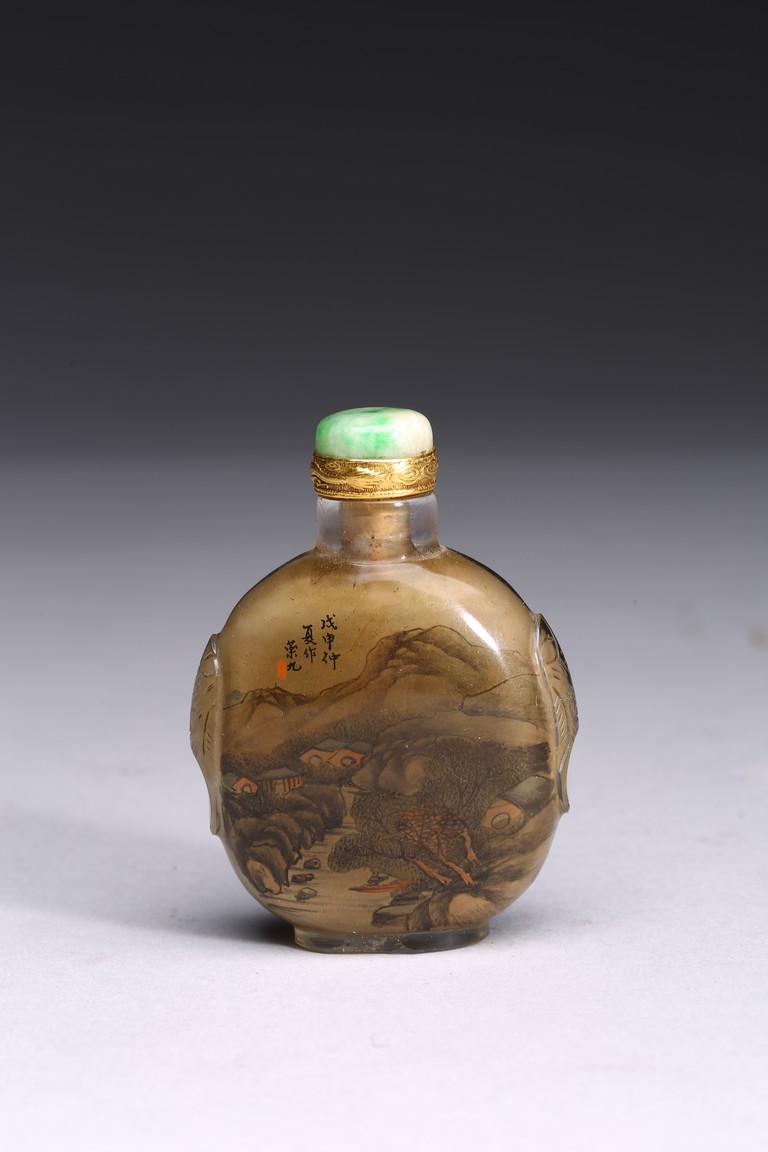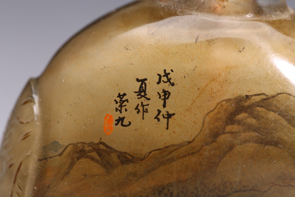 Inside-painted with landscape to the front and reverse, inscribed and signed Rong Jiu attributed to Mr.He Weng, with one seal mark, completed with a jadeite stopper. Republic period.