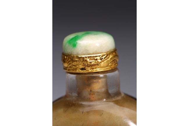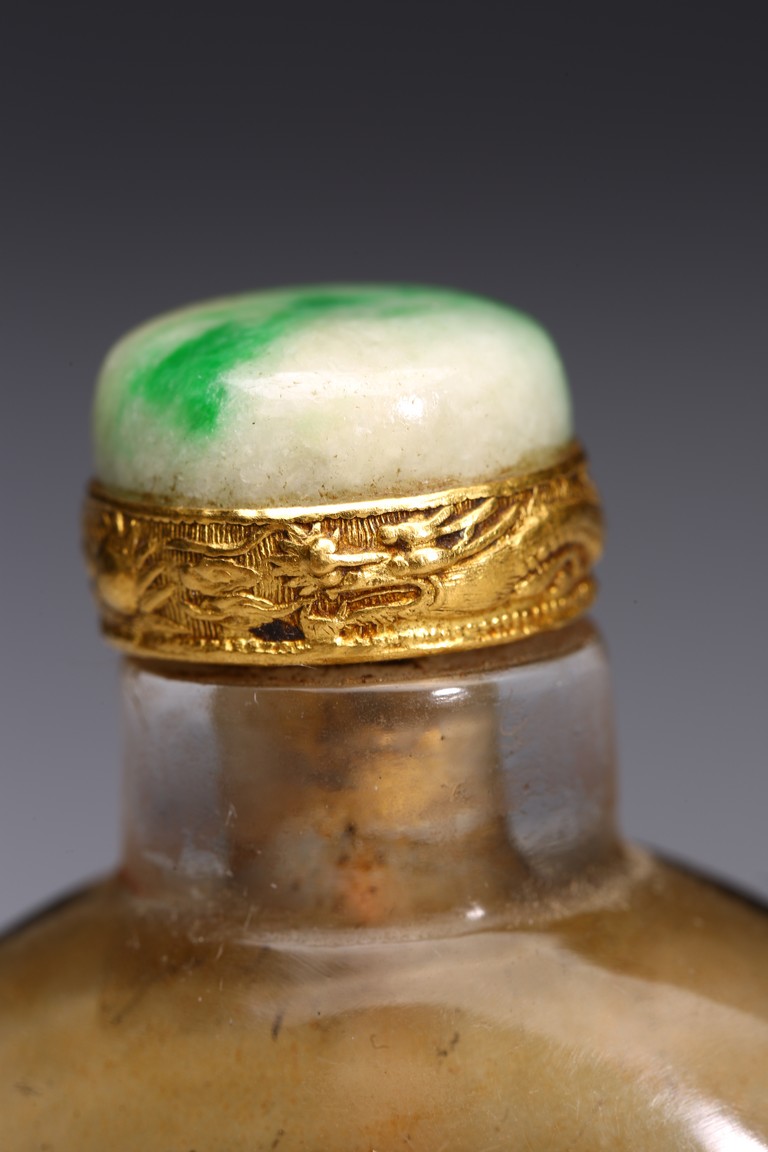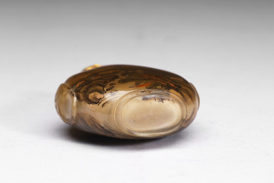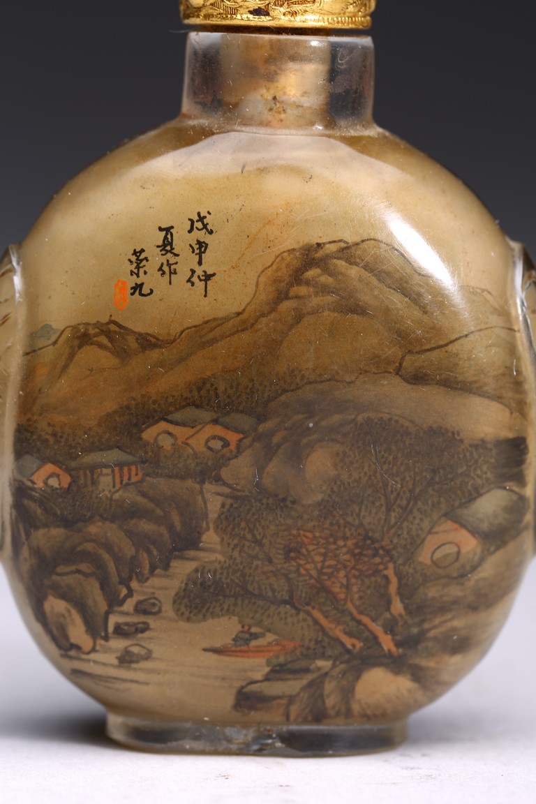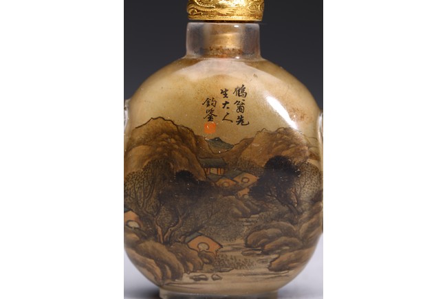 Inside-painted with landscape to the front and reverse, inscribed and signed Rong Jiu attributed to Mr.He Weng, with one seal mark, completed with a jadeite stopper. Republic period.