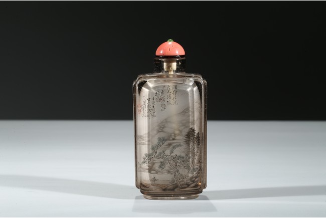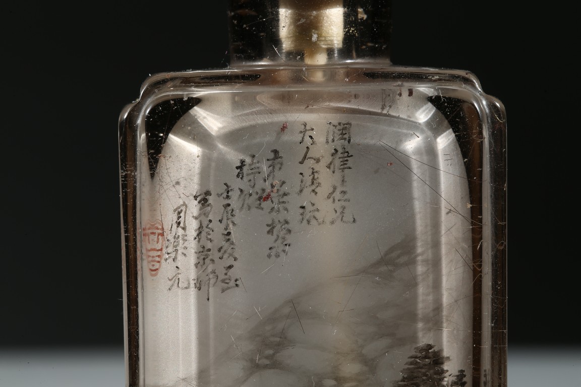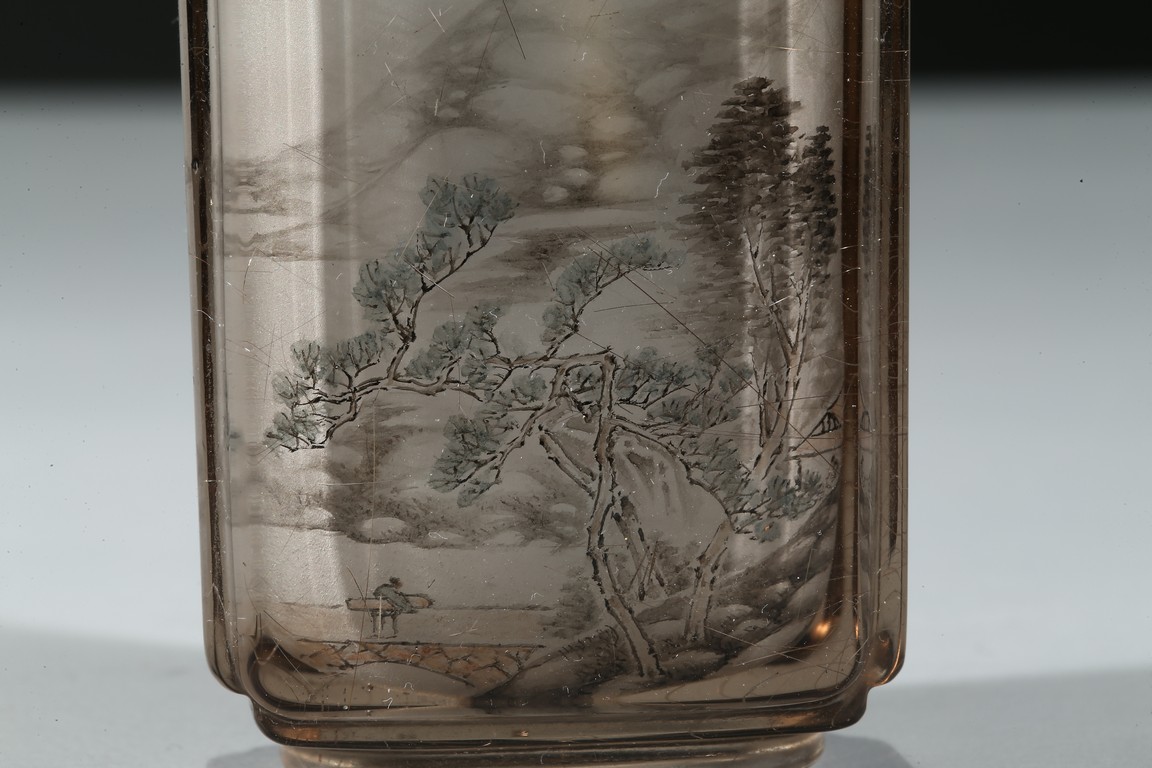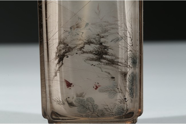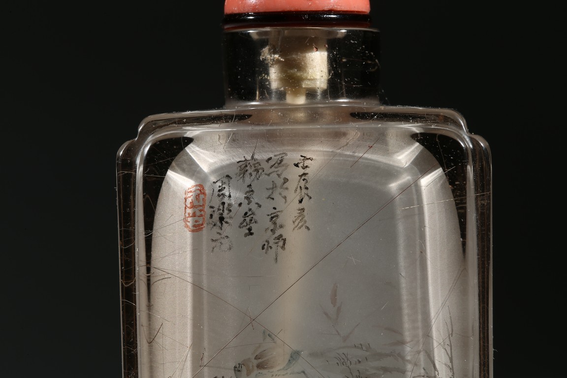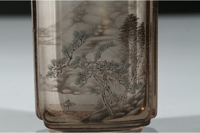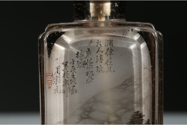 The bottle is painted on the inside with a landscape scene depicting a figure crossing the stone bridge, the other side with large trees and huts, with riverbank and mountains to the background; the reverse inside painted to depict goldfish and cricket. There is a calligraphic inscription to each side along with one seal. Dated to the year of 1892.