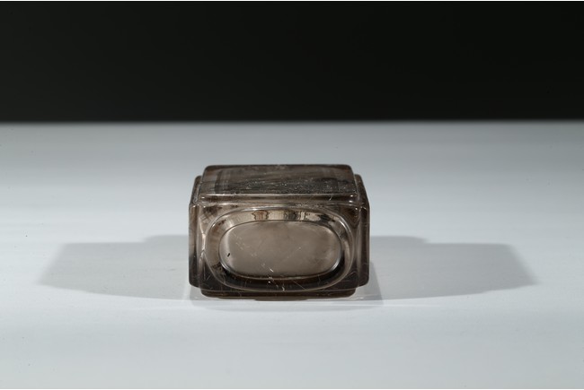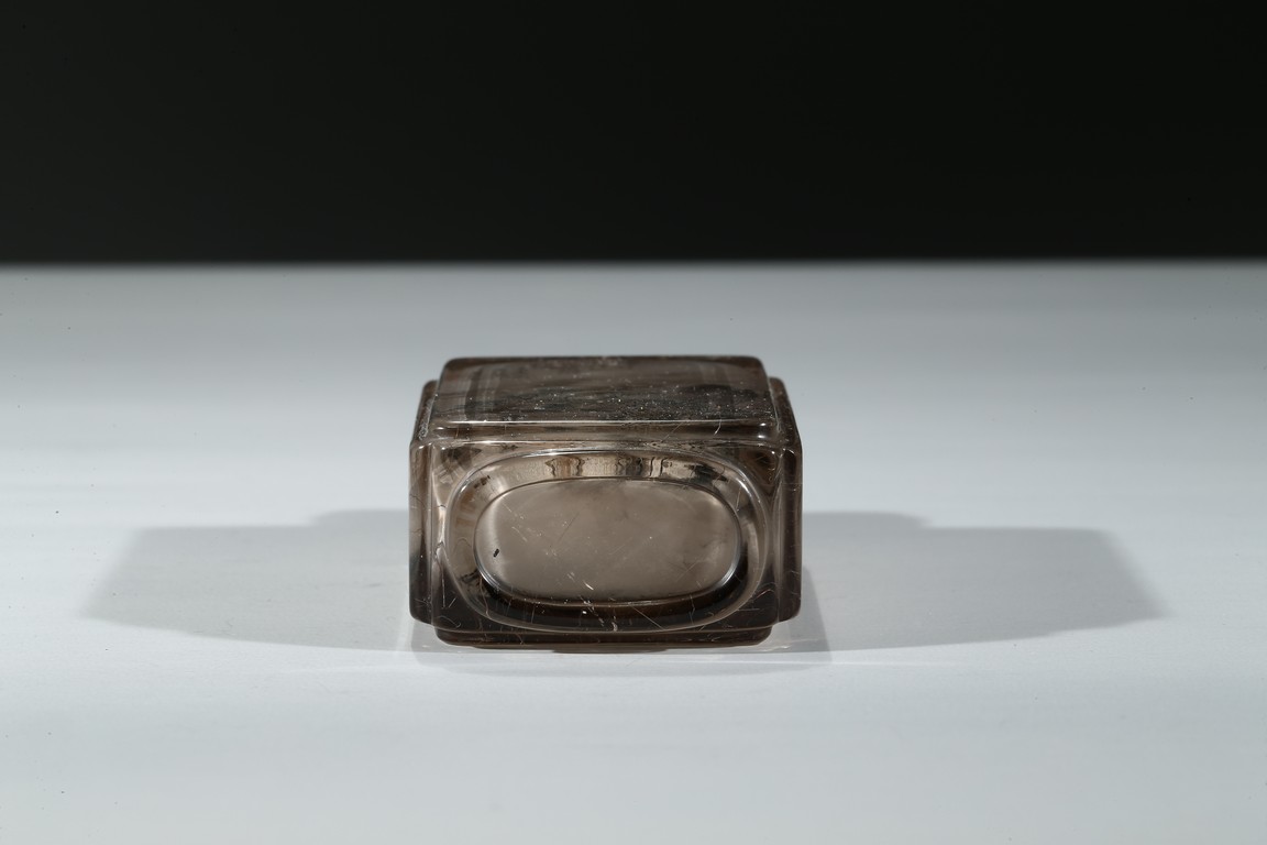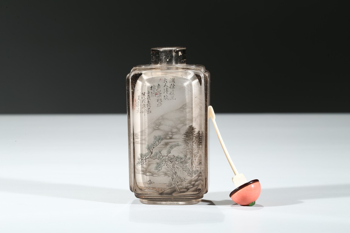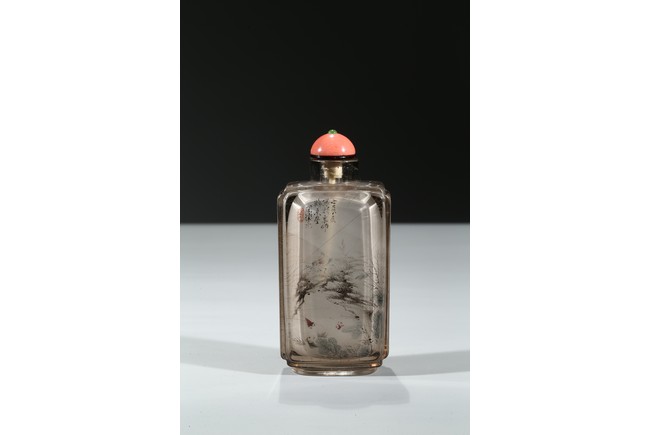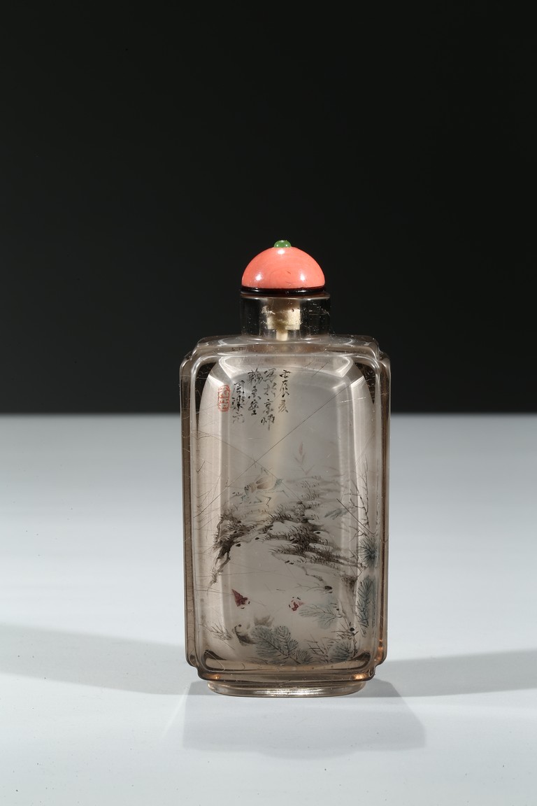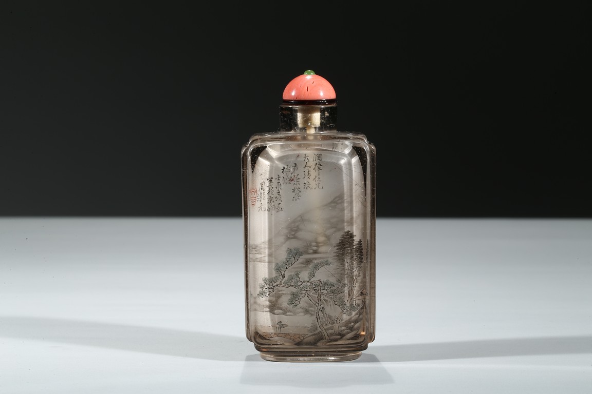 The bottle is painted on the inside with a landscape scene depicting a figure crossing the stone bridge, the other side with large trees and huts, with riverbank and mountains to the background; the reverse inside painted to depict goldfish and cricket. There is a calligraphic inscription to each side along with one seal. Dated to the year of 1892.