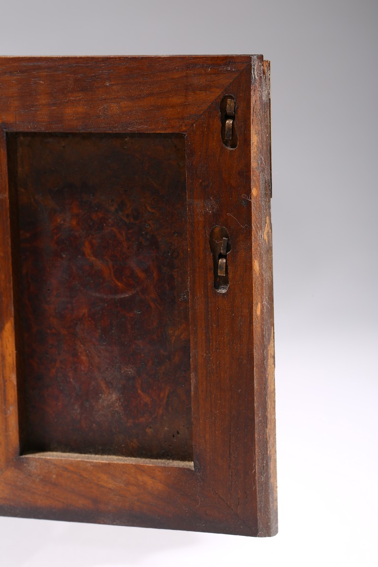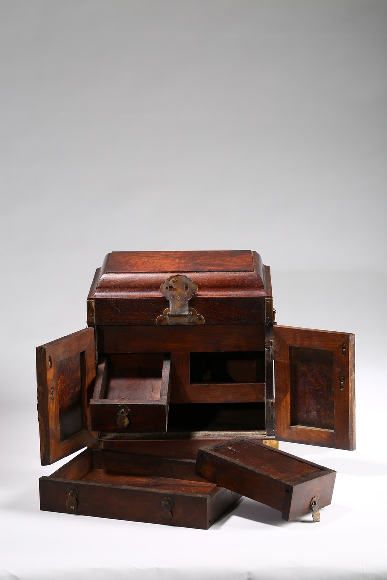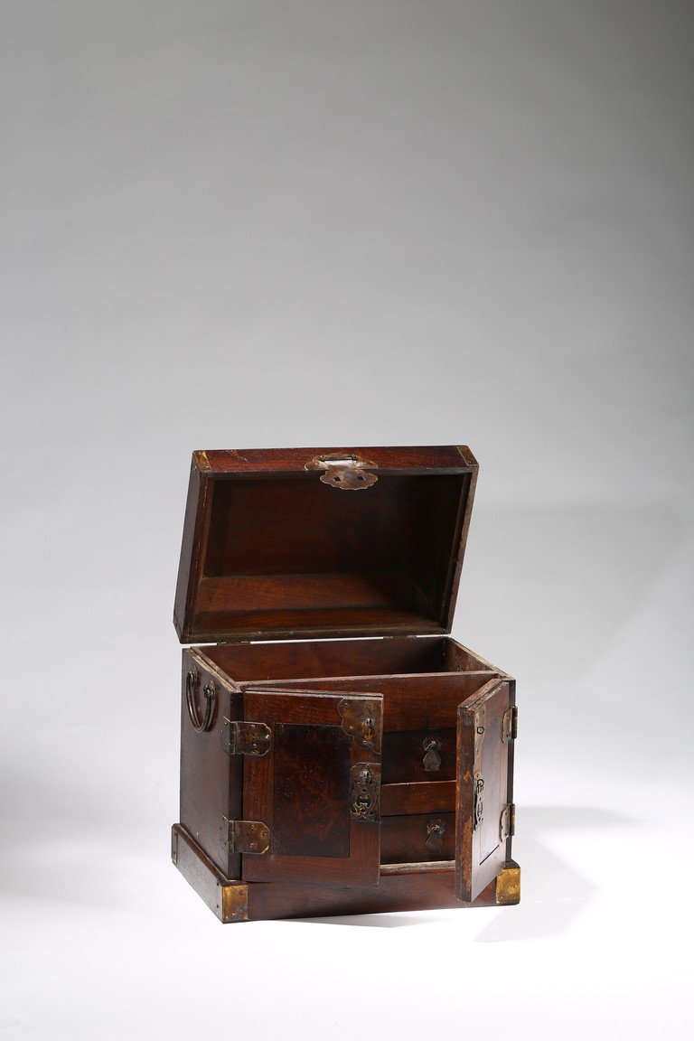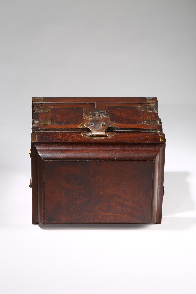 Of rectangular form, the single panel hinged cover above a pair of framed matched burlwood panel doors, hinged to the cabinet by inlaid squared hinges retained by pins, the interior with three drawers of varying size, the inlaid shaped lock escutcheon with a cloud-shaped hasp, each side with bail handles pendent from shaped back and knock plates, all supported on rectangular plinth. Qing Dynasty period.