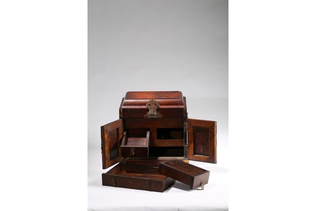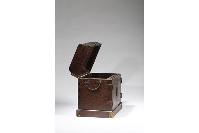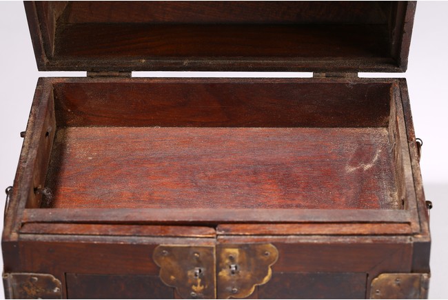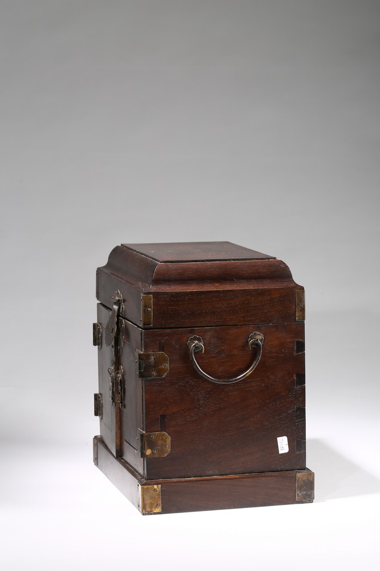 Provenance: Property from an important private collection, San Diego, California 此箱用料講究,以黃花梨製成,色澤溫潤可人,端裝方正,正面置活動開門,打開後內有文具屜格,以盛放筆、墨、硯台,各類文房把玩件之用,底部加以包黃銅護葉加強穩固。此器用料優良,工藝精湛,造型規矩方正,保存完好,包漿老辣,應是出自官宦貴冑之家。 來源: 南加州聖地亞哥私人藏家提供