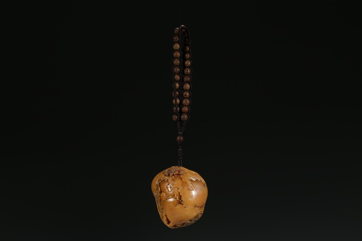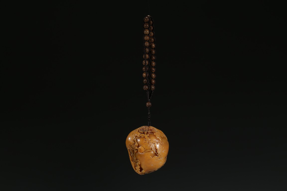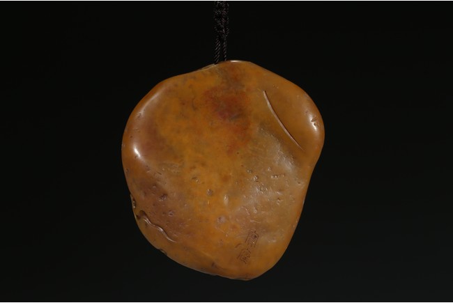 Carved from a single naturalistic tianhuang boulder, the pendant carved in shallow relief to depict three auspicious bats in flight amidst auspicious clouds. Qing Dynasty period.