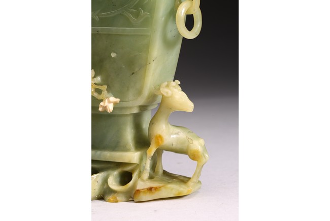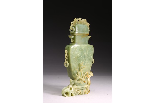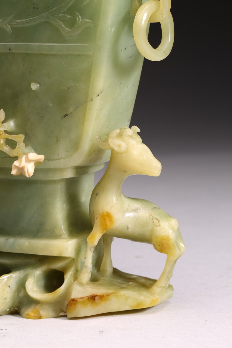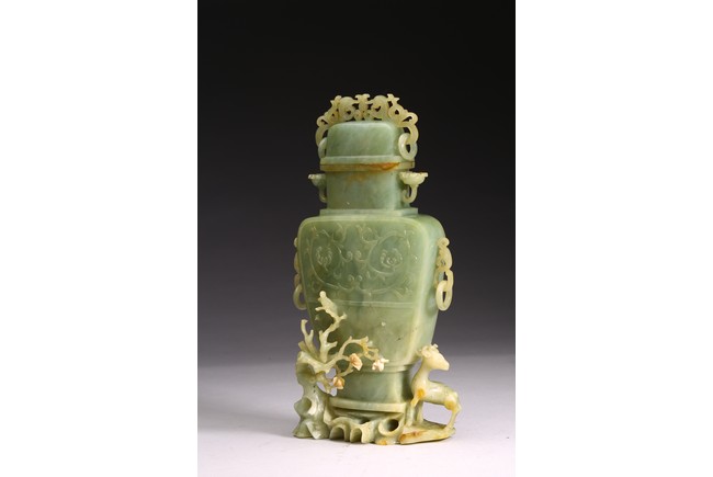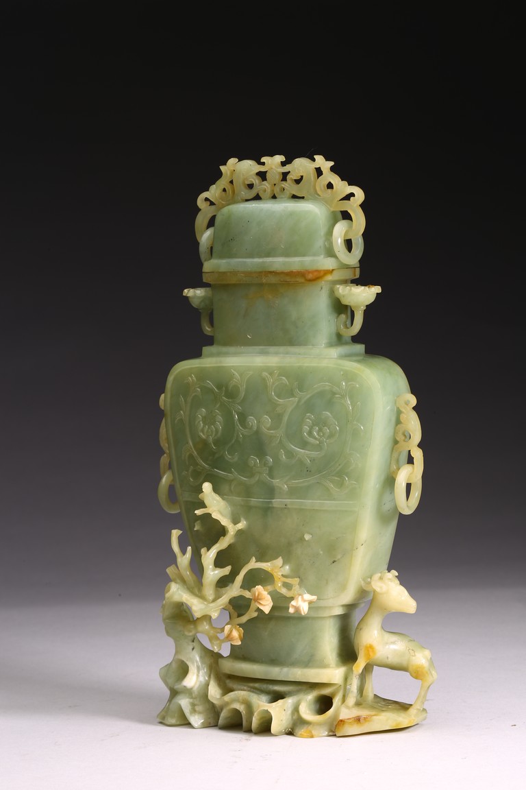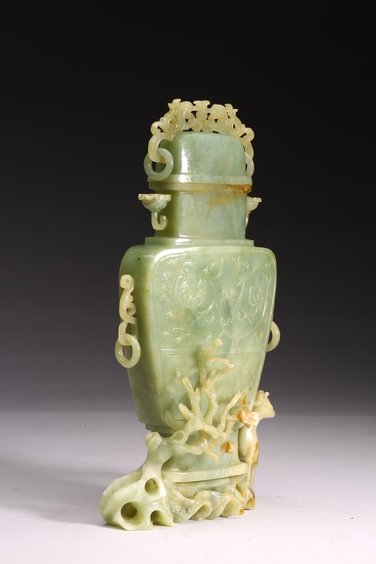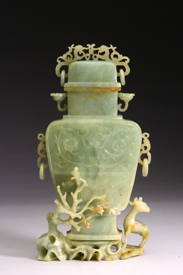 The body of the vase carved in shallow relief with scrolled foliate pattern, with straight neck and cover topped with openwork finial, all supported on openwork rockwork base, with a gnarled tree issuing from the side and birds perching on the branches, and a deer standing foursquare to the other side.