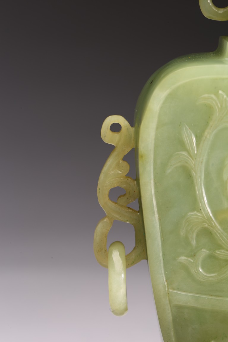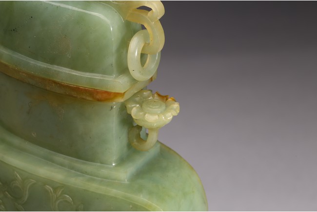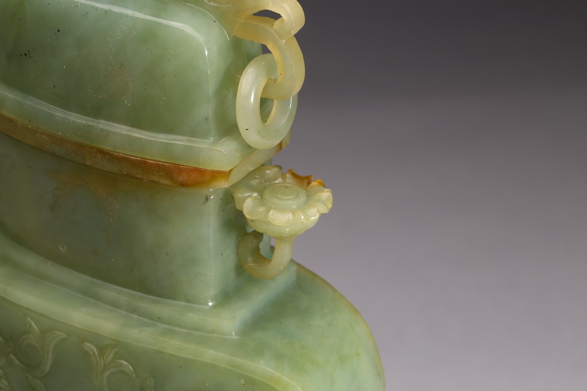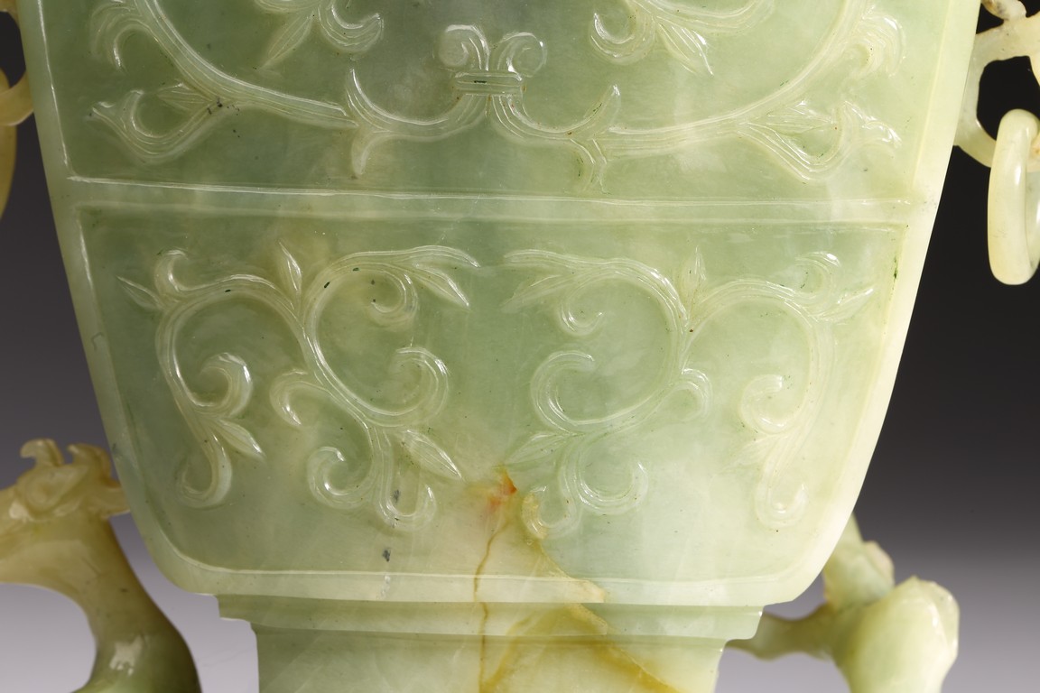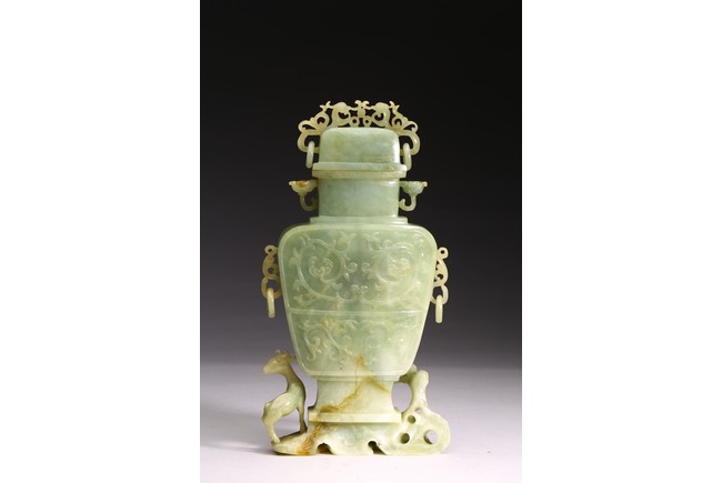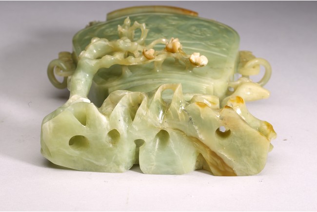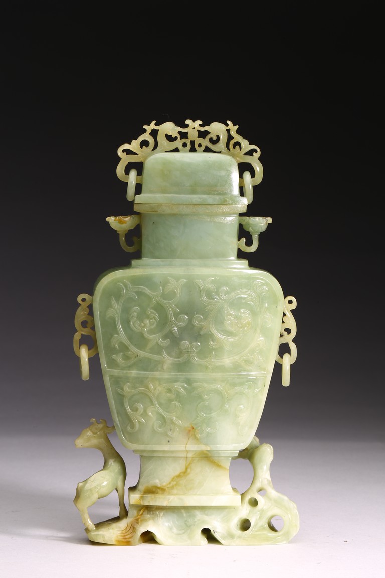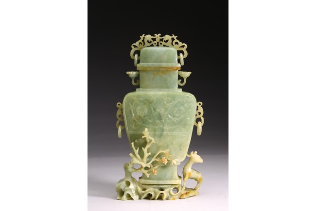The body of the vase carved in shallow relief with scrolled foliate pattern, with straight neck and cover topped with openwork finial, all supported on openwork rockwork base, with a gnarled tree issuing from the side and birds perching on the branches, and a deer standing foursquare to the other side.