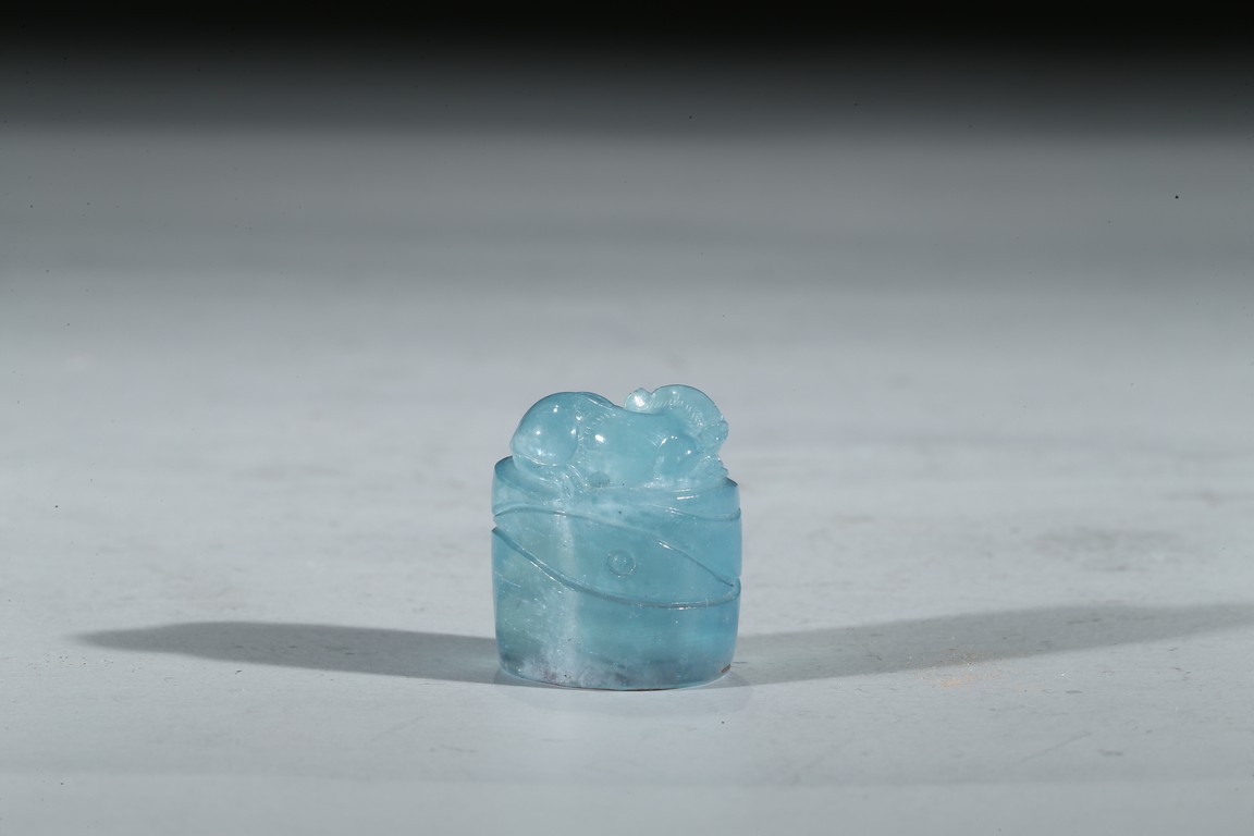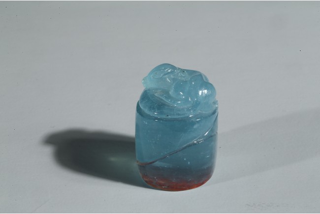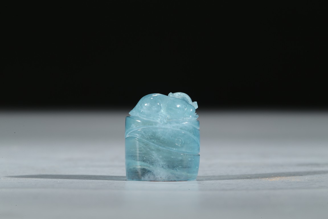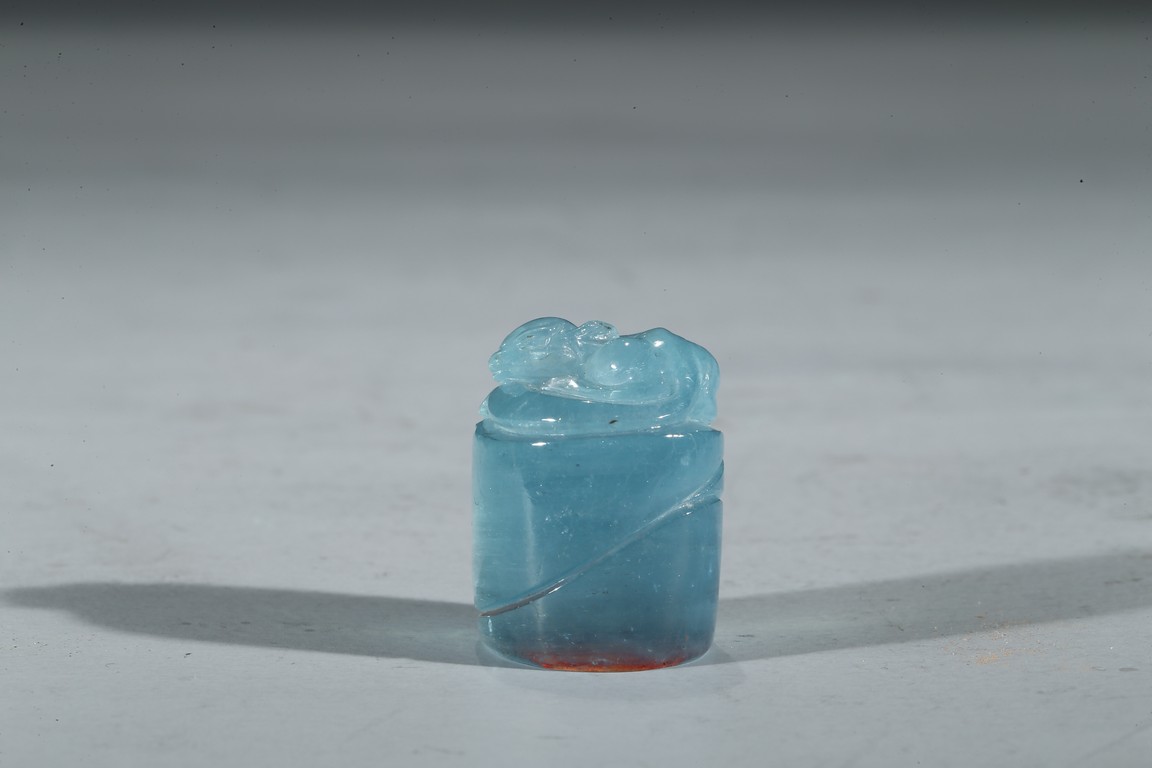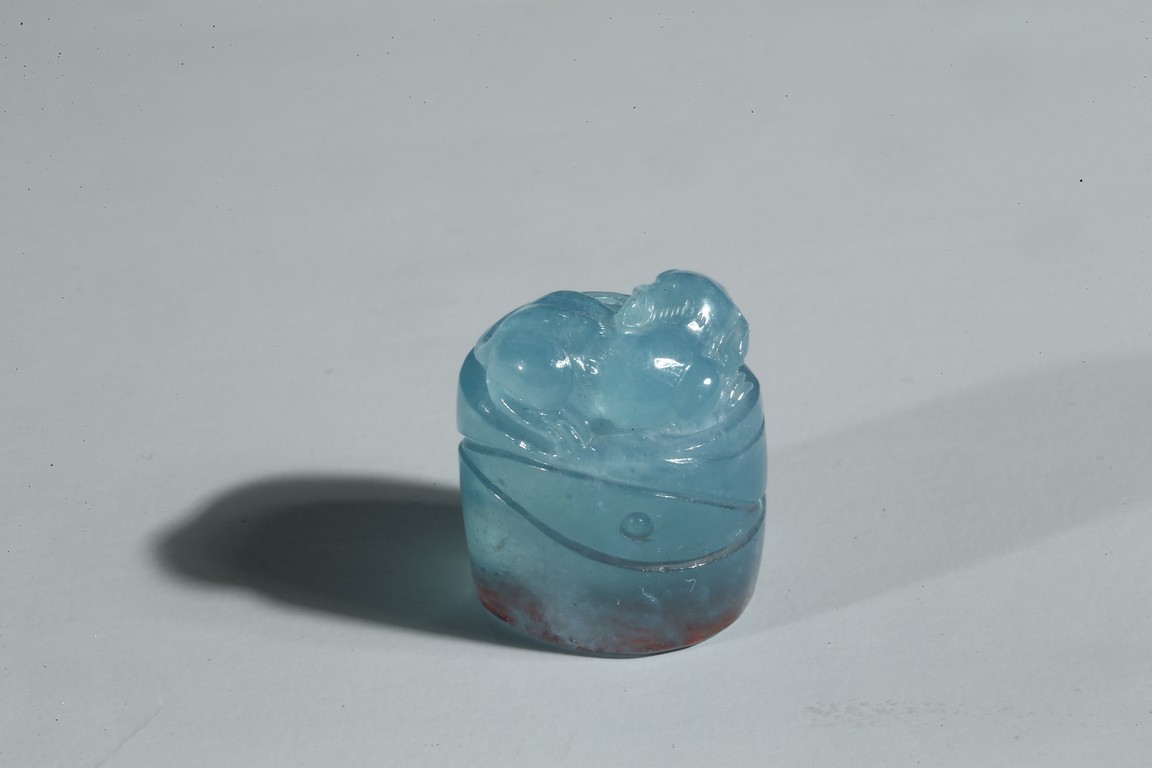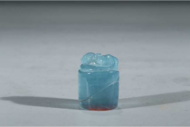 此章藍碧璽質地,晶瑩剔透,光潔亮麗,幽倩可人。琢作印章狀,獸蜷縮其上,瑞獸圓潤可愛,玲瓏俏皮,底部滿文印文,釋“長春吉祥”“吉祥長春”。