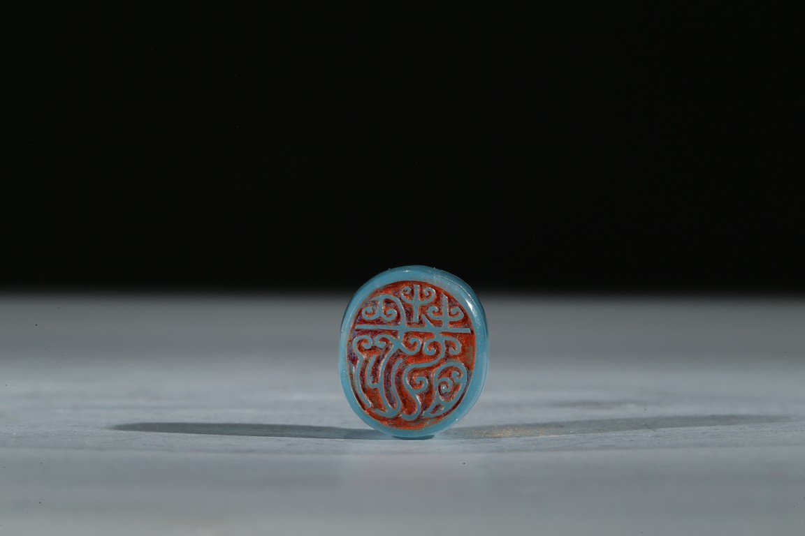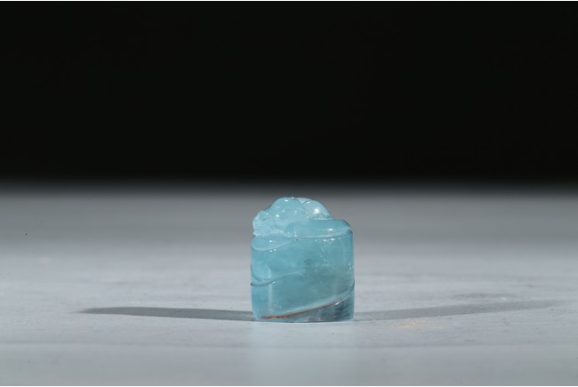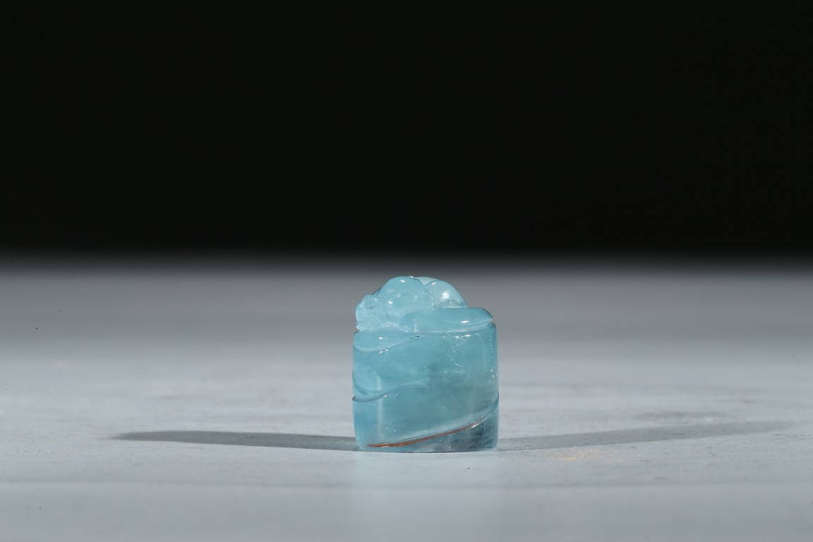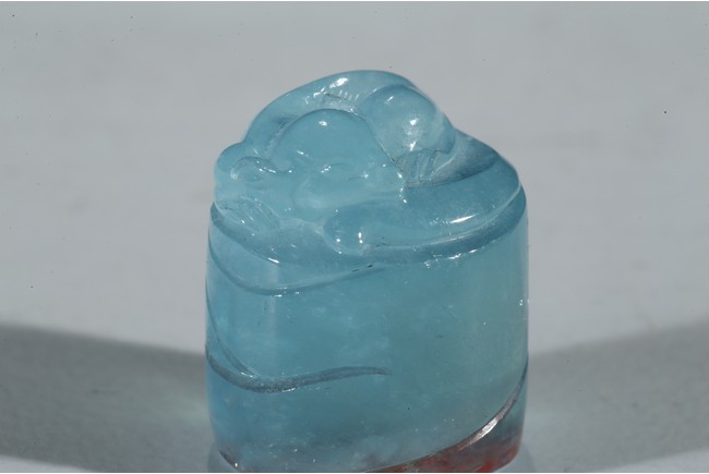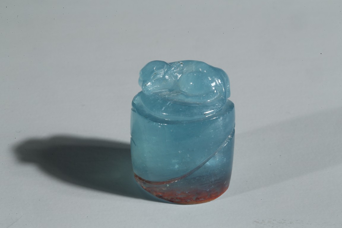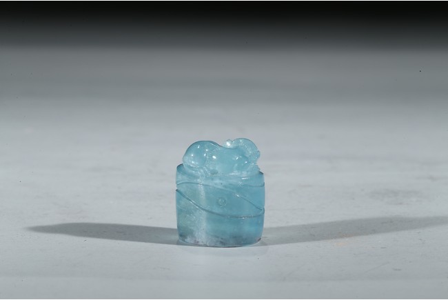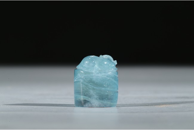 此章藍碧璽質地,晶瑩剔透,光潔亮麗,幽倩可人。琢作印章狀,獸蜷縮其上,瑞獸圓潤可愛,玲瓏俏皮,底部滿文印文,釋“長春吉祥”“吉祥長春”。