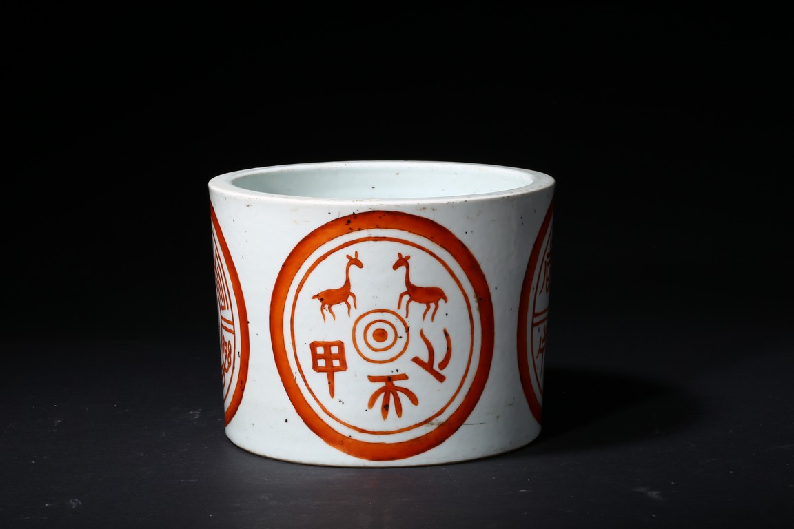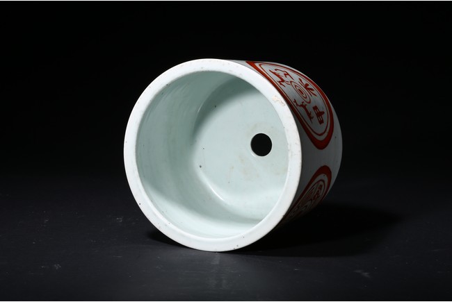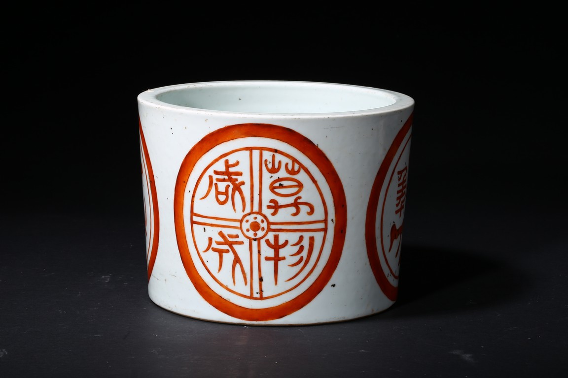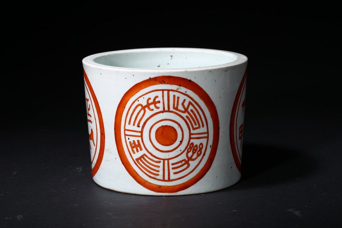 Of cylindrical form, the brushpot is painted with roundels enclosing stylized characters in red. The bottom drilled in hole. Qing Dynasty period.