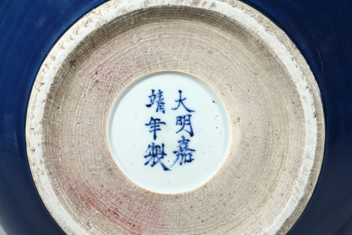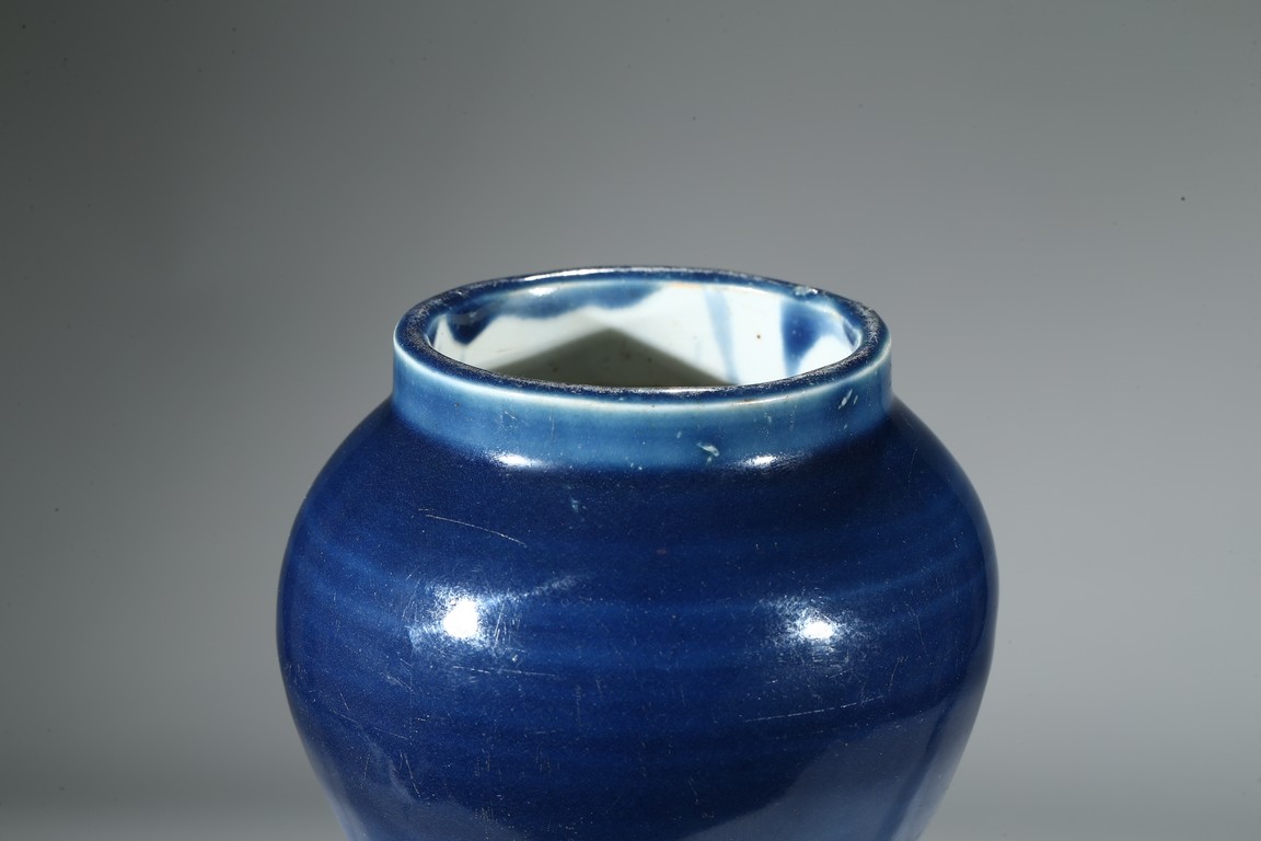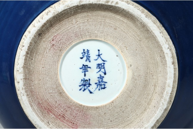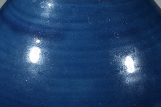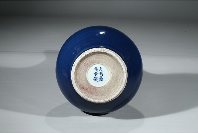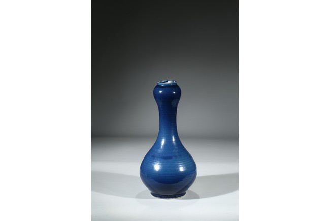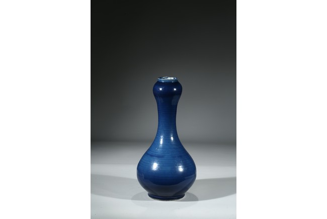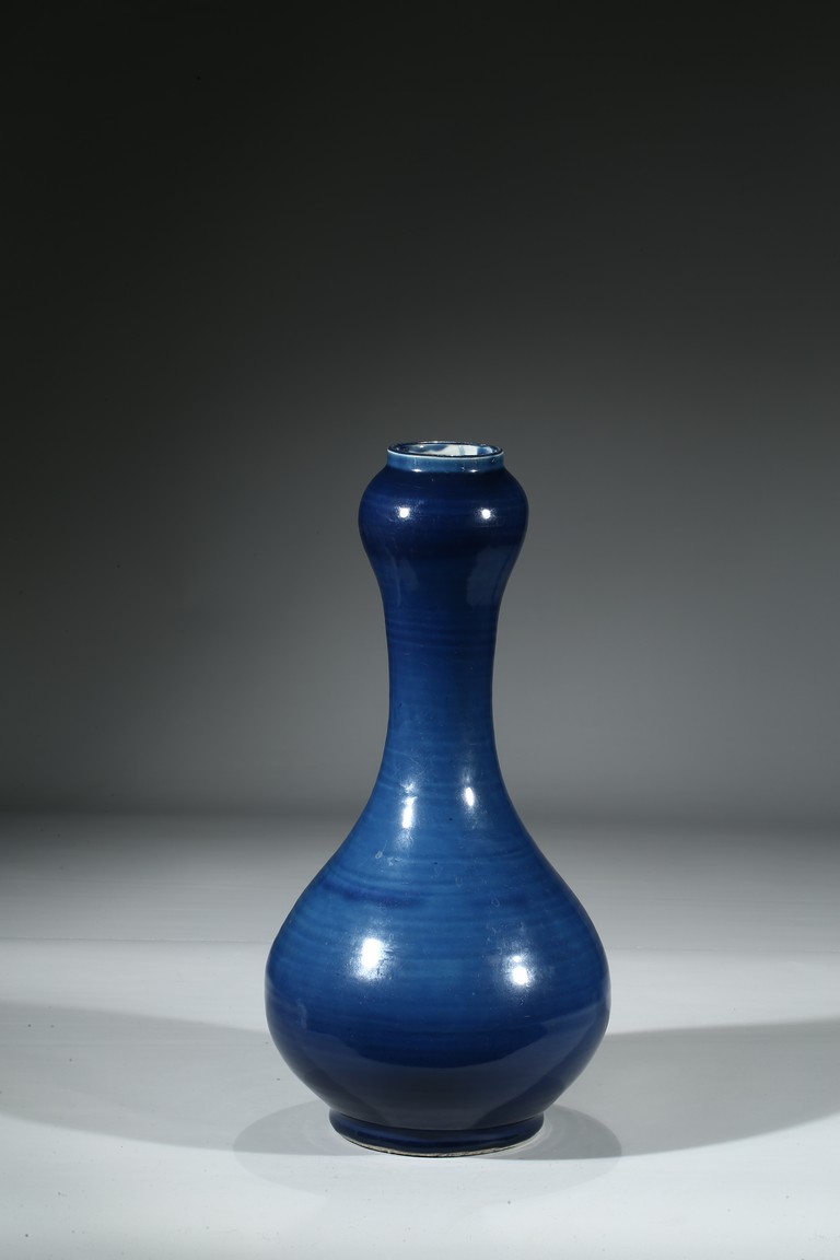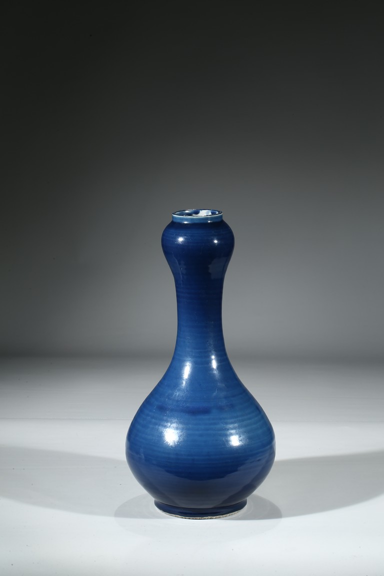 The pear-shaped body rising from a spreading foot to a tall waisted neck with a garlic-head mouth and straight lip, overall suffused with attractive blue glaze, the base with apocryphal six character Jiajing mark. Qing Dynasty period.