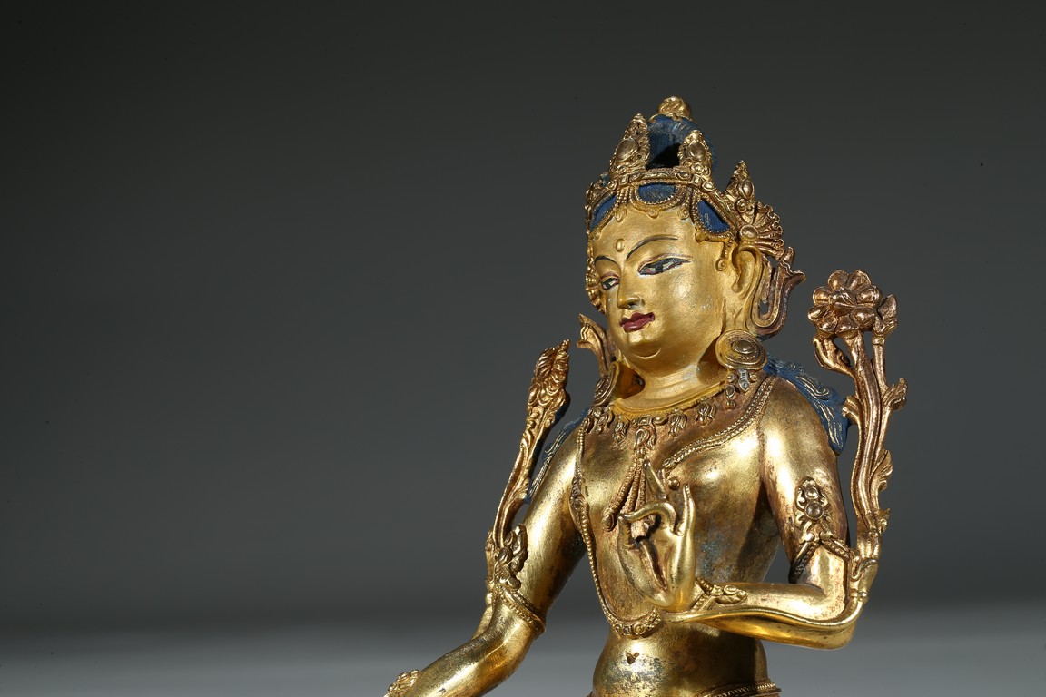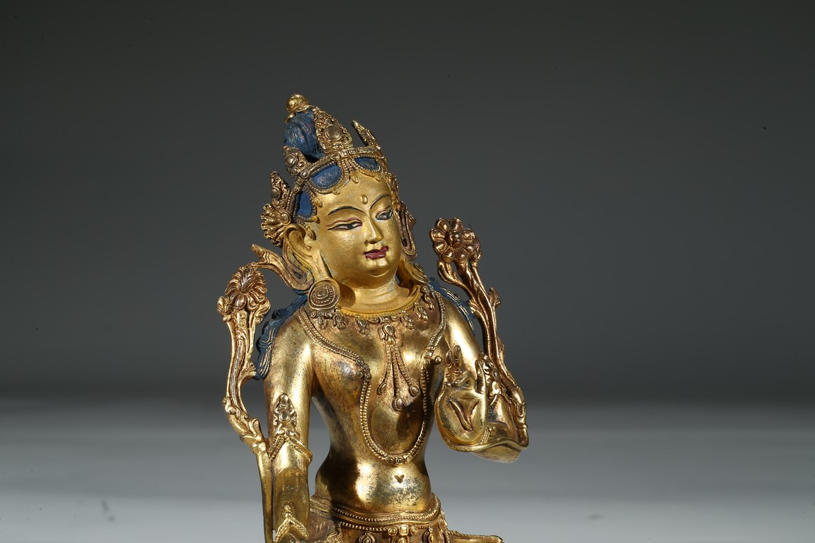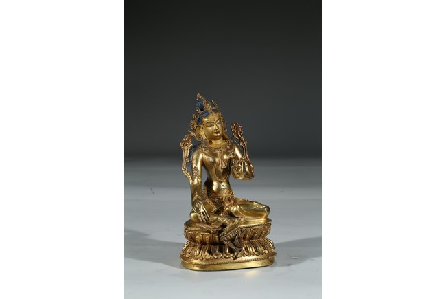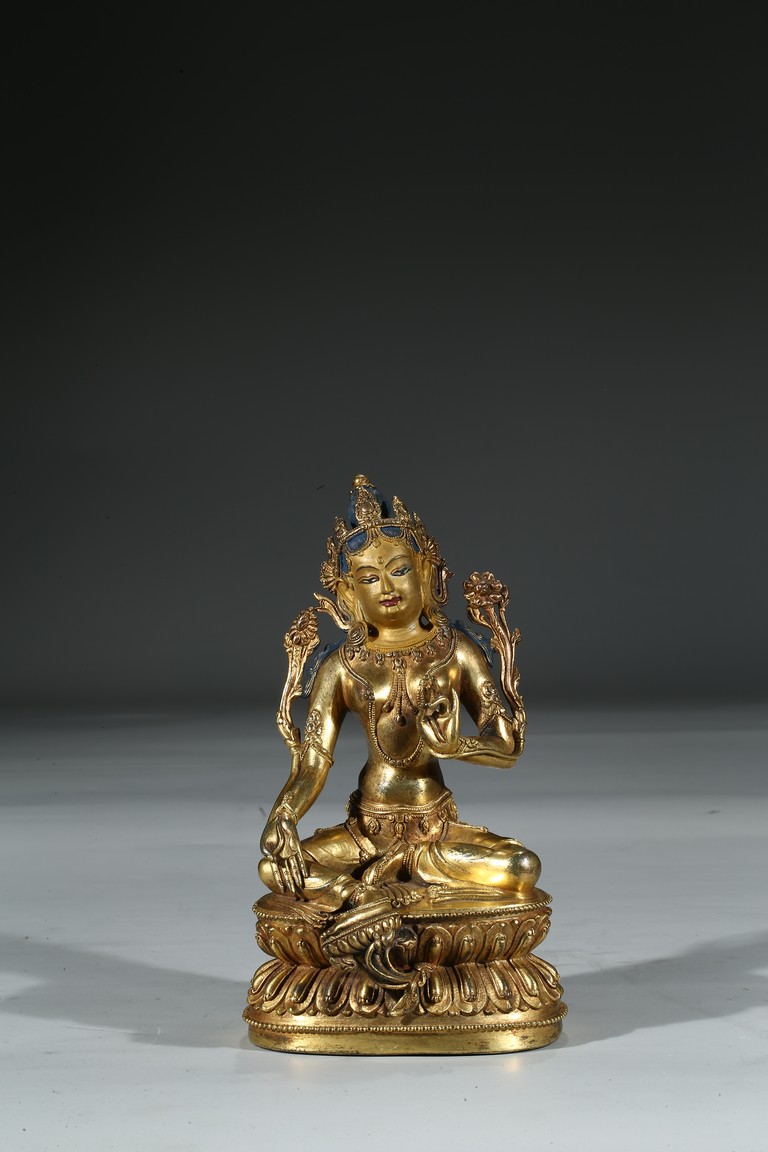 Provenance: Property from a private collection, Virgnia 綠度母是二十一救度佛母之首,由觀世音菩薩幻化而來的。本尊綠度母身姿修長,體態婀娜,富於女性之柔美風韻。其圓潤的面龐微微右傾,雙目溫蓄地俯視,一雙細眉舒展於飽滿的額上,窄挺的鼻尖下,櫻唇微微上揚。其頭戴五葉寶冠,冠葉細小,冠沿垂下流蘇式瓔珞,富麗華美。度母束髮高髻,發縷絲絲可見,飽滿的耳垂下繫著圓形耳鐺,耳後兩側細長的髮束從雙肩垂落。其胸前與腰間繫有華麗的瓔珞墜飾,手臂、手腕與腳踝佩帶手鐲、臂釧與踝飾。其細長的帛帶自雙肩垂下,輕繞於手臂,衣紋褶皺流暢自然。綠度母右手展開,結與願印;左手拇指與無名指相捻,結說法印,雙手輕捻兩支蓮莖,生出兩朵蓮花挺立在度母兩側。綠度母呈右舒坐之姿,由蓮座中央生出一支小蓮座,托起右足,下承仰覆蓮座,蓮瓣細長而飽滿,座上下緣飾以連珠紋。 來源:維吉尼亞州私人藏家收藏