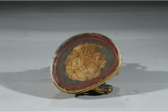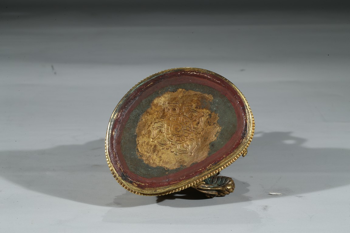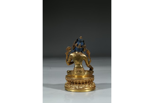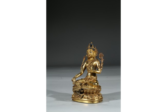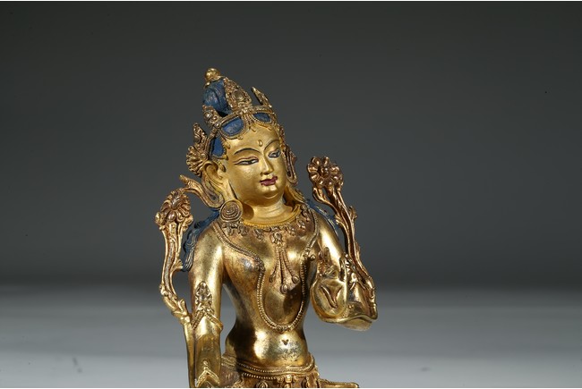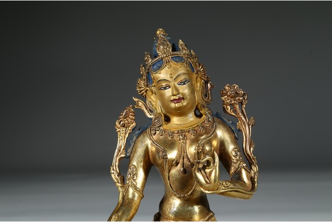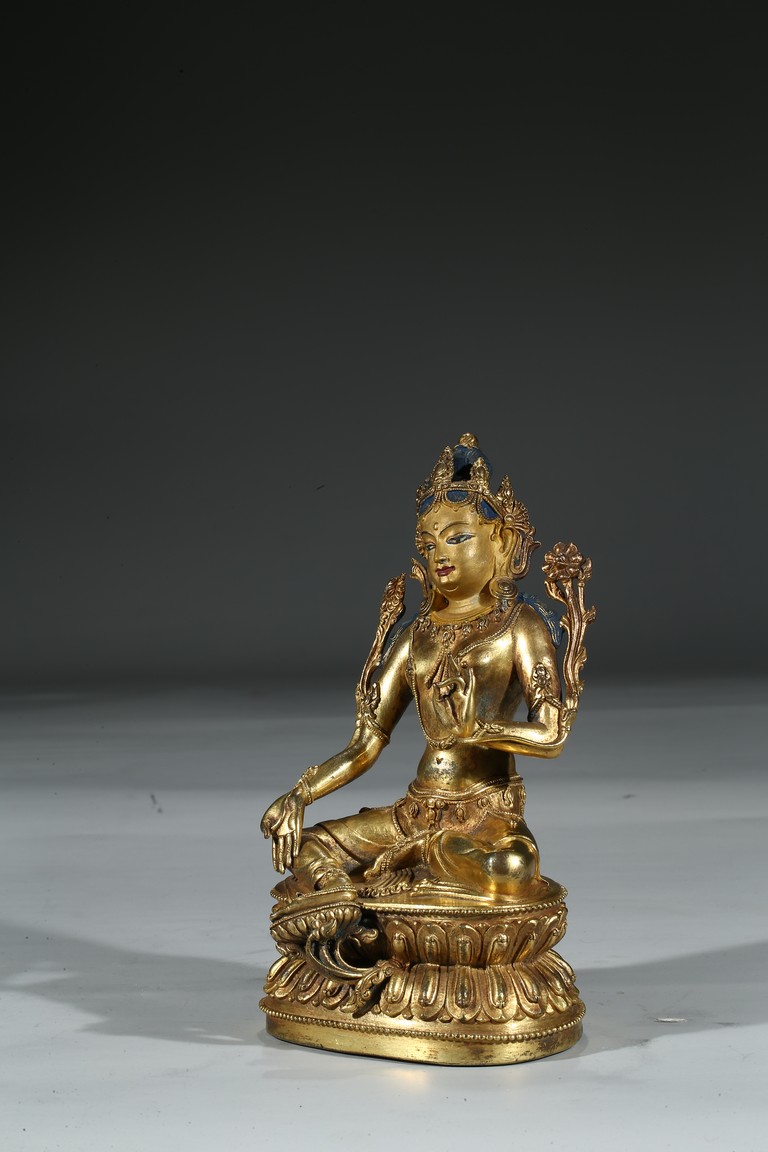 Provenance: Property from a private collection, Virgnia 綠度母是二十一救度佛母之首,由觀世音菩薩幻化而來的。本尊綠度母身姿修長,體態婀娜,富於女性之柔美風韻。其圓潤的面龐微微右傾,雙目溫蓄地俯視,一雙細眉舒展於飽滿的額上,窄挺的鼻尖下,櫻唇微微上揚。其頭戴五葉寶冠,冠葉細小,冠沿垂下流蘇式瓔珞,富麗華美。度母束髮高髻,發縷絲絲可見,飽滿的耳垂下繫著圓形耳鐺,耳後兩側細長的髮束從雙肩垂落。其胸前與腰間繫有華麗的瓔珞墜飾,手臂、手腕與腳踝佩帶手鐲、臂釧與踝飾。其細長的帛帶自雙肩垂下,輕繞於手臂,衣紋褶皺流暢自然。綠度母右手展開,結與願印;左手拇指與無名指相捻,結說法印,雙手輕捻兩支蓮莖,生出兩朵蓮花挺立在度母兩側。綠度母呈右舒坐之姿,由蓮座中央生出一支小蓮座,托起右足,下承仰覆蓮座,蓮瓣細長而飽滿,座上下緣飾以連珠紋。 來源:維吉尼亞州私人藏家收藏