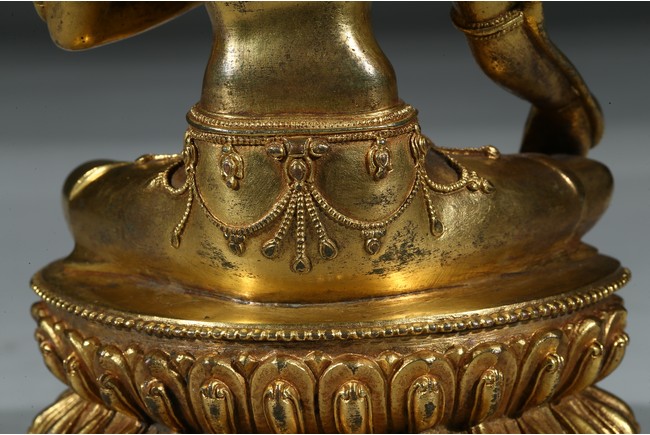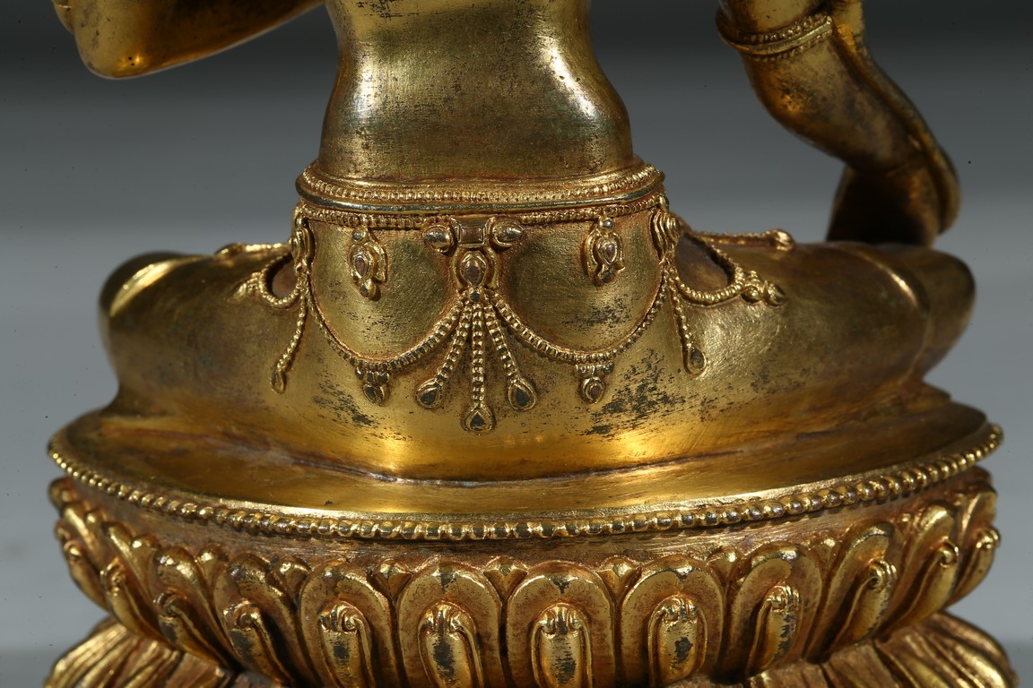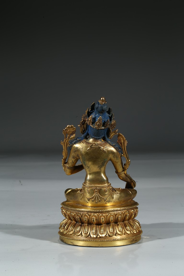 Seated in lalitasana on a double-lotus base, the right hand held in varada mudra and the left raised to the chest in vitarka mudra, both supporting uptala lotuses rising to the shoulders along the elbows, wearing a dhoti and a loose shawl over the shoulder, adorned with bejewelled necklaces around the waist and the chest, the cold-gilt face with a benevolent expression, crowned with a five-leaf tiara in front of a high chignon. Early Qing Dynasty period.