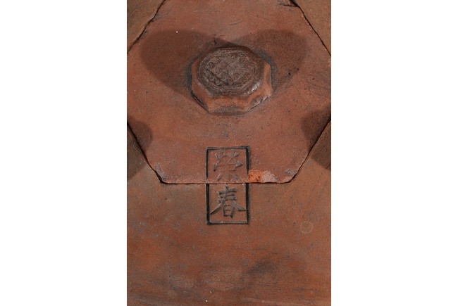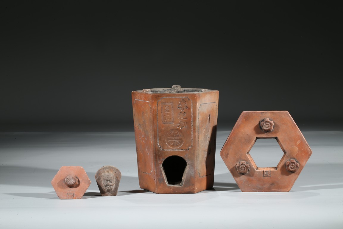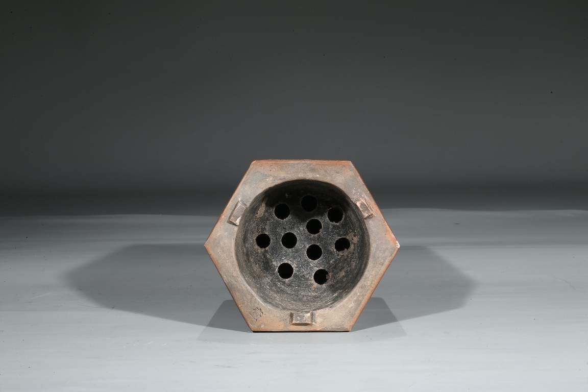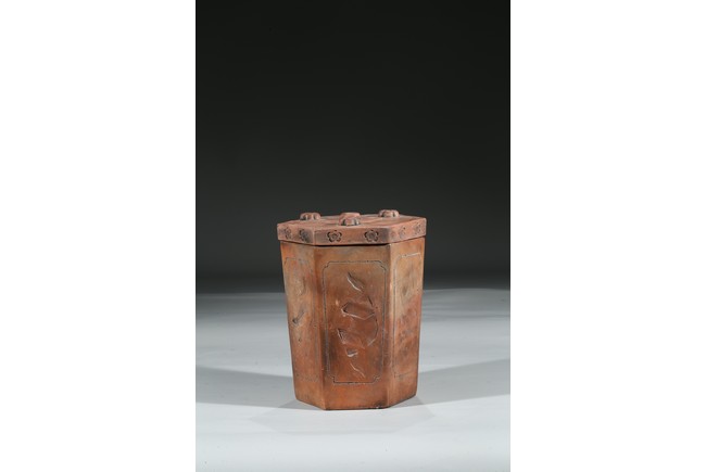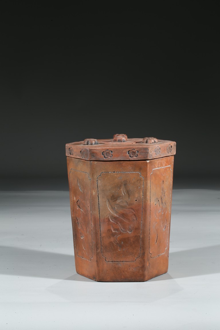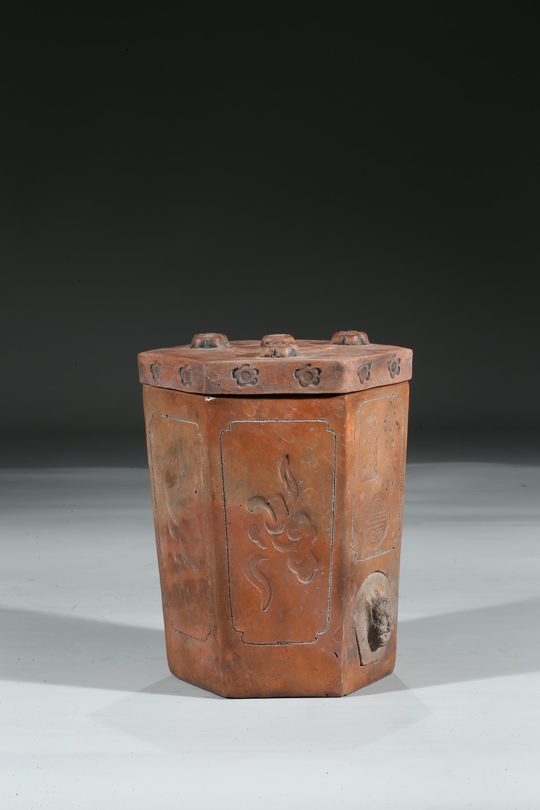 Of hexagonal form, with an opening to the base and a separable top cover, the body with inscription and moulded decorations.