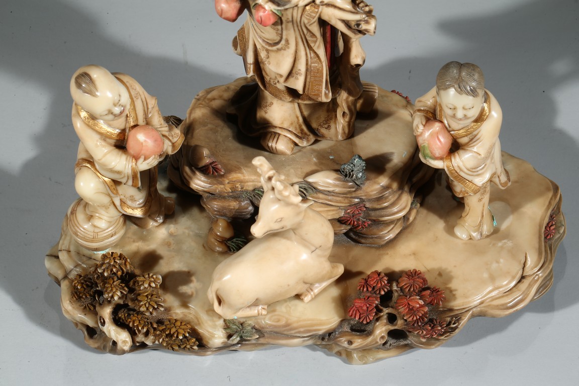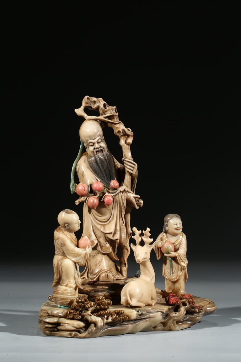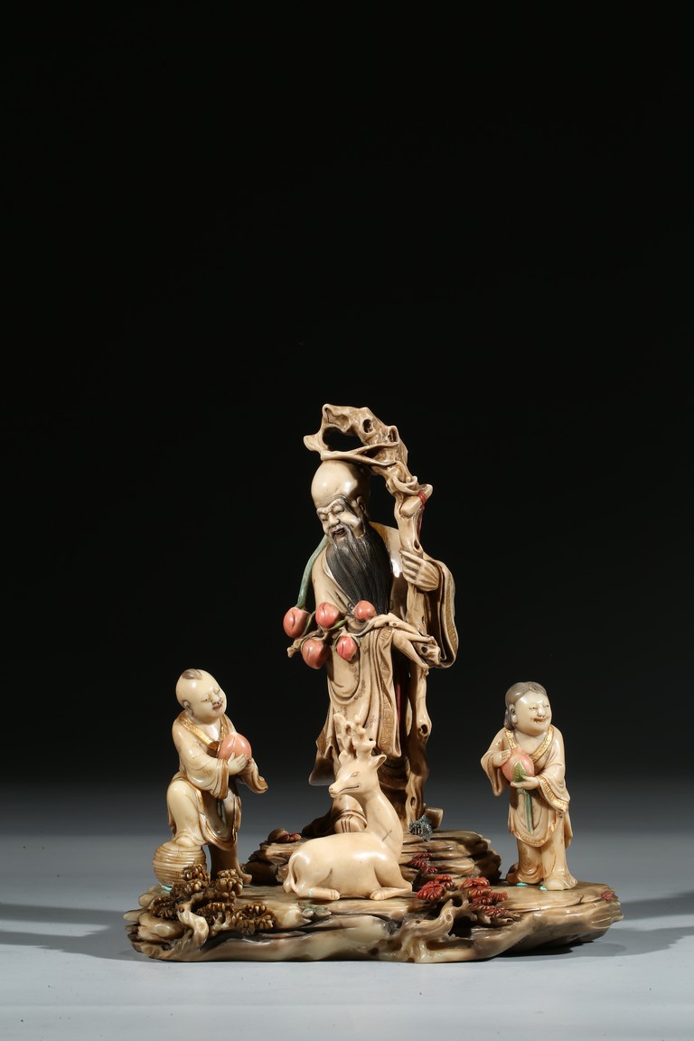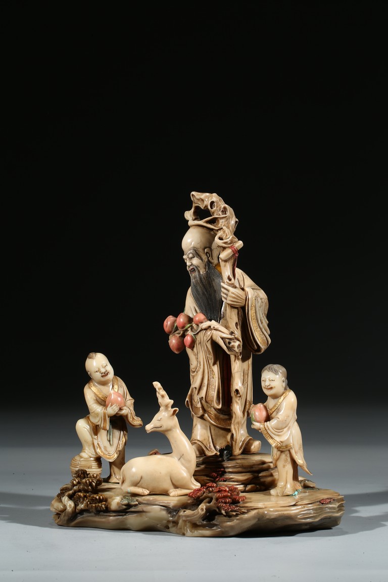 Modelled with the longevity immortal holding a large gnarled staff on left hand and peach branch on the right, wearing voluminous robe with incised him, with long beard and bold head, flanked by two boys holding peach, behind a recumbent deer, all set upon a rockwork formed base. Qing Dynasty period.
