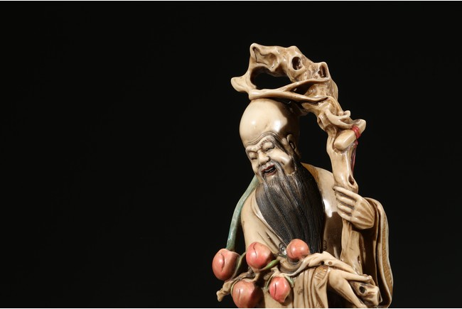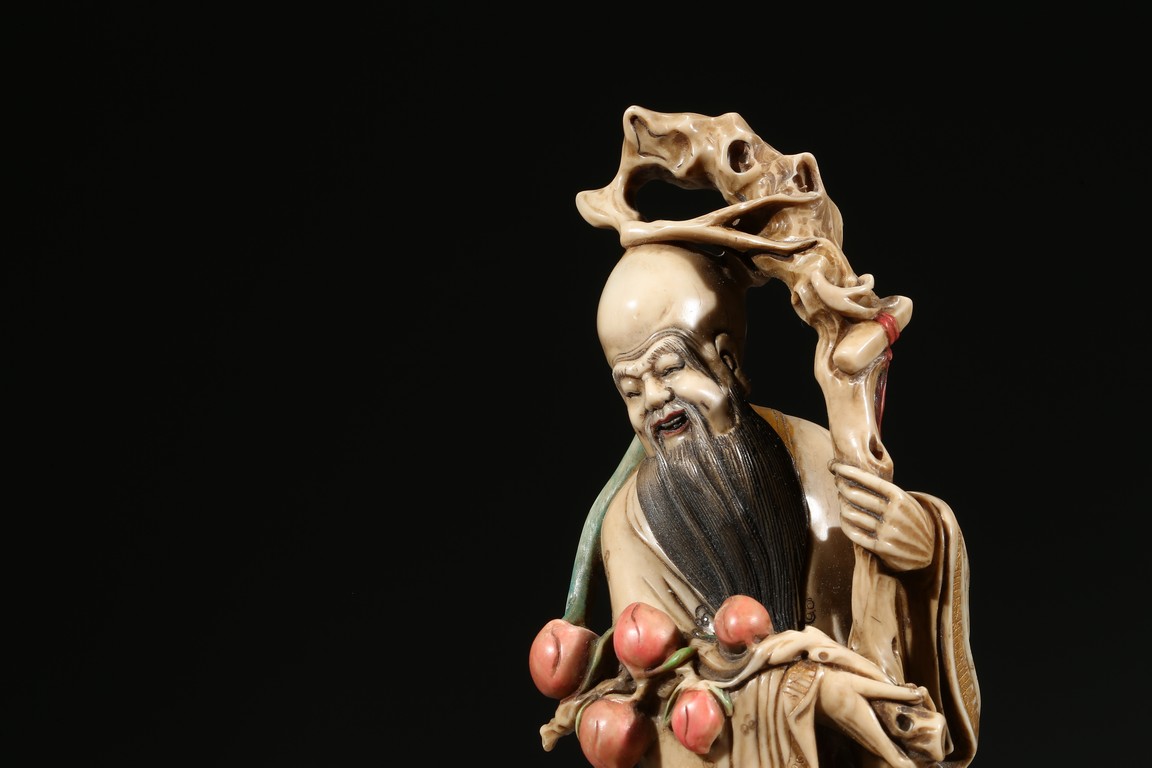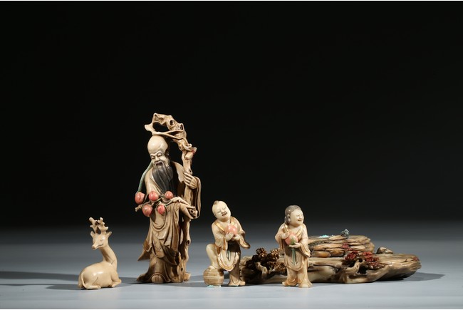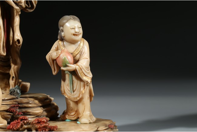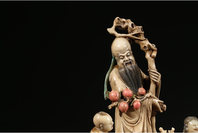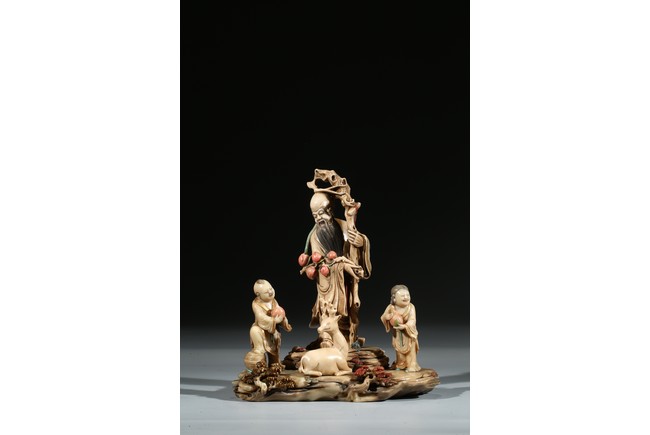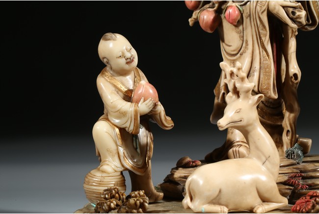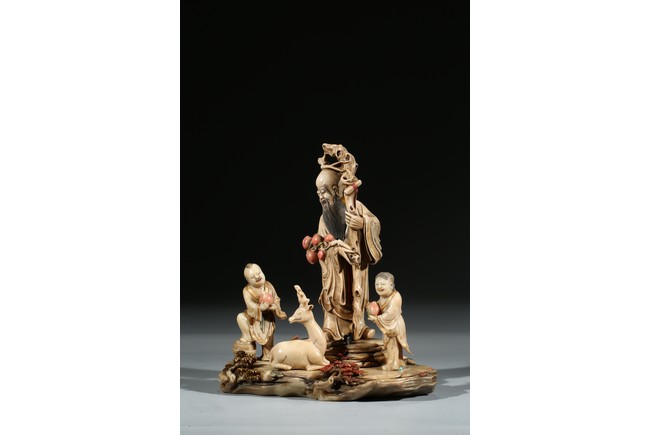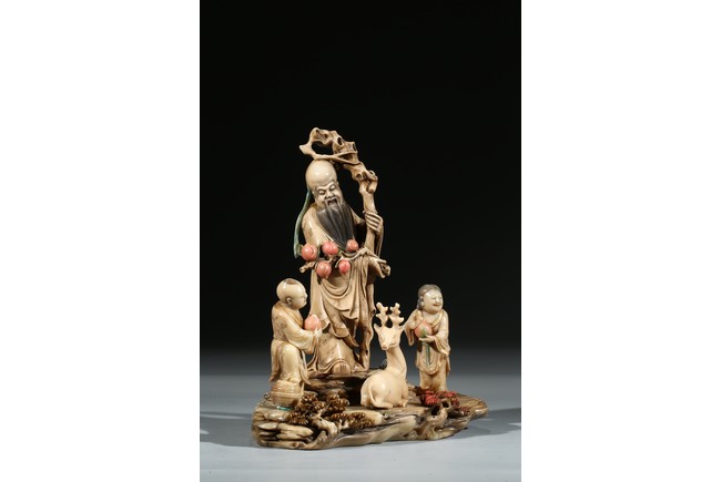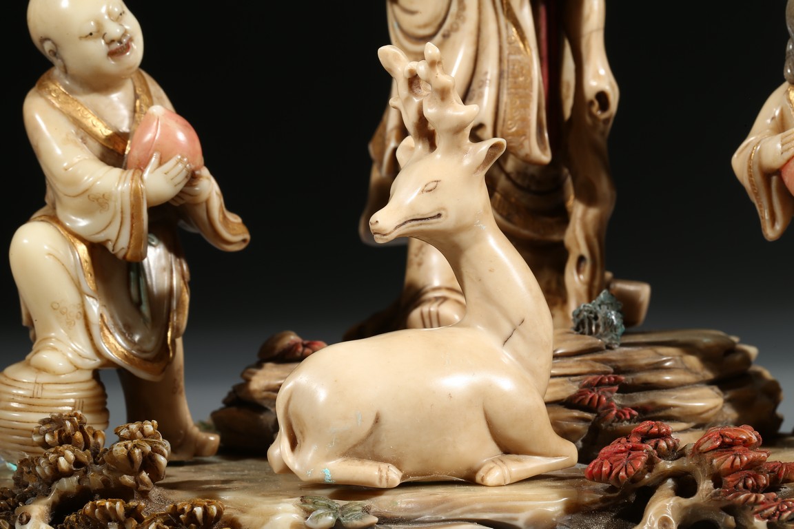 Modelled with the longevity immortal holding a large gnarled staff on left hand and peach branch on the right, wearing voluminous robe with incised him, with long beard and bold head, flanked by two boys holding peach, behind a recumbent deer, all set upon a rockwork formed base. Qing Dynasty period.
