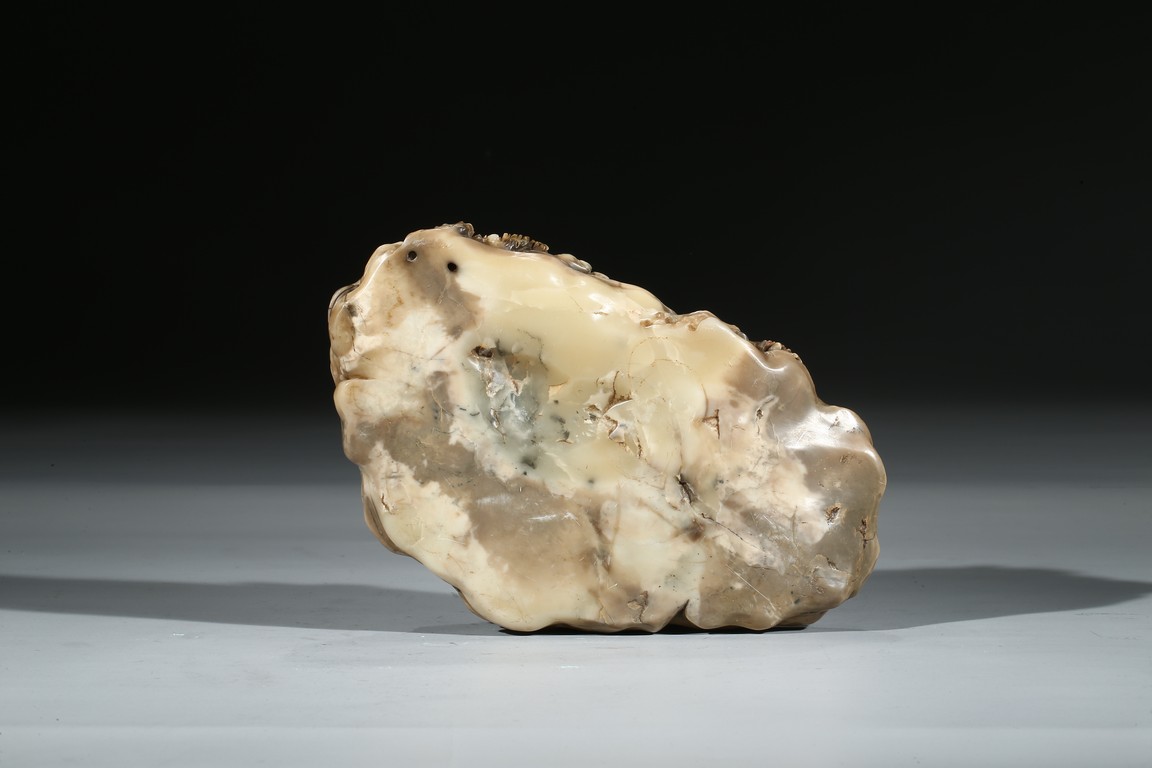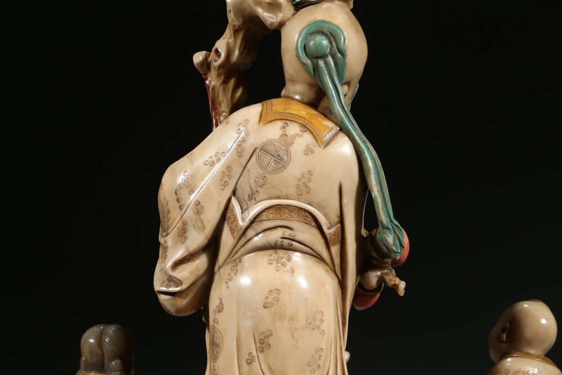 Provenance: Property from an important private collection, Northern California 此擺件材料碩大,取壽山石圓雕而成,局部填彩,成就福祿壽三星圖。壽山石質潤澤瑩朗,素雅而勻淨,肌理澄澈,寶光流溢,手感細膩可人。主體部分為壽星,高額隆目,長鬚飄然,喜笑顏開,右手執權杖,左手抱壽桃立於層層石座之上;童男童女手捧壽桃陪伴左右,天鹿側跪前方;四周山石嶙峋,外壁浮雕松干曲折盤繞。整器雕工細膩剛勁,線條流暢自然,人物神態傳神逼真,佈局疏朗有致,層次分明,實與明清山水畫境的表現有異曲同工之妙。“福”寓意五福臨門,“祿”寓意高官厚祿,“壽”寓意長命百歲。 來源: 北加州重要私人藏家提供