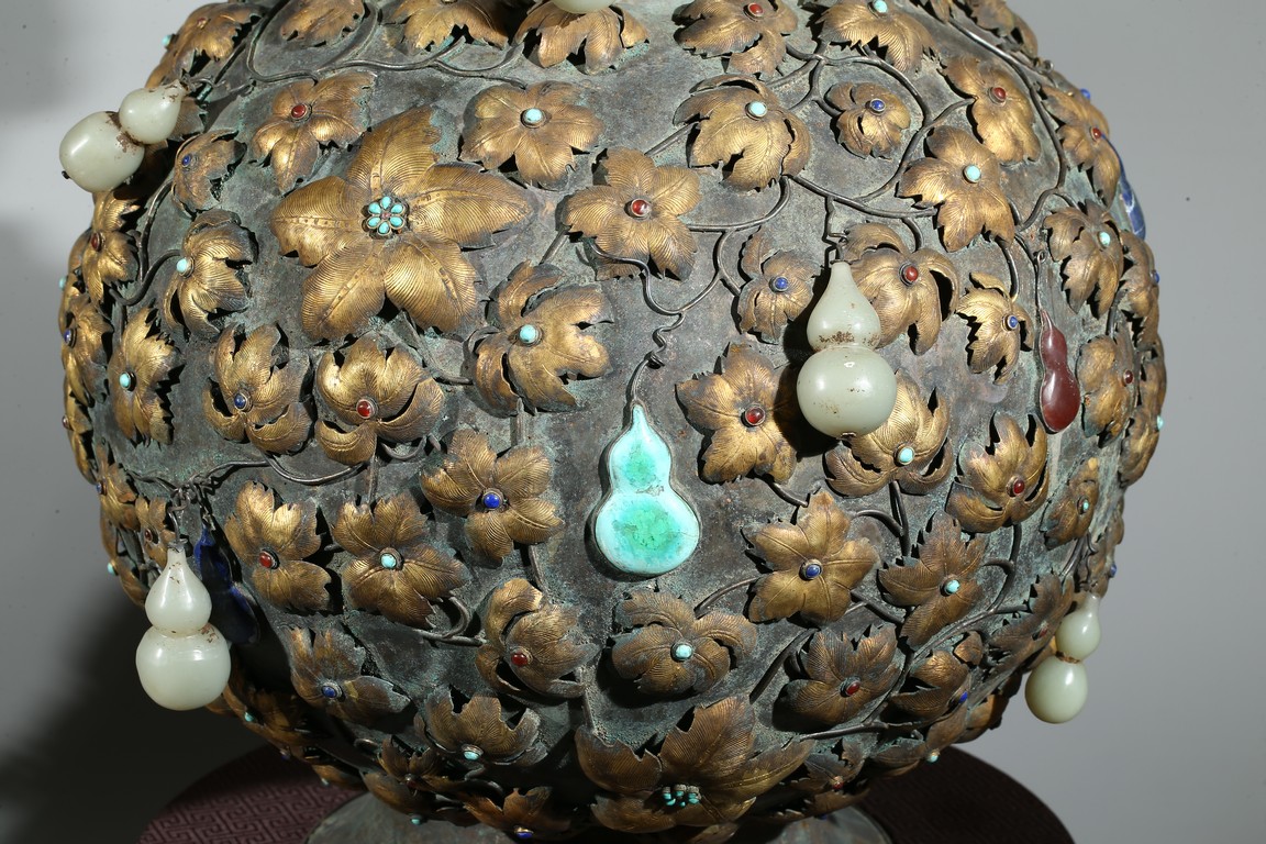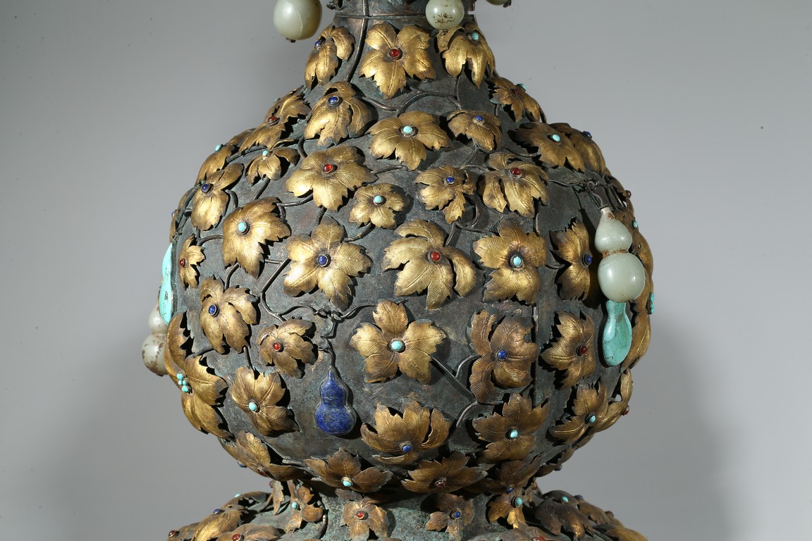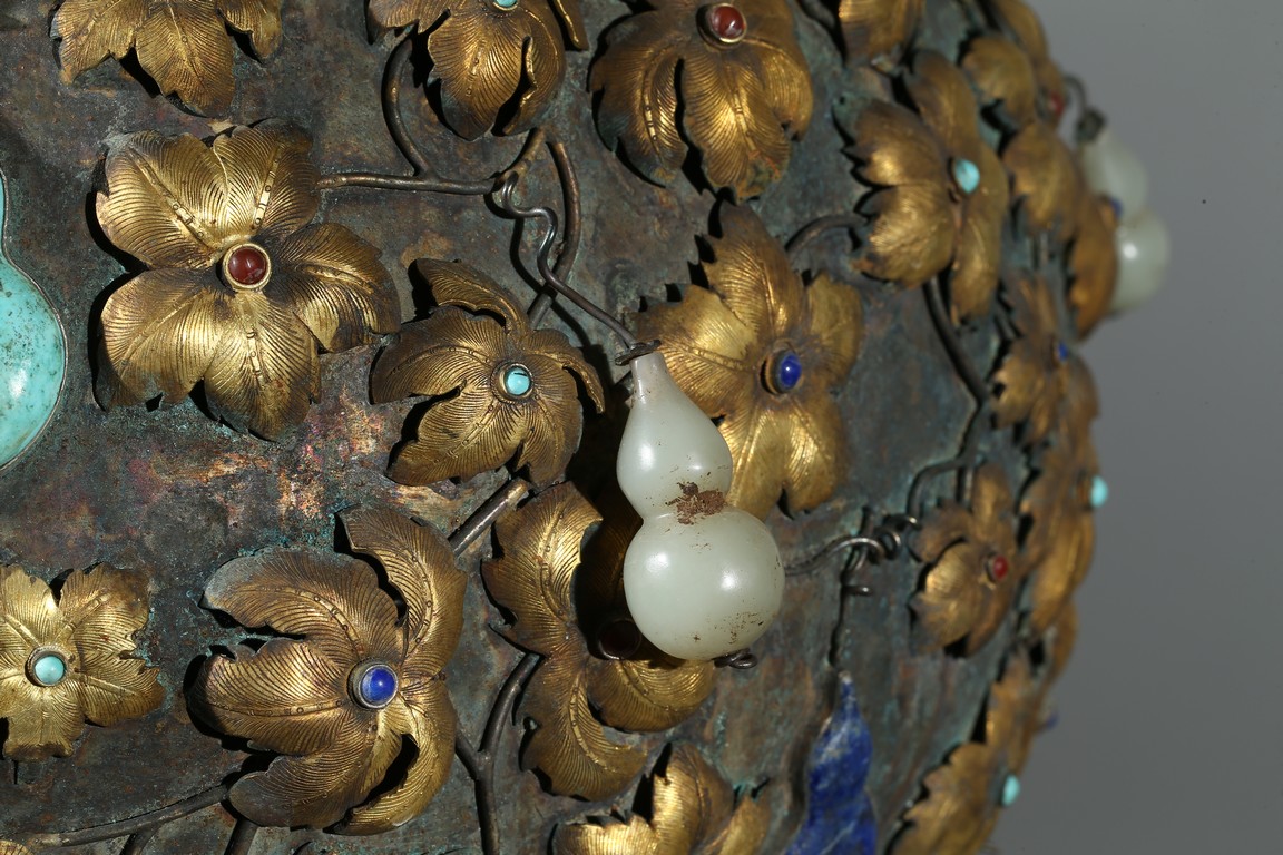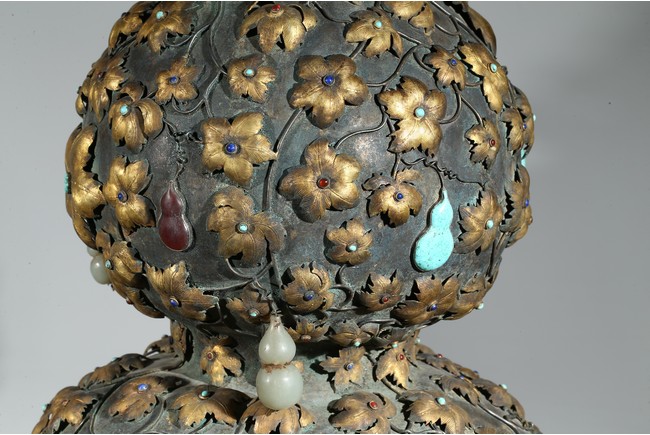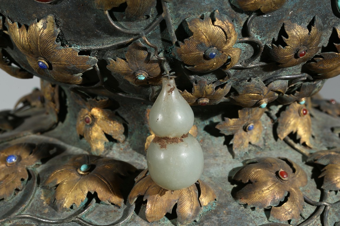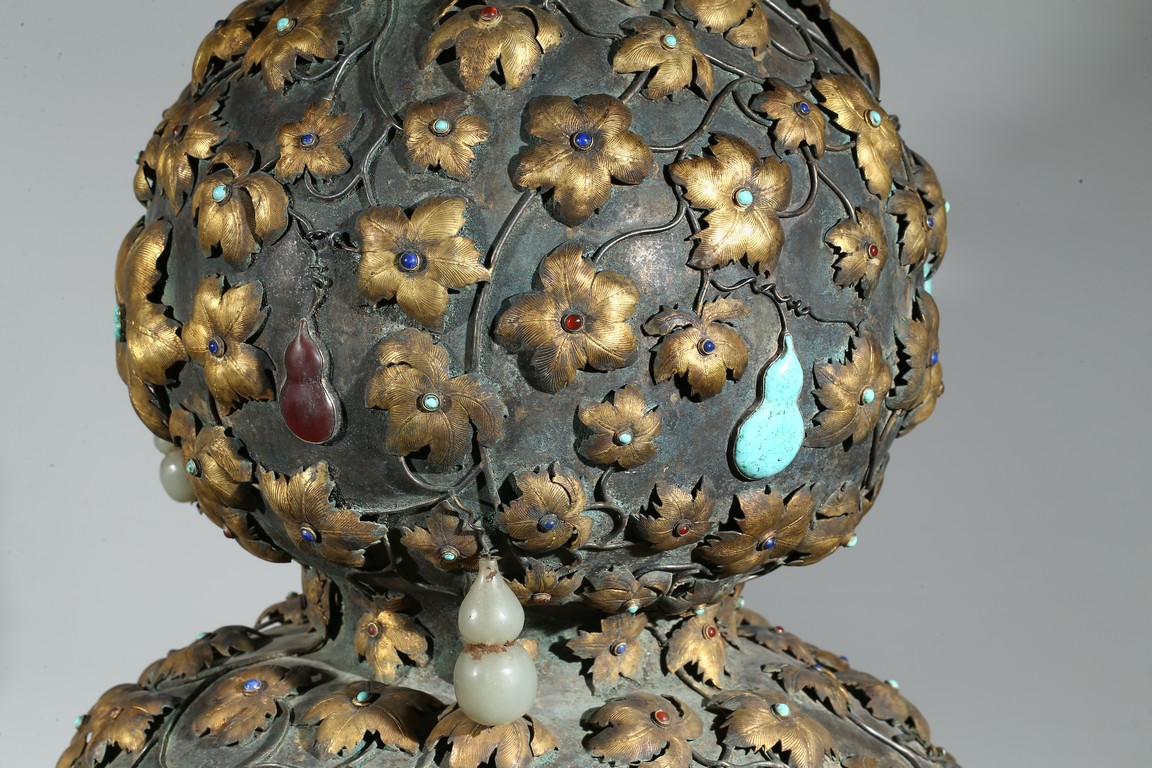 Of double gourd form body and fitted with cover surmounted with gnarled branch, all over decorated with a dense network of gilt-silver star-shaped leaves, scrolling tendrils, and small hanging double gourds in various jades and gems, including turquoise, lapis lazuli, agate, and white jades, all against the silver body, the base incised with six character Qianlong mark flanked by a pair of dragons. Qing Dynasty Qianlong period.