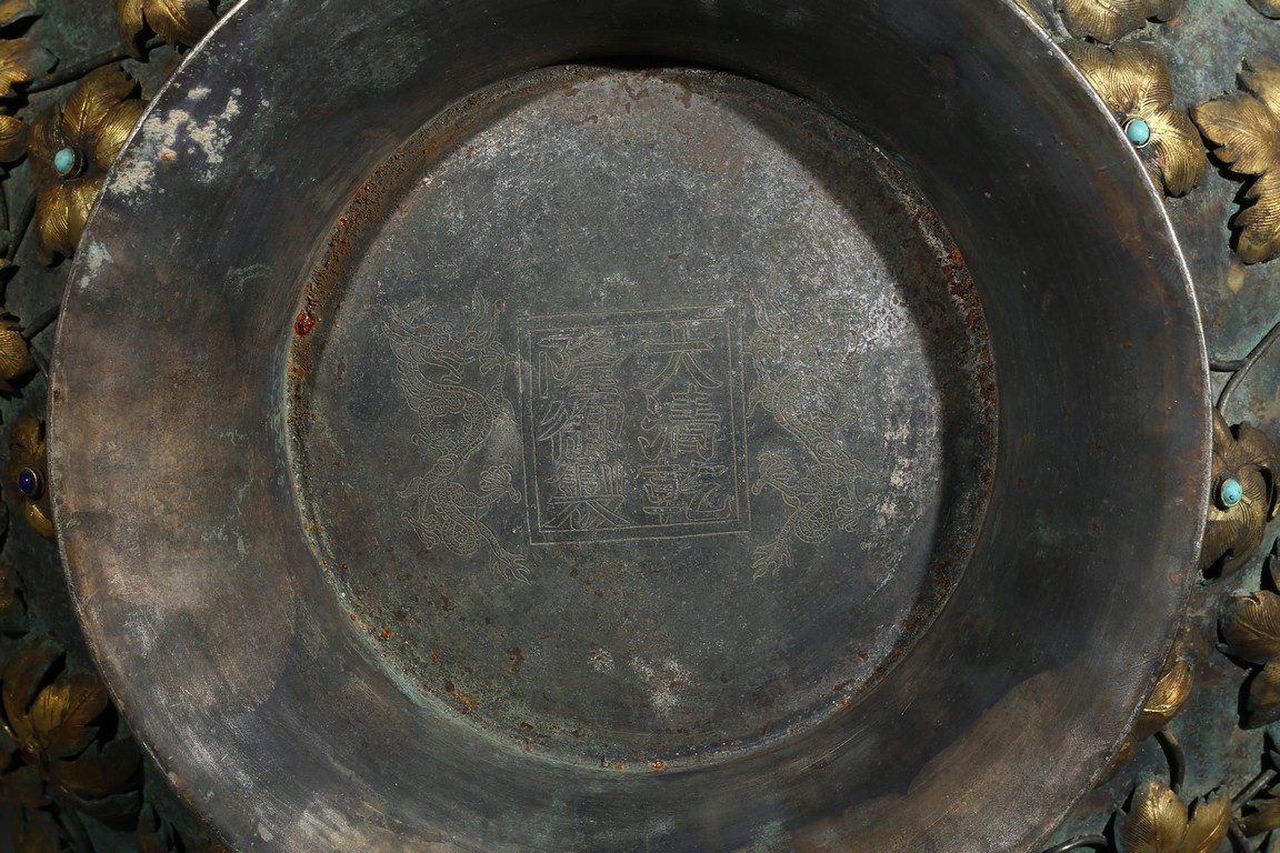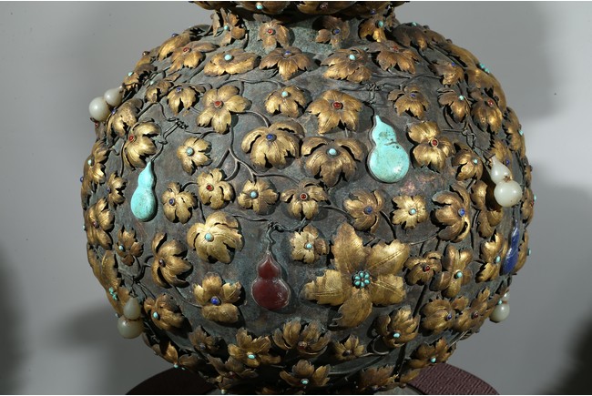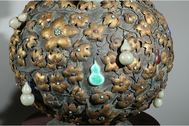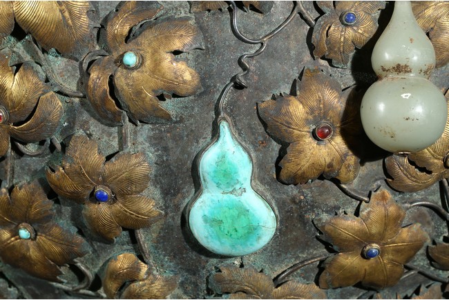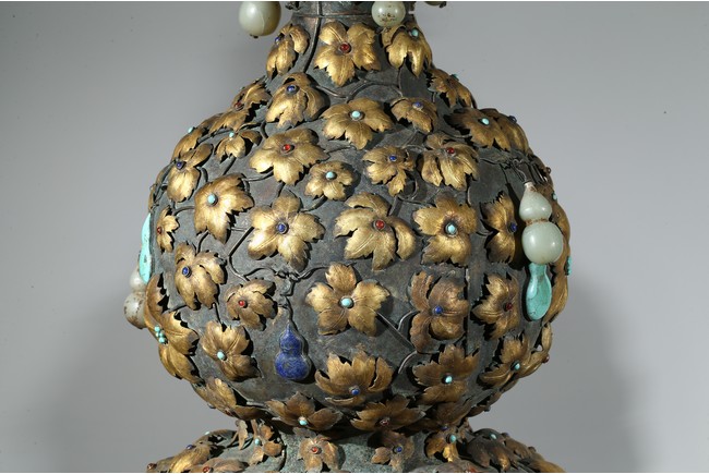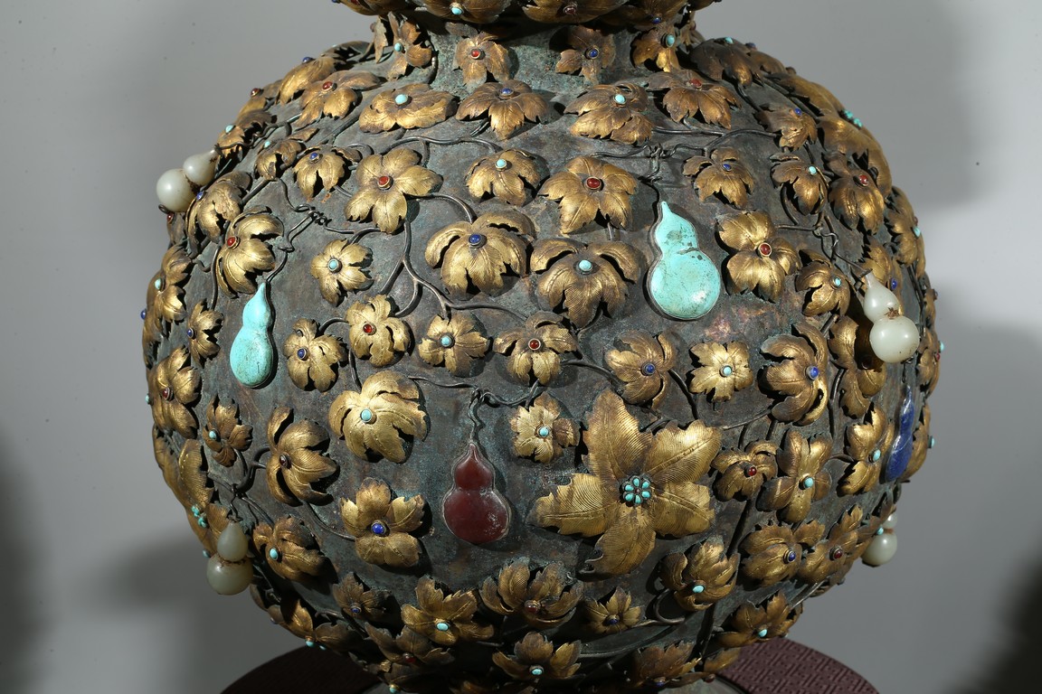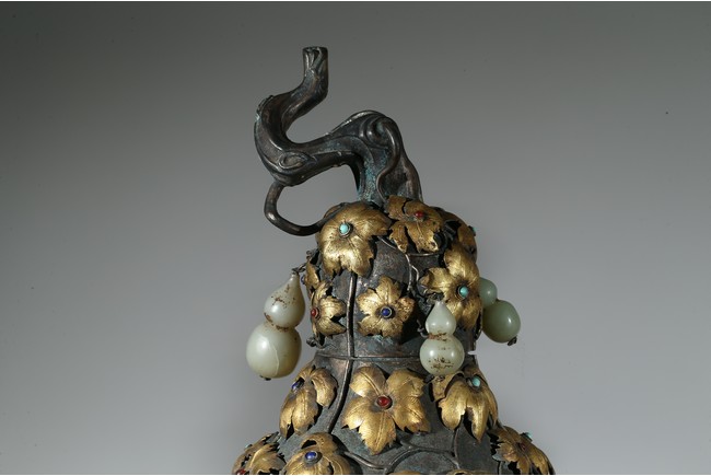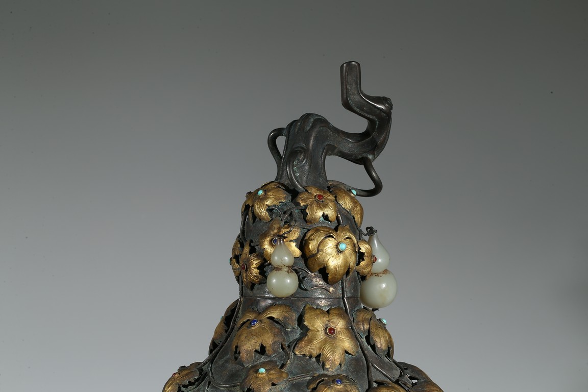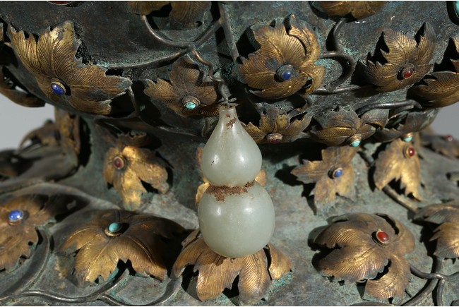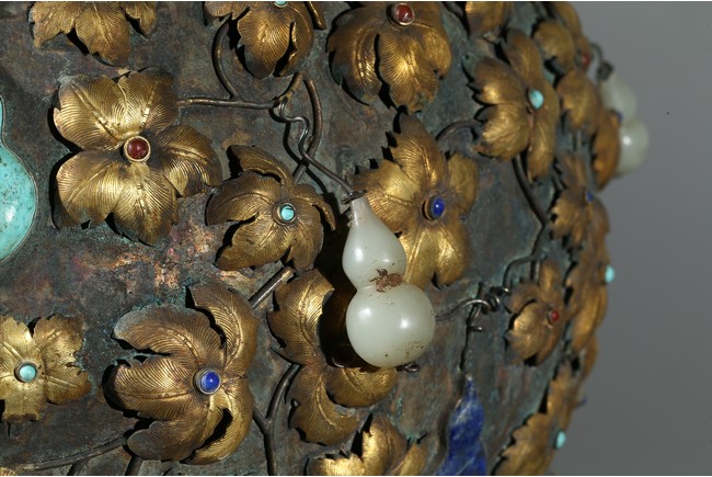 Of double gourd form body and fitted with cover surmounted with gnarled branch, all over decorated with a dense network of gilt-silver star-shaped leaves, scrolling tendrils, and small hanging double gourds in various jades and gems, including turquoise, lapis lazuli, agate, and white jades, all against the silver body, the base incised with six character Qianlong mark flanked by a pair of dragons. Qing Dynasty Qianlong period.