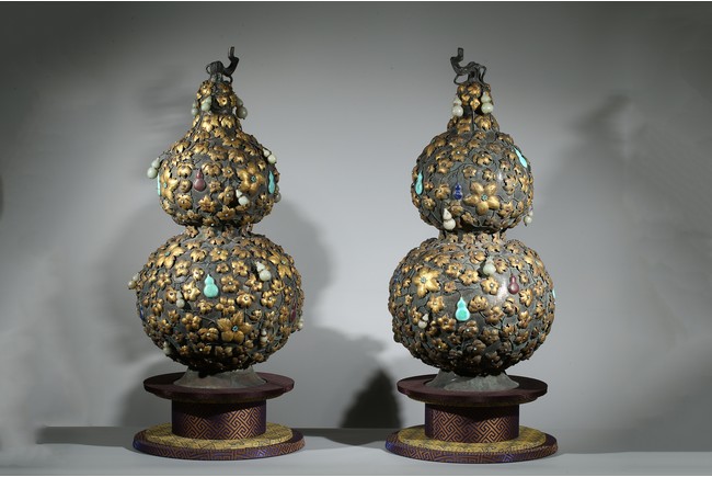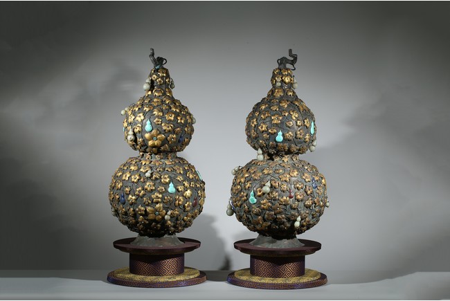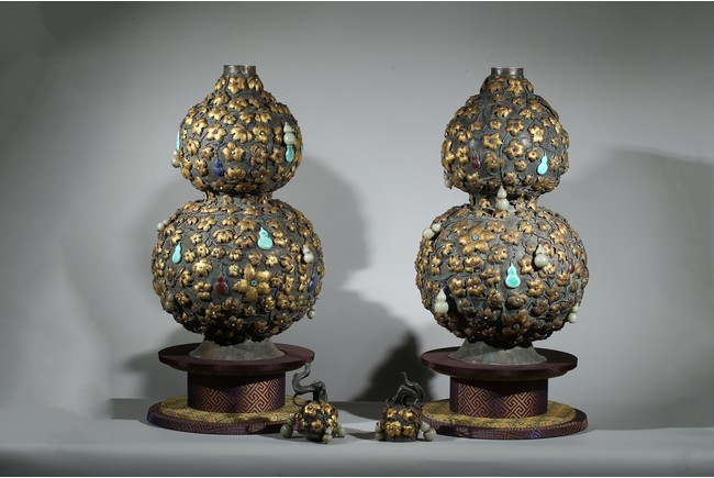 Provenance: Property from an important private collection, New York 葫蘆作為一種吉祥物和觀賞品,它在各項文化藝術品中擁有非凡的地位。《詩·大雅·綿》首句:“綿綿瓜瓞,民之初生”,提及了“葫蘆創世”。瓜,即葫蘆,古時寫作“壺”。古時中國人認為人的整個人生歷程都蘊涵在“三壺”之中。“破壺”(人從瓜出)、“懸壺”(懸壺濟世)、“壺天”(魂歸壺天)。葫蘆因其獨有的外型與特性,又被先人賦予了許多美好寓意:葫蘆,因型似「吉」字,讀音似「福祿」,又多籽,故自古以來便承載起人們希望吉祥如意、福祿雙全、多子多孫的美好心願,清代便將葫蘆瓶作為吉祥用品陳設於宮廷中。據說乾隆是最喜歡葫蘆的皇帝。乾隆時期國力空前強盛,經濟高度繁榮,祈禱吉祥富足也因此成了當時社會藝術的主流,以葫蘆為題材的各式宮廷陳設亦應運而生。《養心殿造辦處內務府堂清冊下存》乾隆六年有提到“銅葫蘆式寶蓋一對接油二件”;《清宮陳設檔案瓷銅玉陳設等賬二本》提到一千六百七十號銅葫蘆一對。本件器物細頸直豎,帶蓋,瓶身中部束腰,不惜用材,體量巨大,造型飽滿,端莊大氣,為銀胎,局部鎏金浮雕花紋,用紅寶石、綠松石等裝點,金色純粹而炫麗,流露出皇家的富貴之氣。其上又用綠松石、白玉等製成葫蘆形狀,與鎏金花紋、銀胎器表搭配,光照之下蓬蓽生輝,閃耀出奪目的光彩。纏枝精細繁複,巧奪天工,線條流暢靈動,亦不失隨性灑脫。因其結構連綿不斷,寓意“生生不息”,故纏枝又稱“萬壽藤”,恰與“葫蘆”世代綿延的寓意相契合。整器碩大無比、不惜用料、用料考究、寶光炫目、金碧輝煌、做工精美細緻、成對保存,為十分罕見的宮廷造辦處藝術珍品。底部“大清乾隆御製”方款識。兩條飛龍飛舞左右,龍身矯健,威武霸氣,活靈活現。兩岸故宮藏有類似紋飾和形制的葫蘆陳設器具,且所用材料豐富,有瓷質、玉器、銅製、掐絲琺瑯以及各式鑲嵌座屏掛屏等,然而銀胎製作少之又少,極其罕見。類似器物可參閲:保利香港2019年春季拍賣會(十面觀止—十面靈璧山居甄藏歷代名瓷)3514號拍品,成交價(HKD34220000)。英國亞瑟王子舊藏,清乾隆銅胎掐絲琺瑯「子孫萬代」圖葫蘆瓶一對,售於香港蘇富比,2012年10月9日,編號3031。日本川崎家族收藏清乾隆琺瑯嵌玉大吉葫蘆瓶, 售於北京保利,2009年11月24日,編號3274。 來源: 紐約重要私人藏家收藏 Provenance: Property from an important private collection, New York