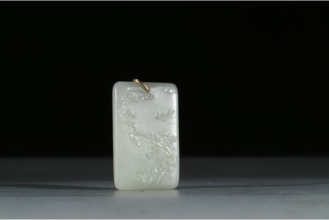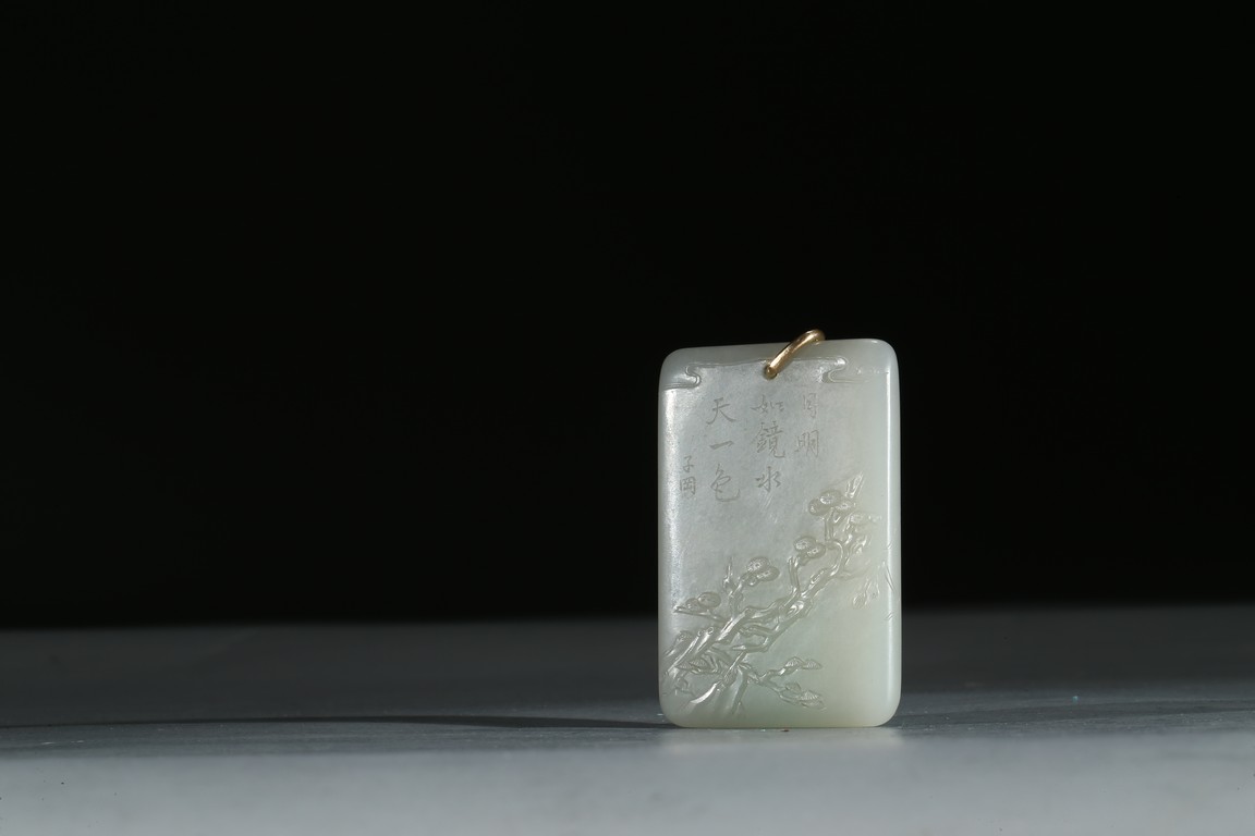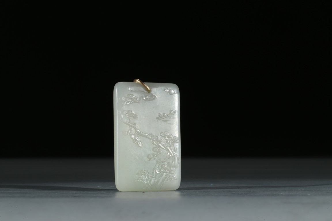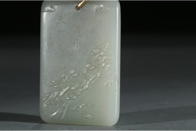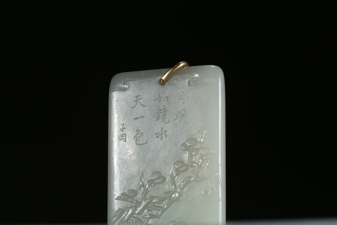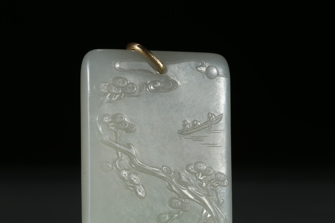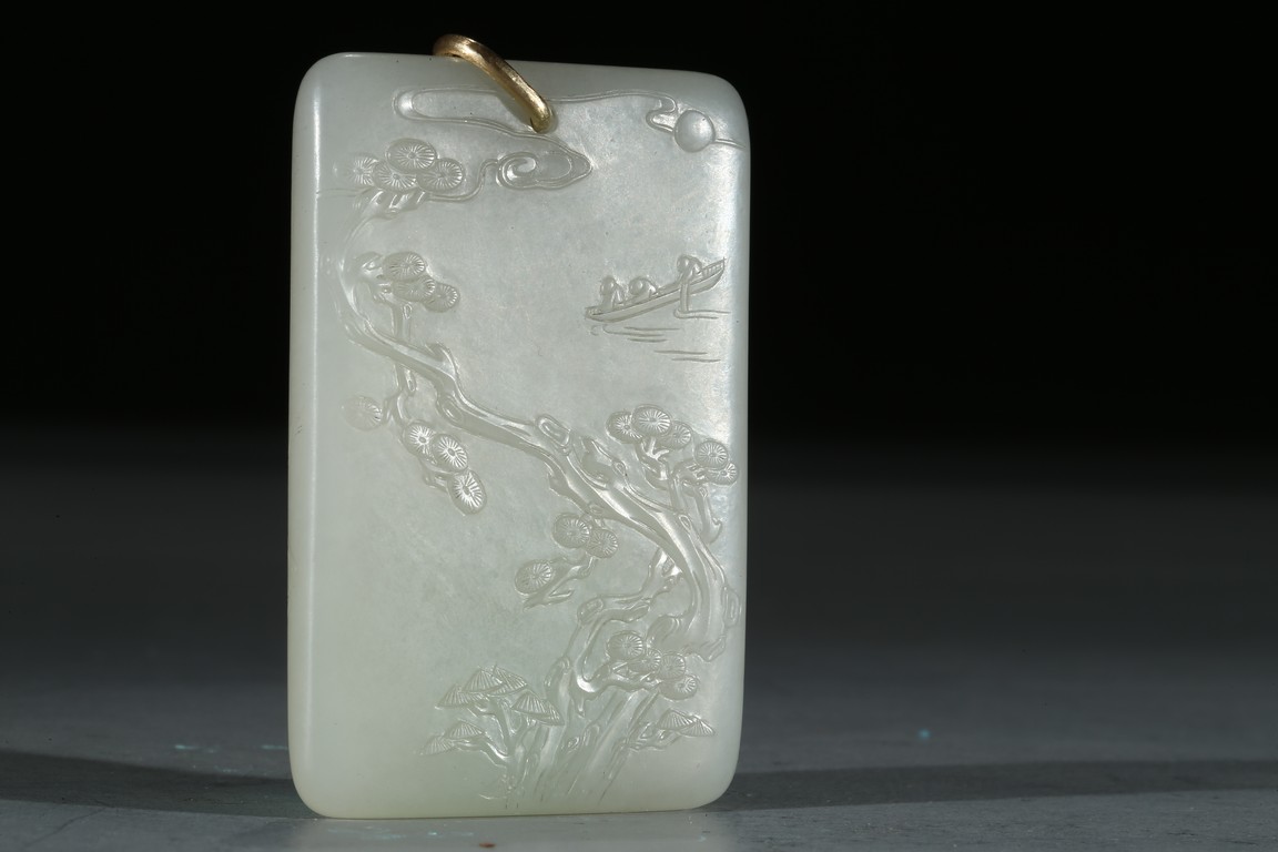 和闐白玉,緻密溫潤,包漿肥厚。牌呈扁平長方形。牌首琢一小孔,可以穿系。一面雕松樹,松下有童子划船於水面之上;另一面刻“月明如鏡水天一色”“子岡”。陸子岡為明嘉靖、萬曆年間,蘇州琢玉名師,技藝高超,被譽為“吳中絶技”。