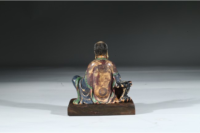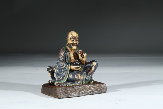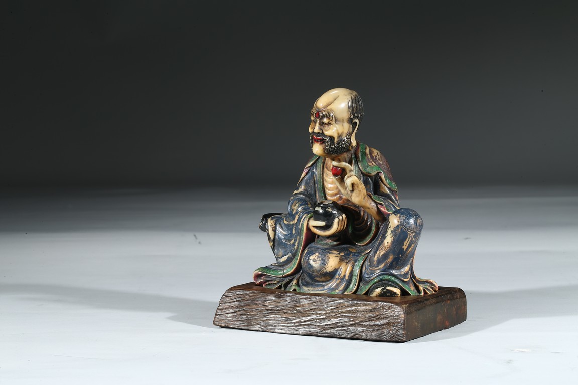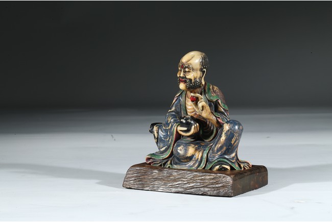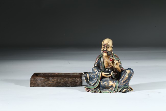 Shown seated with left knee raised, wearing large robe, one hand holding alm bowl, hems incised with floral scroll, bearded face with smile expression, overall painted in pigments.