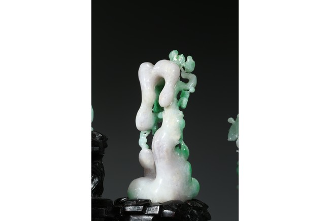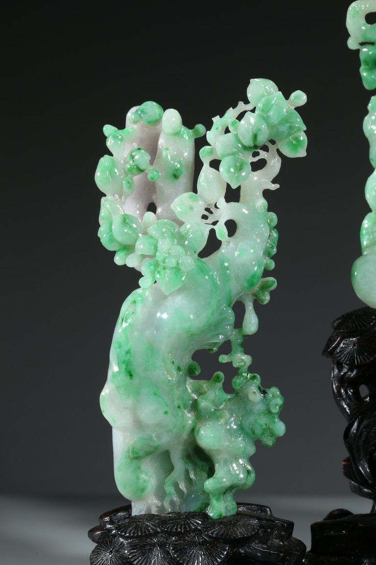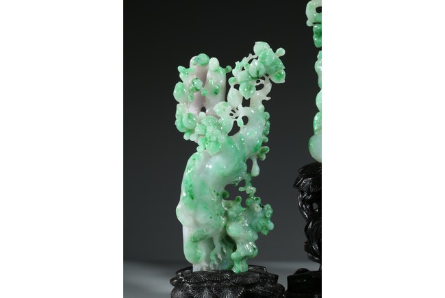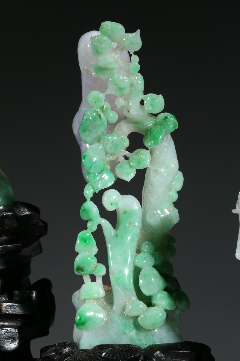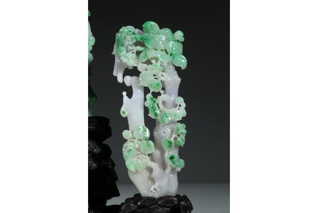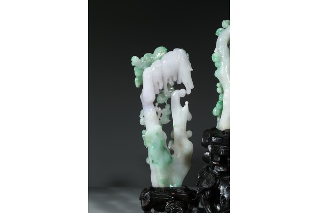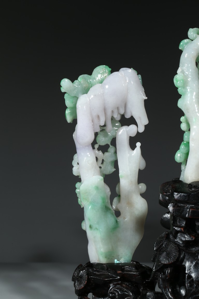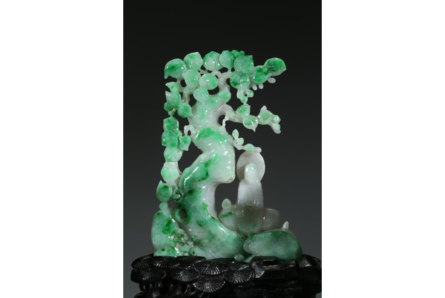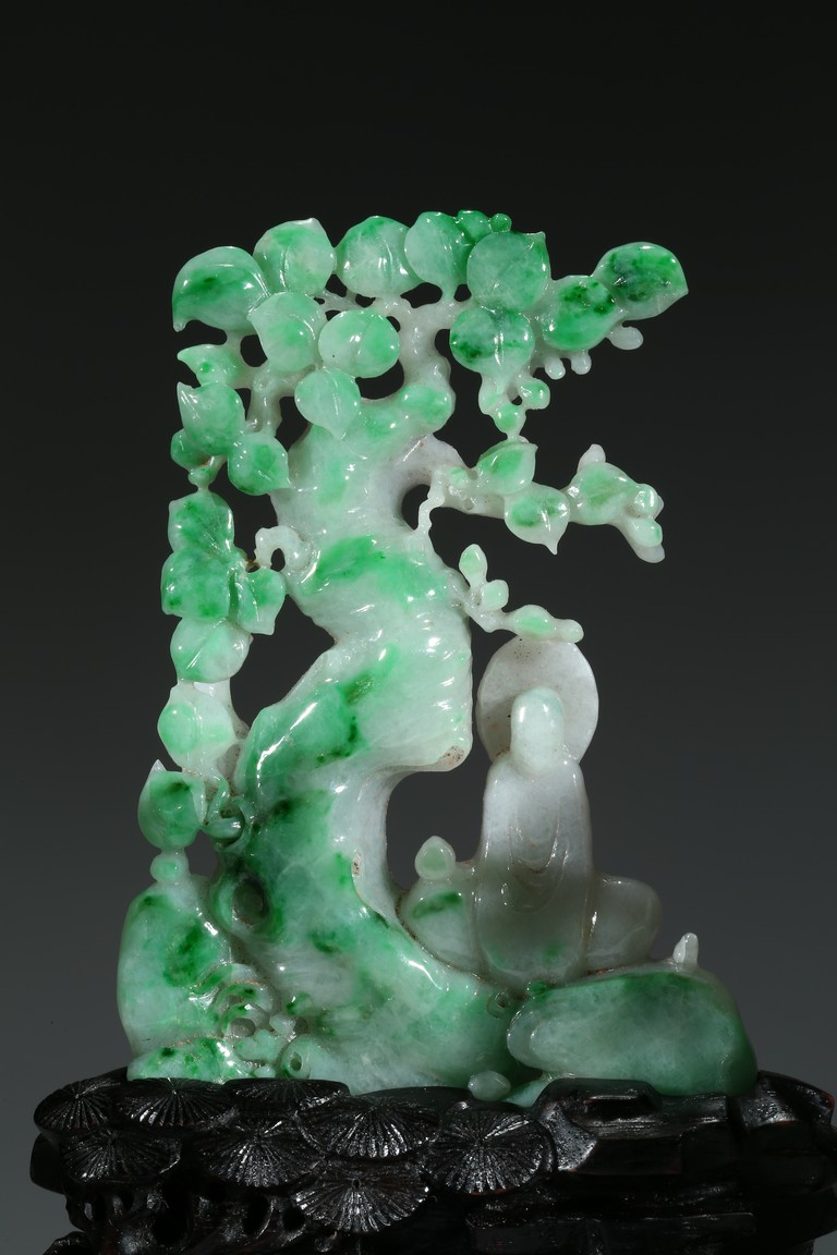 翡翠大量開採的時間不長,約有600多年的歷史。不完全記載,翡翠傳入中國至少早在漢朝,小批量是在明朝,明、清兩代,翡翠工藝品在中國流行。今時,翡翠已經成為玉中之王,尤其綠色翡翠昕昕然價格高啟,玉王丰采已經不是其它玉種可比,軒堂下的人們以擁有上品種色俱佳的翡翠為收藏保值之首選。本次拍品佈局合理,所雕翡翠桃樹刀工精細,層次分明,佛像雕刻莊嚴栩栩如生。翡翠用料上乘,包漿厚實,底座為硬木。