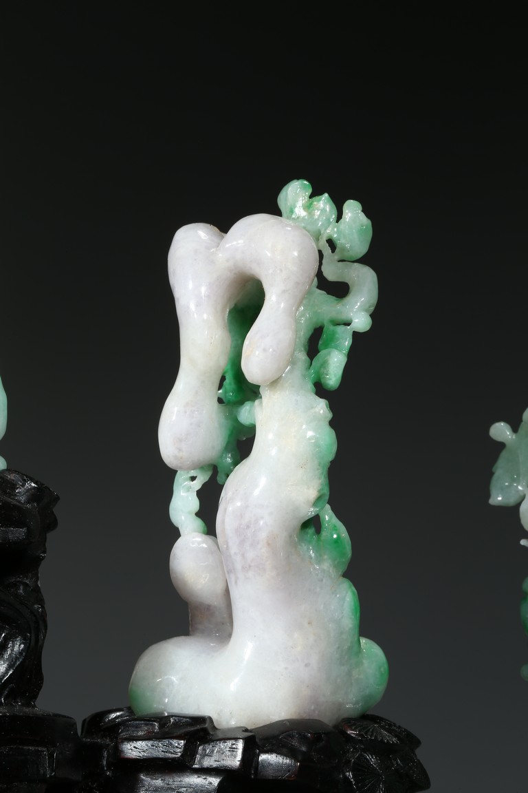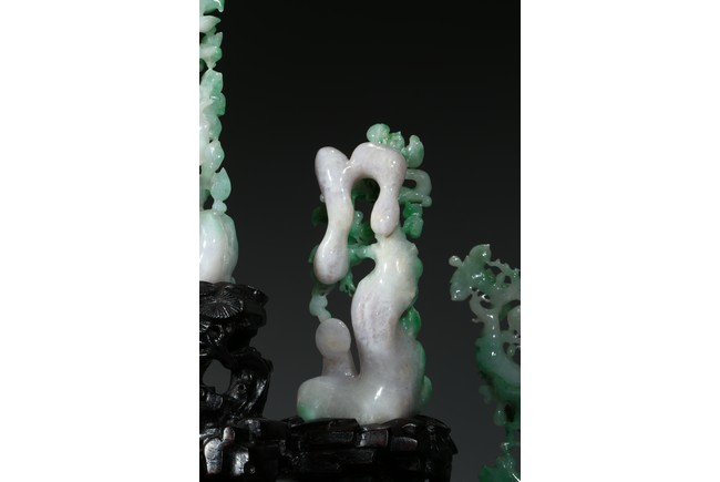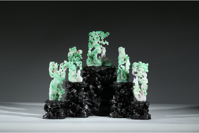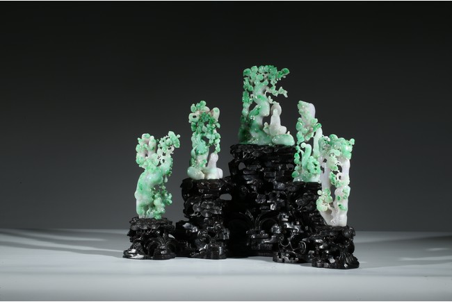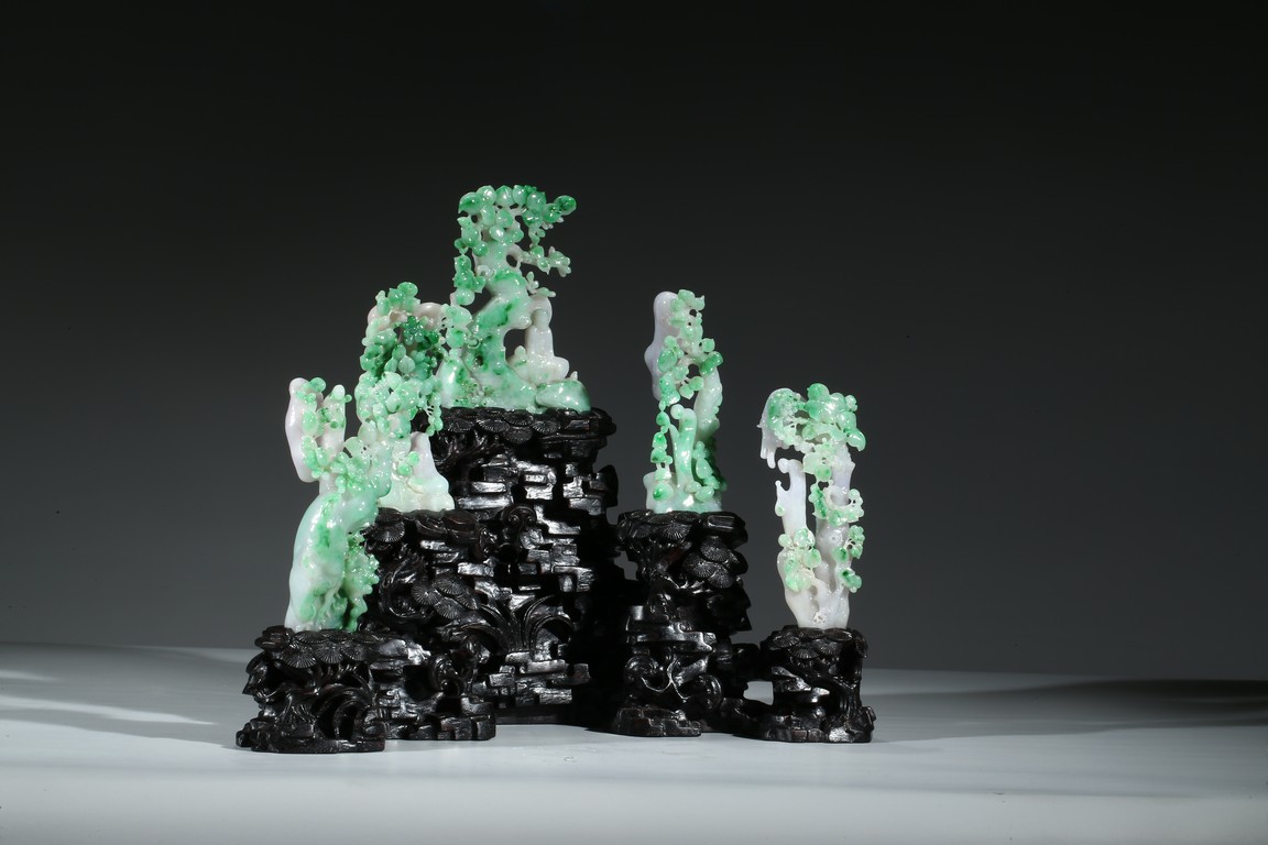 Finely carved with five green jadeite groups of fruit trees and monk figures, all supported on a wood stand. Late Qing Dynasty period.