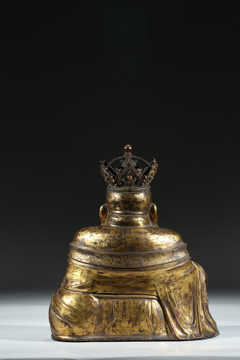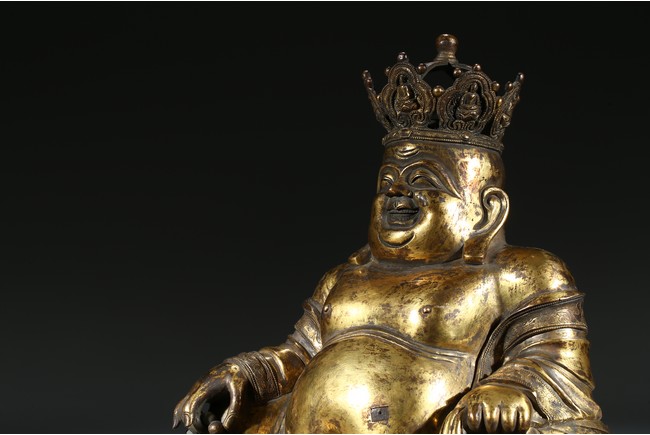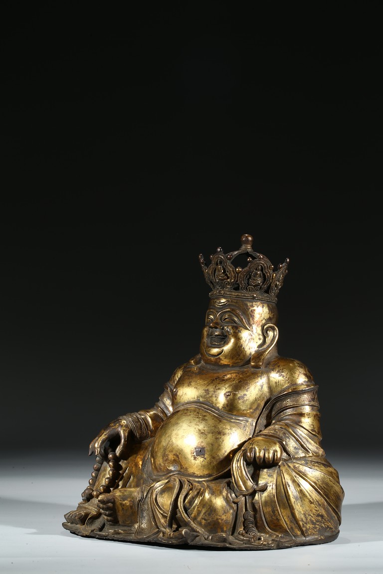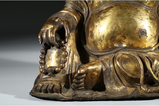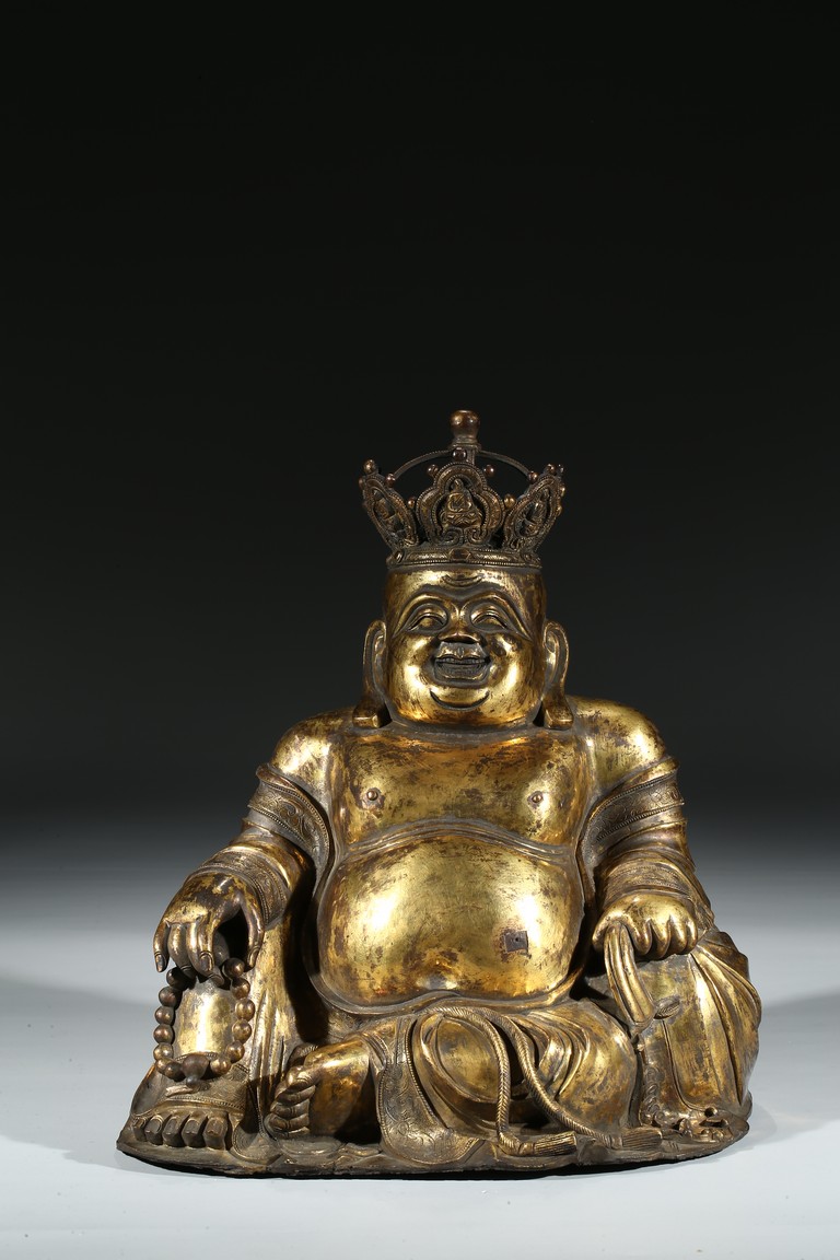 Provenance:Property from a private collection, Toronto, Canada 此造像莊重美觀,鎏金潤澤燦亮。彌勒佛造像慈祥滿面,神態可敬可親。通身素雅簡飾,著廣袖長衣,袒胸露乳,赤足曲肱而坐,右手握佛珠,人物憨態可掬而不失佛家風範。衣紋線條清晰流暢,用線力度適宜。手指、腳趾動態柔軟如流水,其肥厚之感凸顯,符合彌勒佛中原“肥胖”的形象。關節、指甲如實表現,體現匠人的功力。此彌勒佛眼睛笑眯眯,彎如新月,寬闊的鼻頭、咧嘴而笑,嘴角上揚,耳珠肥碩,下垂至肩。寬圓的前額上起皺,細節處理尤為精采。此尊彌勒佛頭戴五葉華冠,這與慣常的禿首的形象相比較為少見。 來源: 加拿大多倫多私人藏家收藏