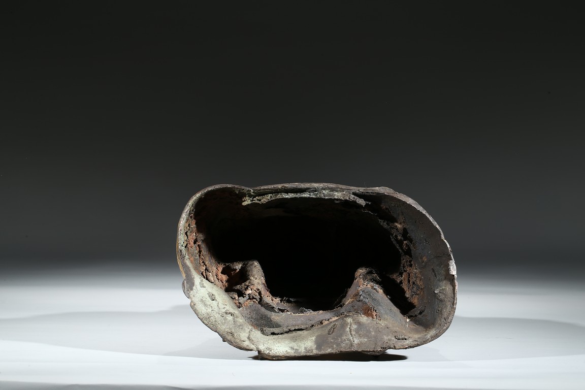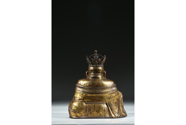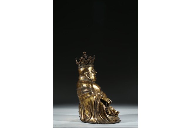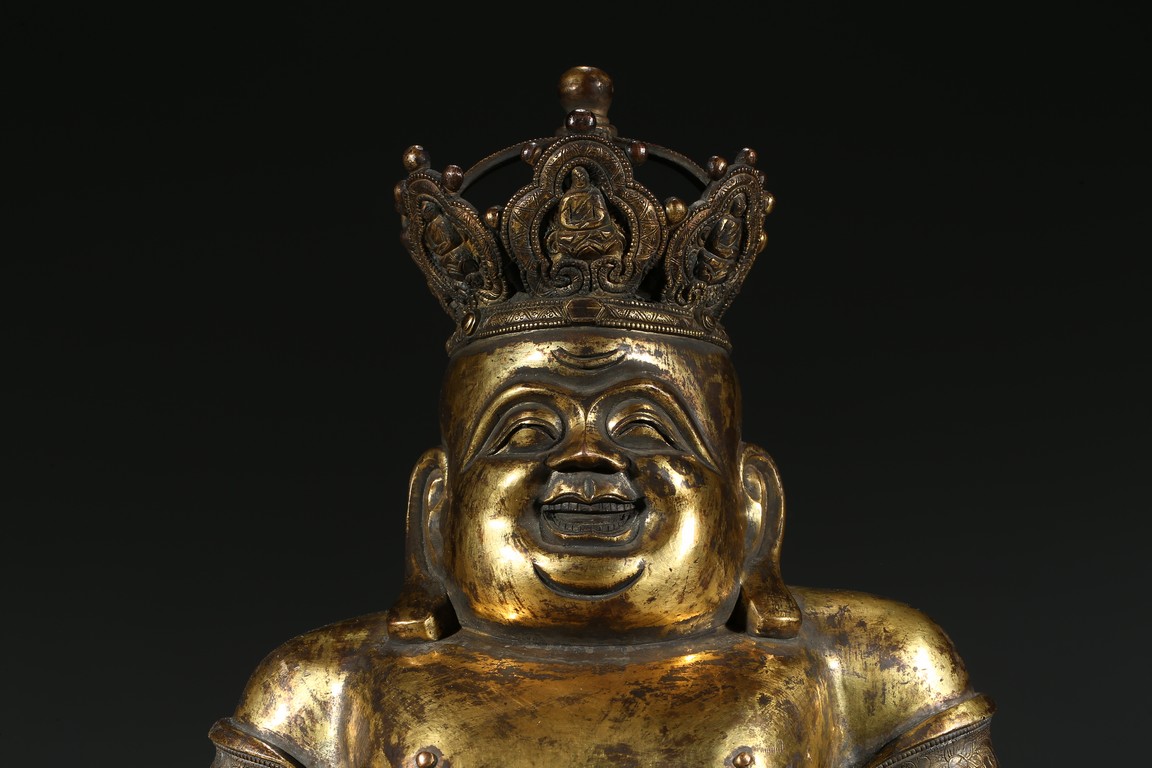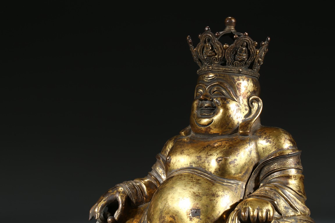 Provenance:Property from a private collection, Toronto, Canada 此造像莊重美觀,鎏金潤澤燦亮。彌勒佛造像慈祥滿面,神態可敬可親。通身素雅簡飾,著廣袖長衣,袒胸露乳,赤足曲肱而坐,右手握佛珠,人物憨態可掬而不失佛家風範。衣紋線條清晰流暢,用線力度適宜。手指、腳趾動態柔軟如流水,其肥厚之感凸顯,符合彌勒佛中原“肥胖”的形象。關節、指甲如實表現,體現匠人的功力。此彌勒佛眼睛笑眯眯,彎如新月,寬闊的鼻頭、咧嘴而笑,嘴角上揚,耳珠肥碩,下垂至肩。寬圓的前額上起皺,細節處理尤為精采。此尊彌勒佛頭戴五葉華冠,這與慣常的禿首的形象相比較為少見。 來源: 加拿大多倫多私人藏家收藏
